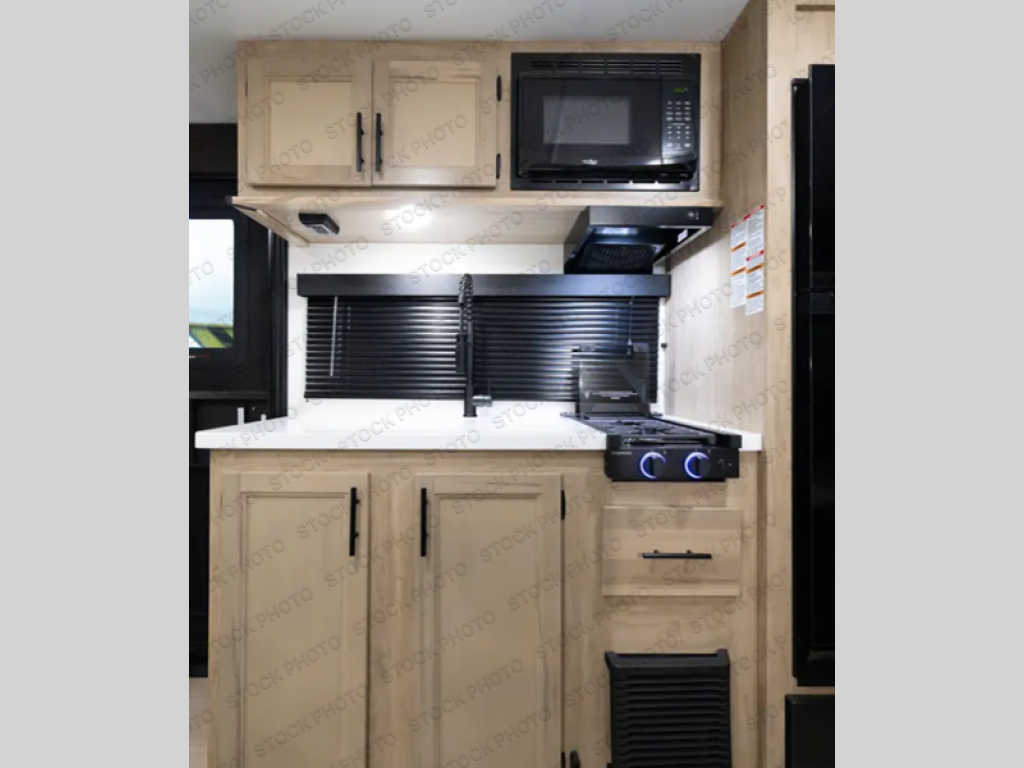 The whole family can sleep comfortably in this travel trailer! It has a set of bunk beds for the kids or guests to sleep on, and you can sleep comfortably on the front queen bed with overhead cabinets and a shelf. There is even an exterior storage plus door that accesses the storage space under the bottom bunk. The chef will enjoy preparing their best home cooked meals either indoors with the cooktop or at the outside mini kitchen while staying protected by the 12' power awning!