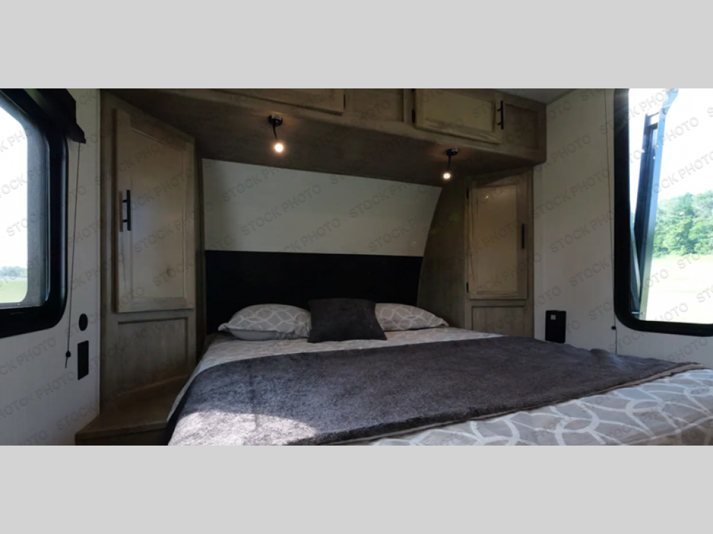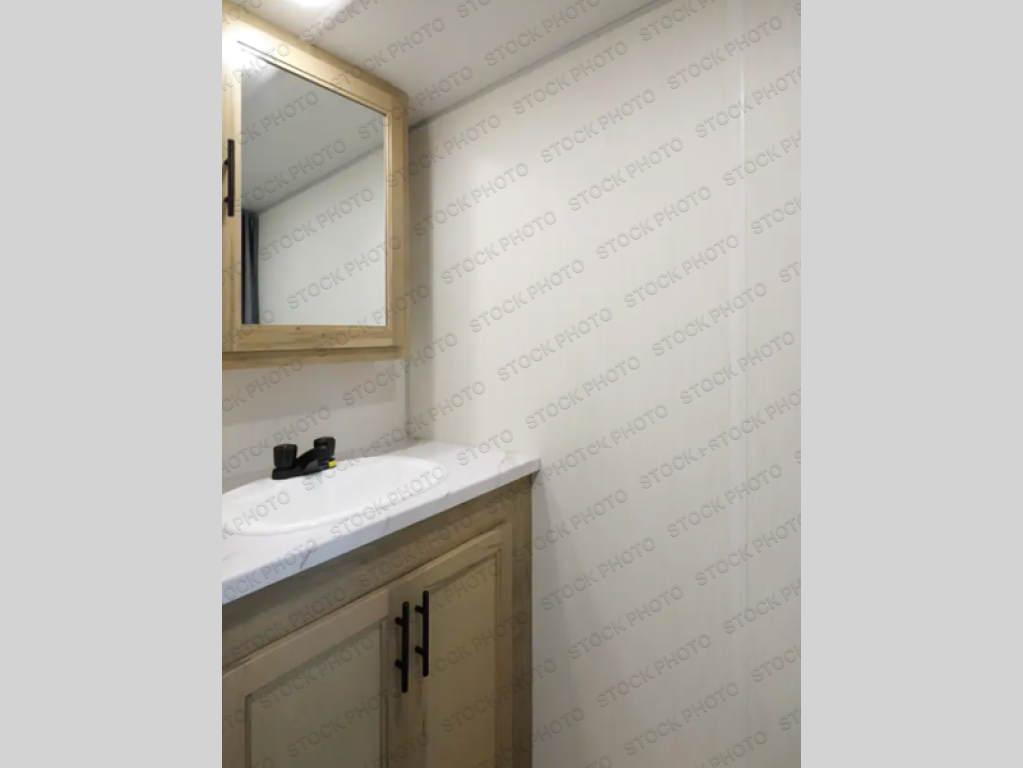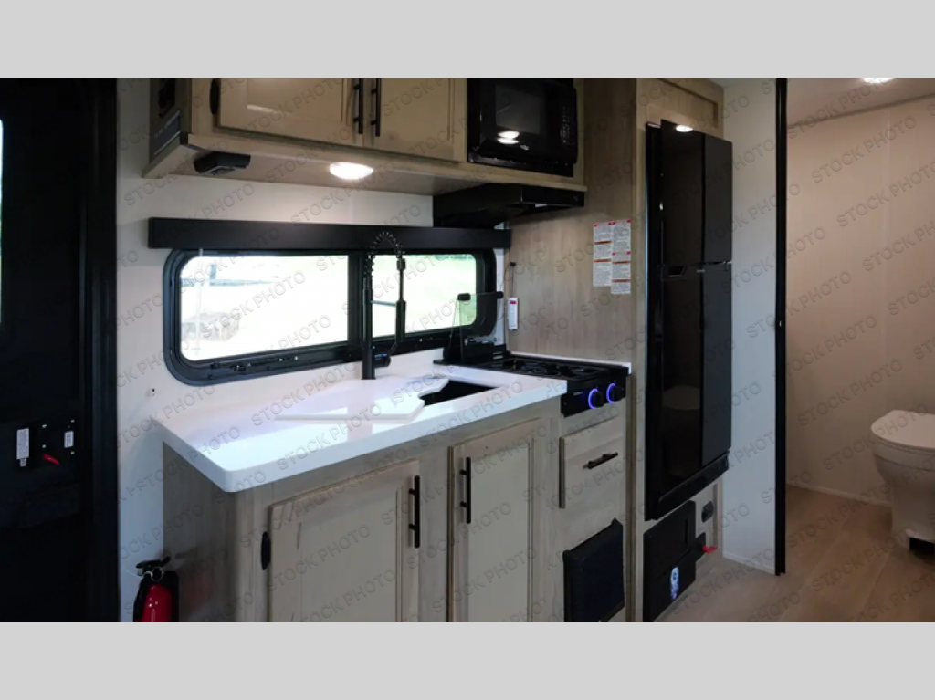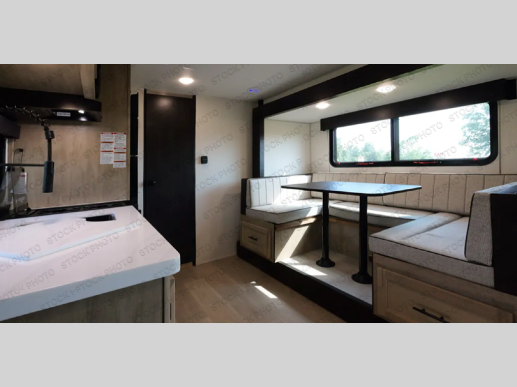 This travel trailer is perfect for a small family or group to enjoy since there is a front queen bed for you and a U-shaped dinette for guests. The kitchen provides a microwave oven, round single bowl sink, a range for cooking, and a refrigerator to keep all of your perishables fresh. The rear bath features a tub/shower, toilet, and vanity with a sink, plus a medicine cabinet to keep things tidy.