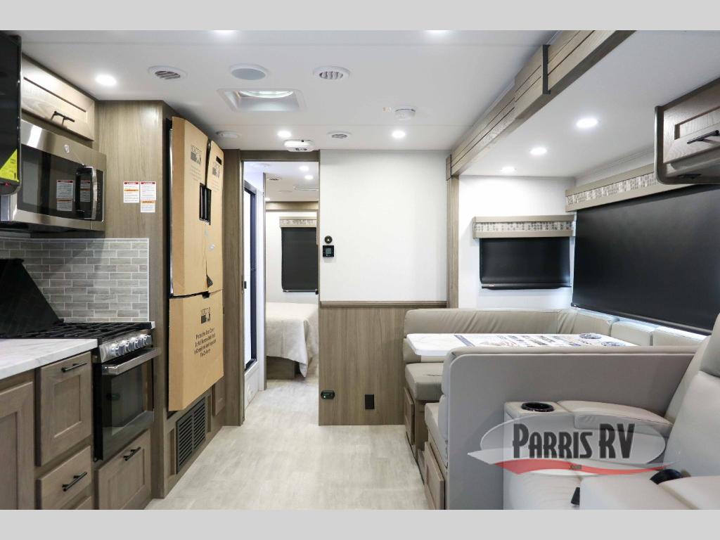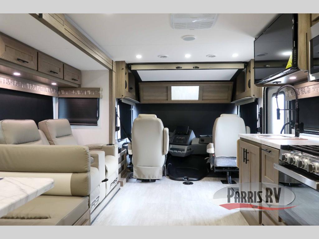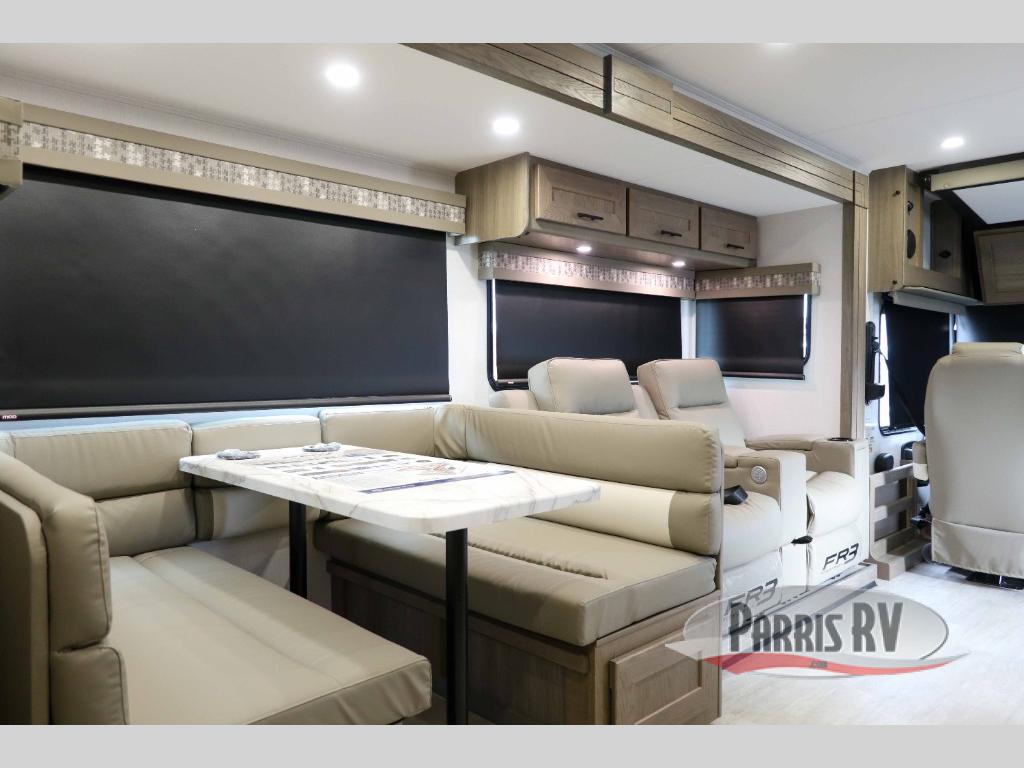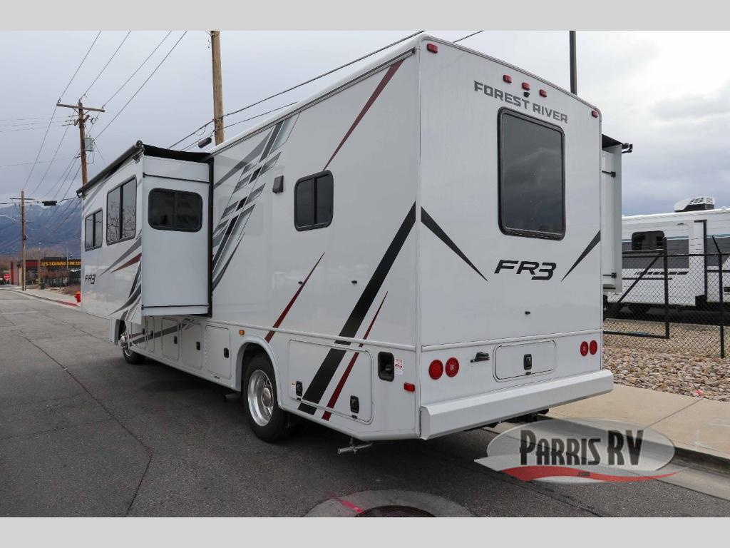 With each FR3 Class A gas motorhome by Forest River, you will find an easy-to-drive coach with a spacious interior allowing you to gather with friends and family with convenience and style found throughout! Each is built with vacuum-bonded construction, a one-piece fiberglass roof with extended rain spouts, a steel firewall and A-pillar extension, Bi-LED headlamps and lower LED fog lights, and grey Rotocast storage boxes with drains, plus more! Inside, you will enjoy black hardware, appliances, plumbing fixtures, and a glass shower door frame. Plus, you will also find a stainless steel kitchen sink with a bamboo cutting board and roll-up dryer, heavy-duty full-extension ball bearing drawer guides, dual-access dinette storage with doors, and nightstands with charging stations to keep your cellphones ready for whatever is next. Make your selection today!