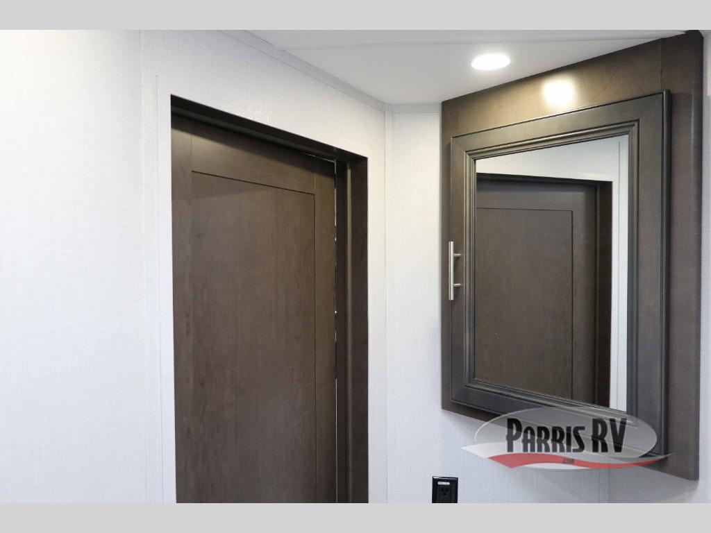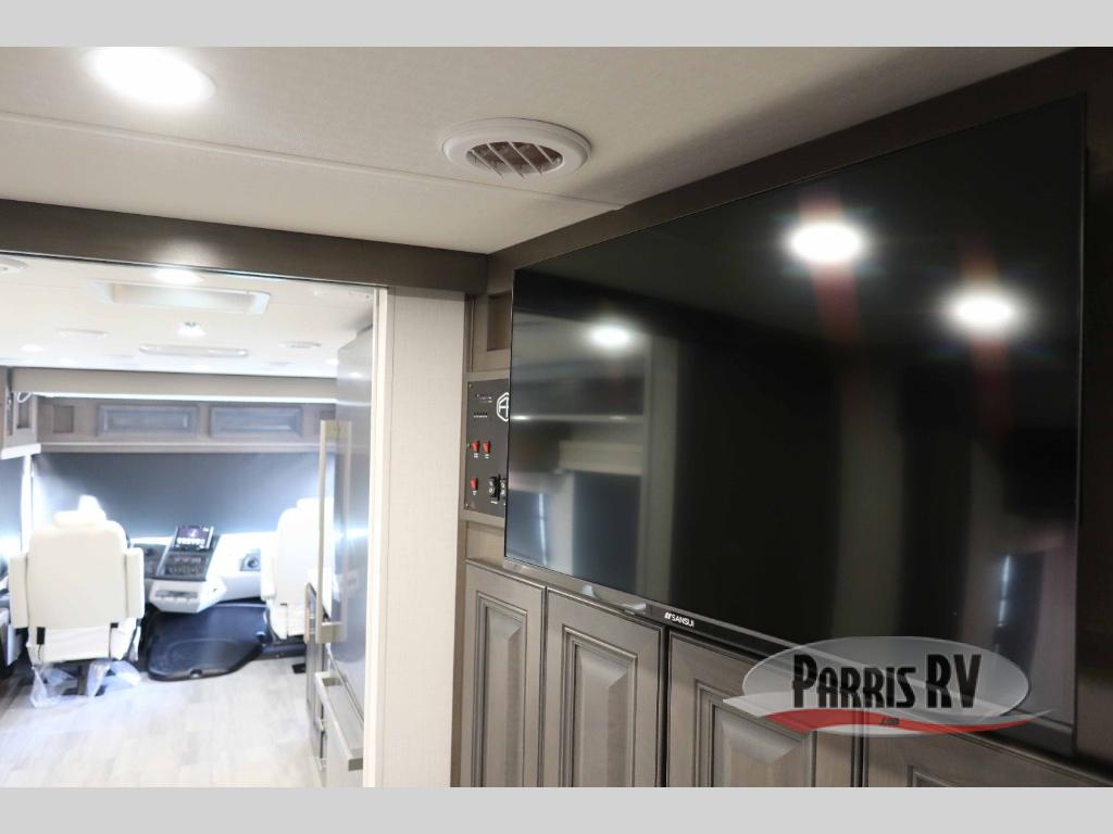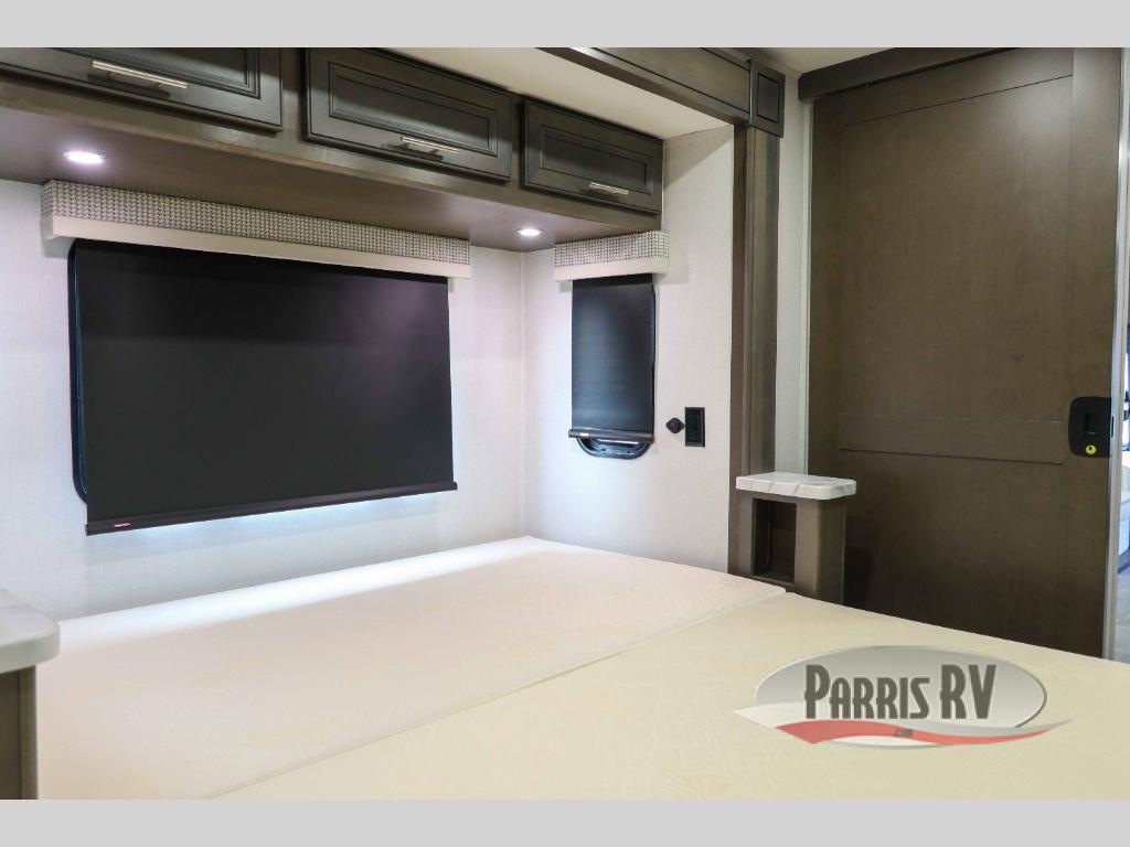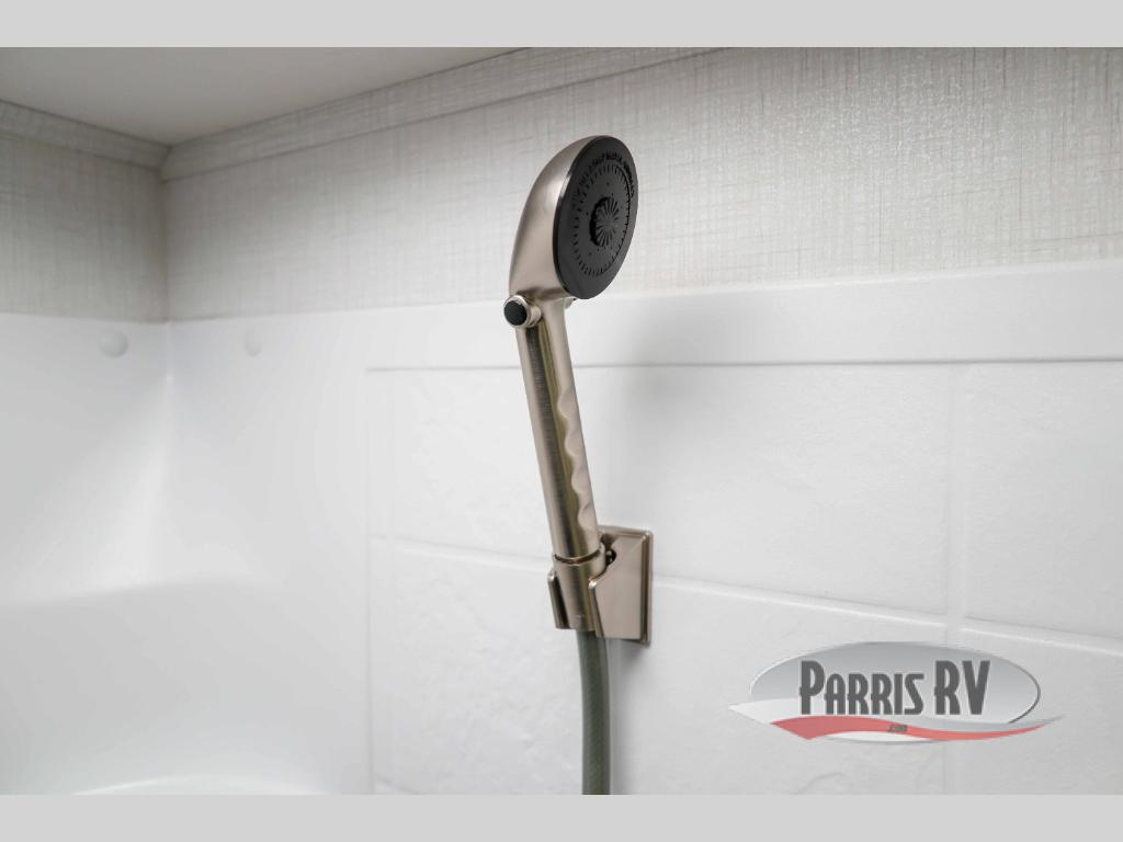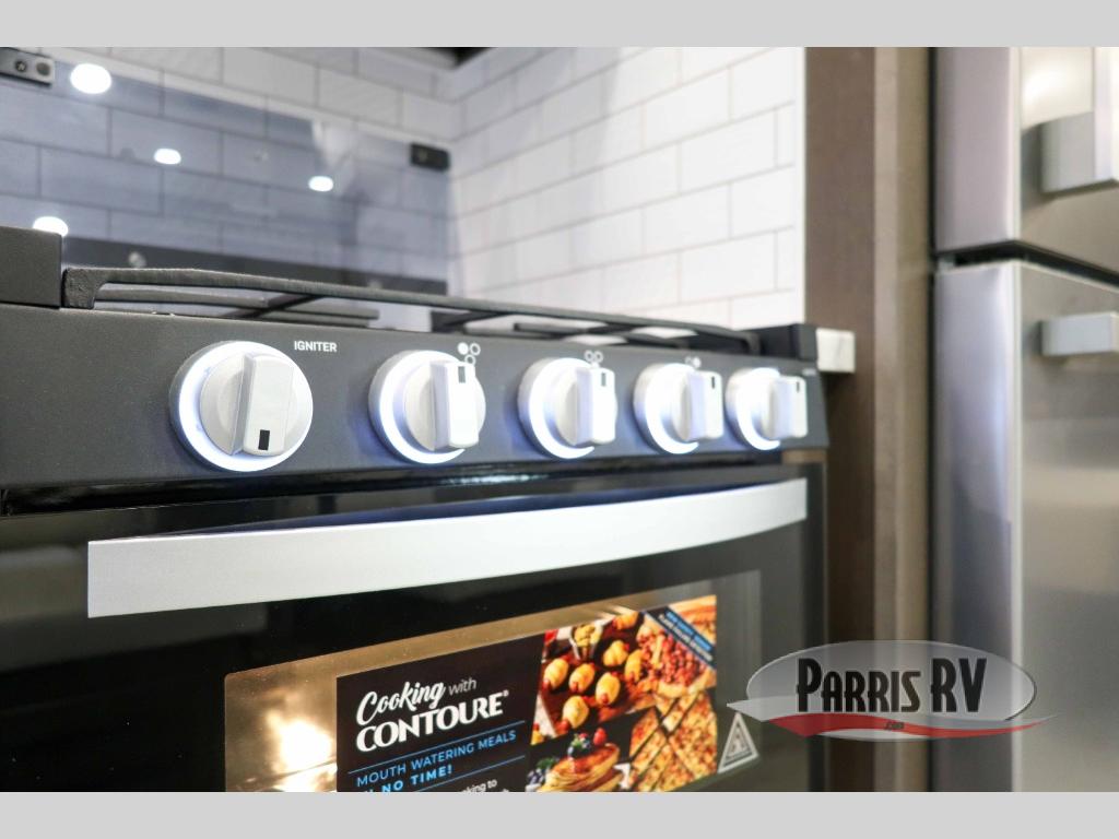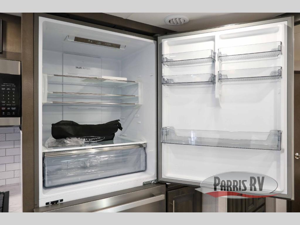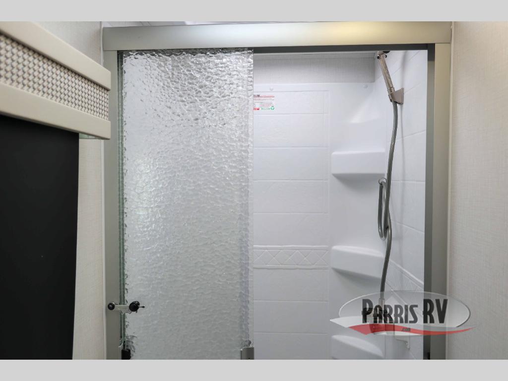 This motorhome is more than just a couple's coach; It's a home on wheels with room for you and even some guests to embark on great adventures. The hide-a-bed sofa and Dream Dinette slide not only offer comfortable places to eat meals and relax but also transform into extra sleeping spaces. You will have your own privacy in the rear master bedroom with a queen bed slide and even a fireplace over the 32" LED Smart TV to enjoy movies in the warmth of this room on those chilly nights. The master bathroom gives you all the comfort you need just a few steps from your bed so you can take a shower and easily get changed. The chef can keep everyone's bellies full of delicious meals with the three-burner cooktop, the stainless steel residential refrigerator, and the pantry with shelves, plus there is a stainless steel microwave for popcorn on movie night!