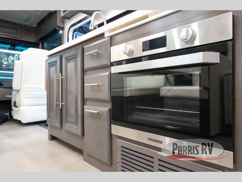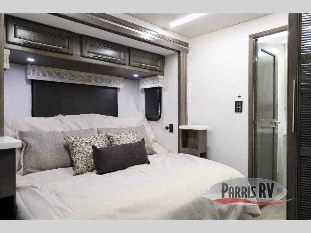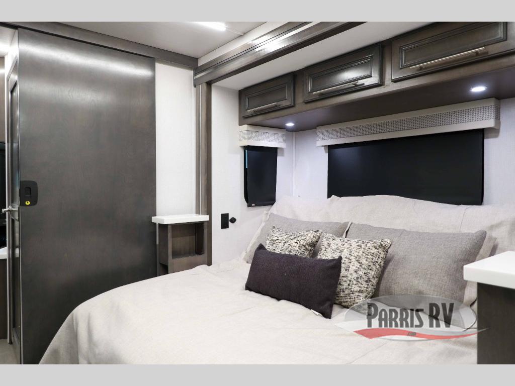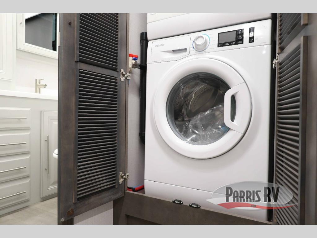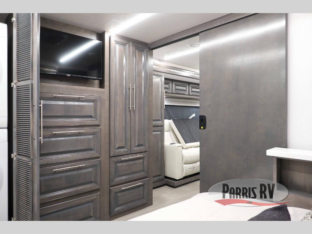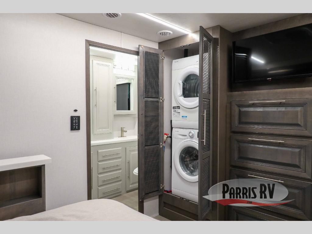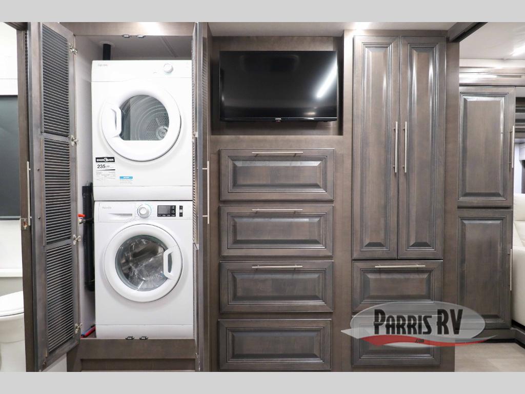 Comfort and convenience are found all throughout this motorhome! Starting with the full rear master bath that has a shower with a seat and a dual sink vanity, plus it leads into the private bedroom. Inside the bedroom is a 72" x 80" king bed slide with overhead cabinets across from a dresser with overhead cabinets and a 32" LED TV, a wardrobe, and another wardrobe that is prepped to add an optional stackable washer and dryer. The half bathroom is conveniently near the fully equipped kitchen so you can get back to creating your best home cooked meals fast. Relax in true comfort each night by either playing games at the booth dinette or on the theater seating that comes with power recline, heat, and massage!