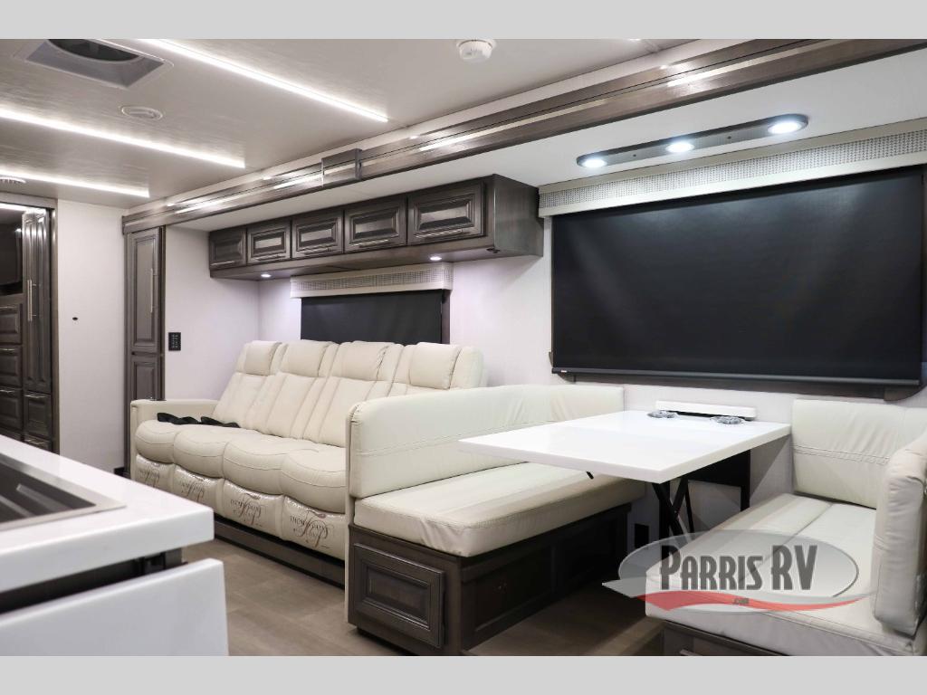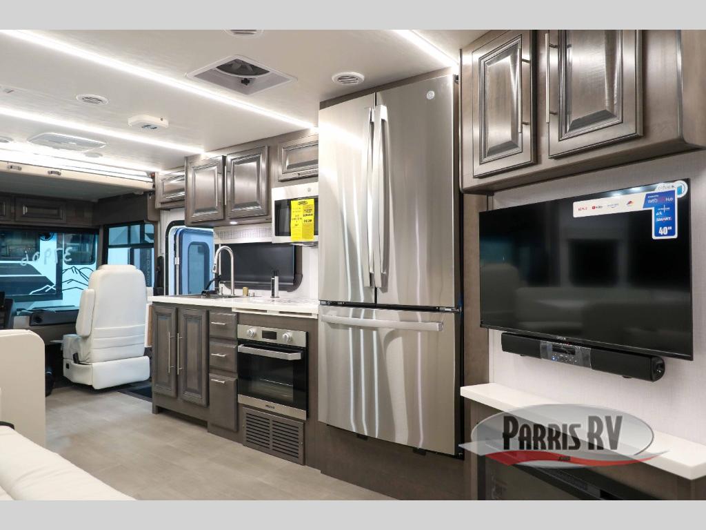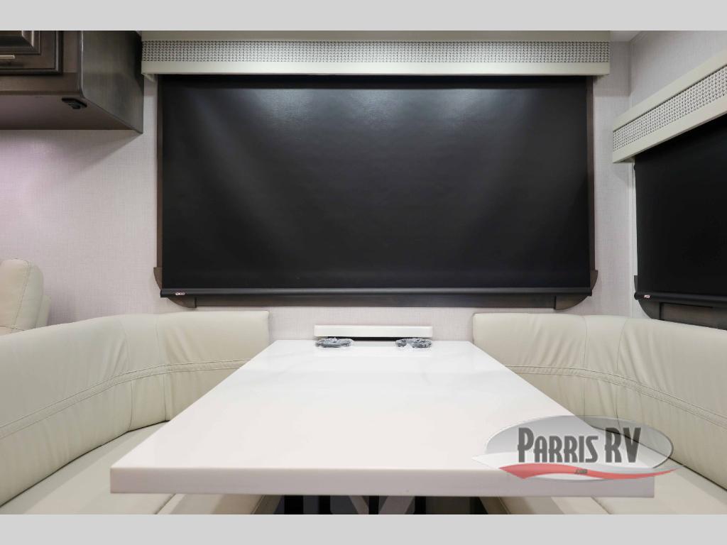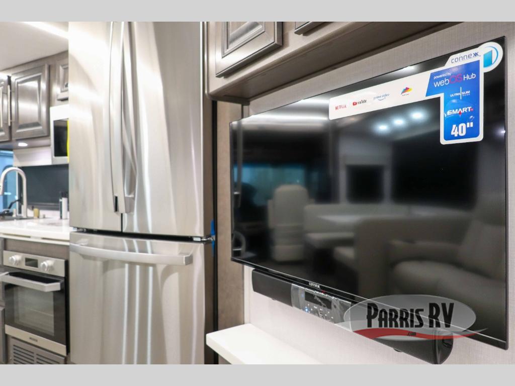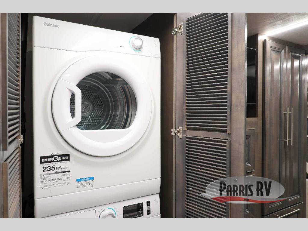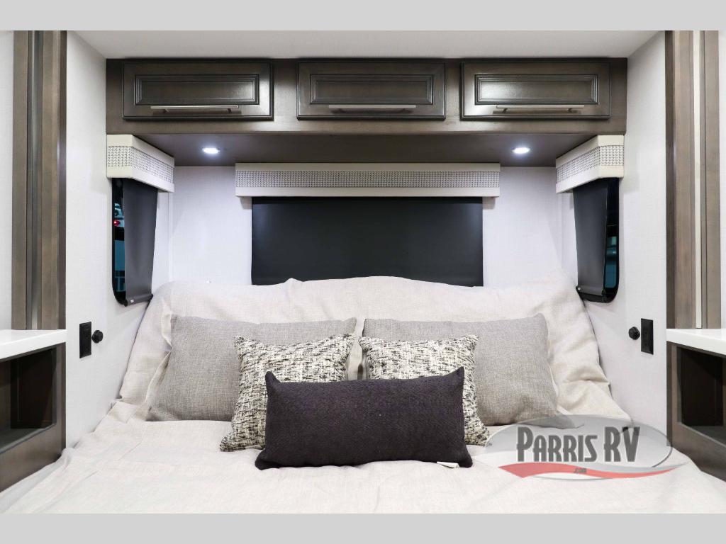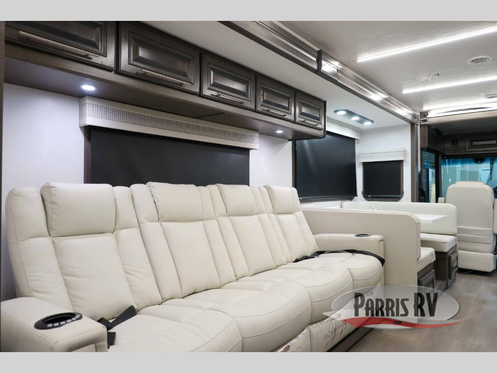 Comfort and convenience are found all throughout this motorhome! Starting with the full rear master bath that has a shower with a seat and a dual sink vanity, plus it leads into the private bedroom. Inside the bedroom is a 72" x 80" king bed slide with overhead cabinets across from a dresser with overhead cabinets and a 32" LED TV, a wardrobe, and another wardrobe that is prepped to add an optional stackable washer and dryer. The half bathroom is conveniently near the fully equipped kitchen so you can get back to creating your best home cooked meals fast. Relax in true comfort each night by either playing games at the booth dinette or on the theater seating that comes with power recline, heat, and massage!