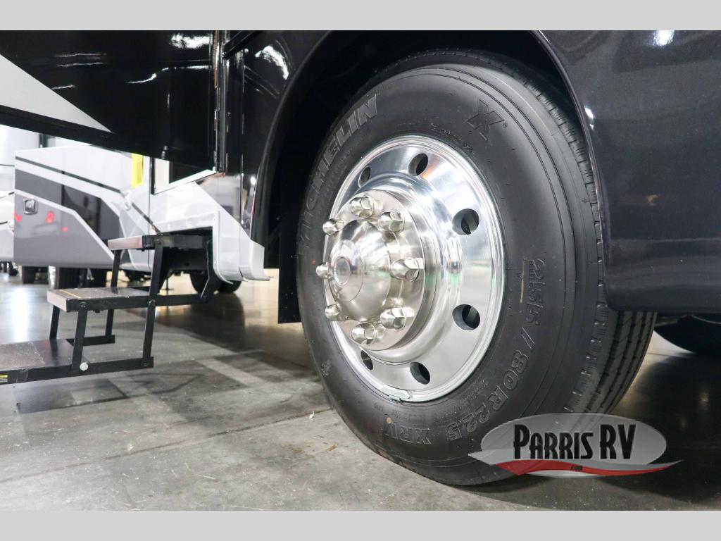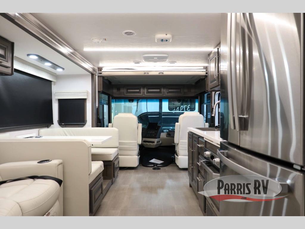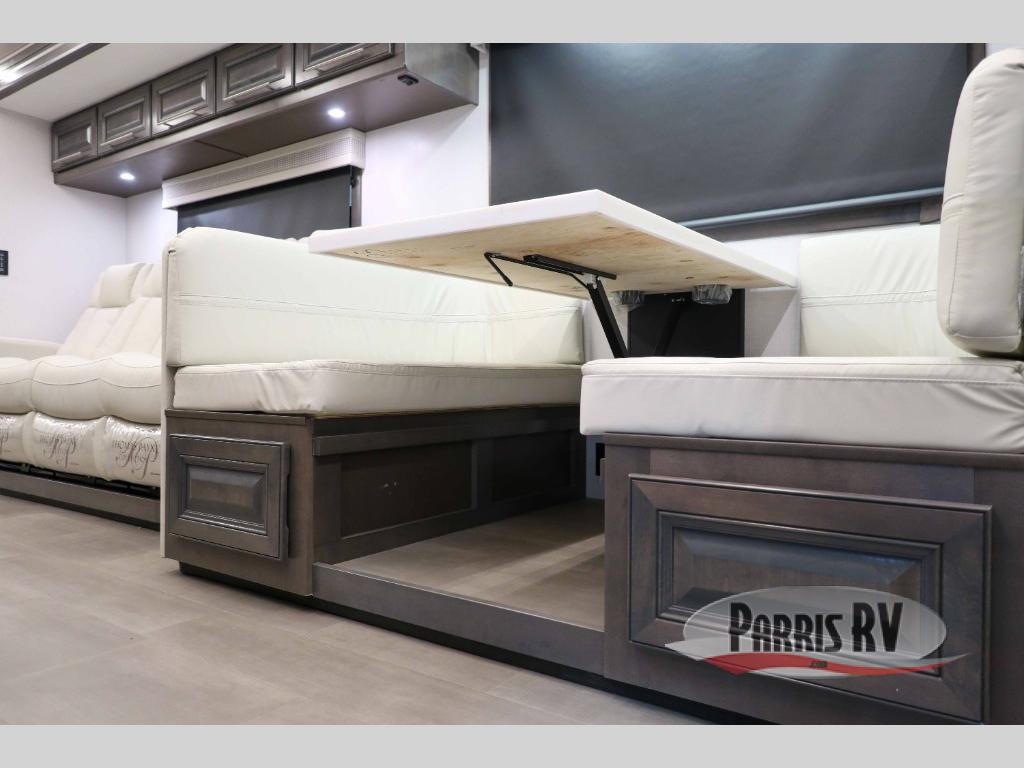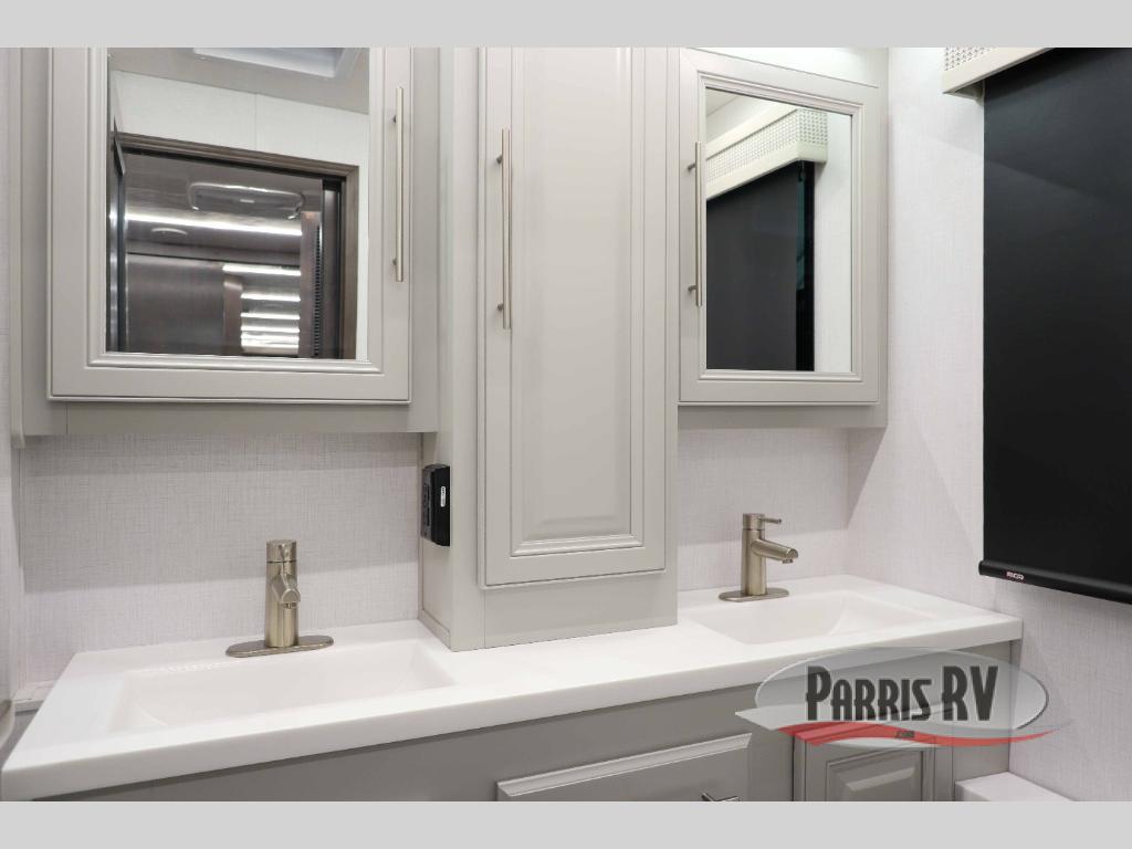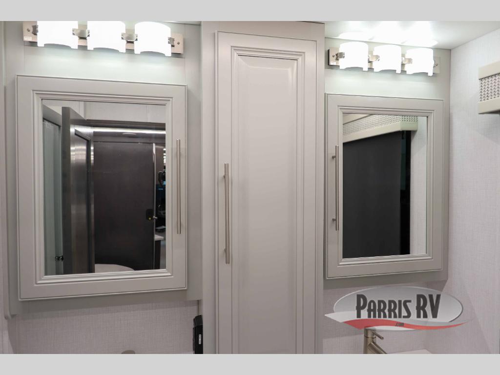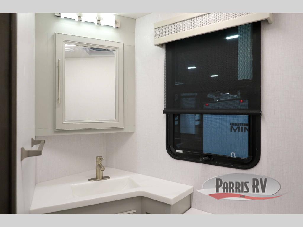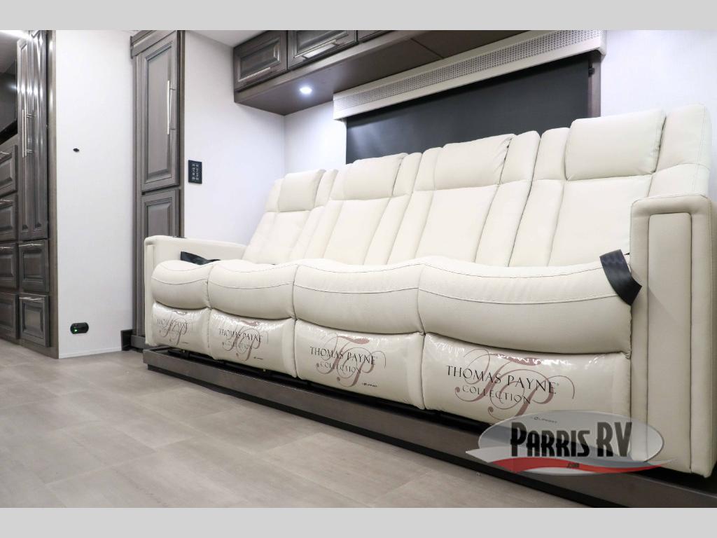 Comfort and convenience are found all throughout this motorhome! Starting with the full rear master bath that has a shower with a seat and a dual sink vanity, plus it leads into the private bedroom. Inside the bedroom is a 72" x 80" king bed slide with overhead cabinets across from a dresser with overhead cabinets and a 32" LED TV, a wardrobe, and another wardrobe that is prepped to add an optional stackable washer and dryer. The half bathroom is conveniently near the fully equipped kitchen so you can get back to creating your best home cooked meals fast. Relax in true comfort each night by either playing games at the booth dinette or on the theater seating that comes with power recline, heat, and massage!