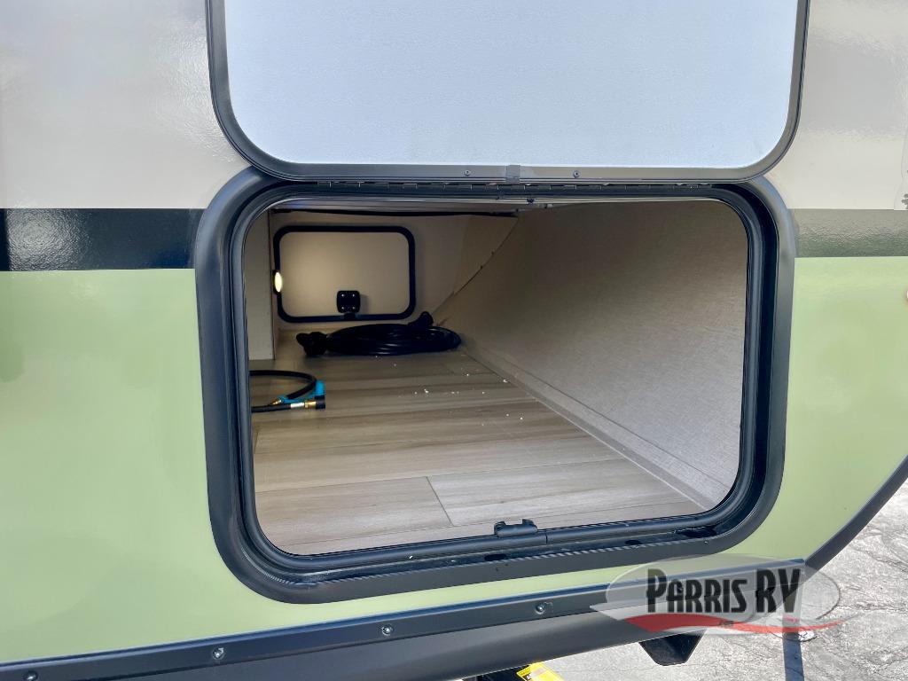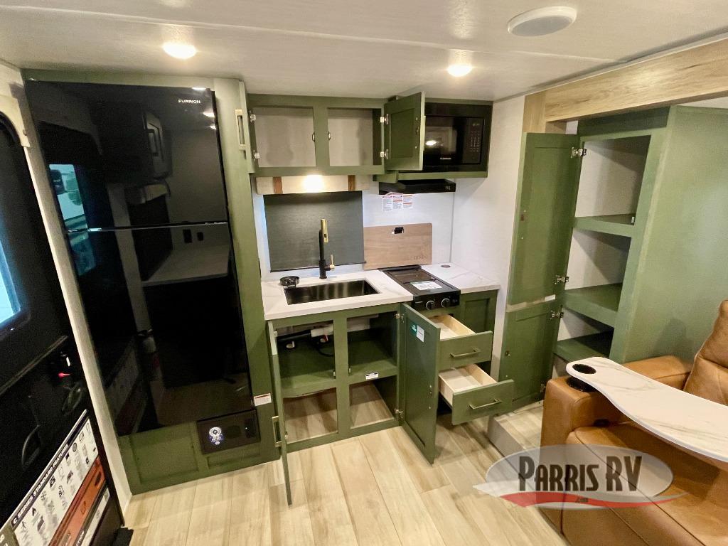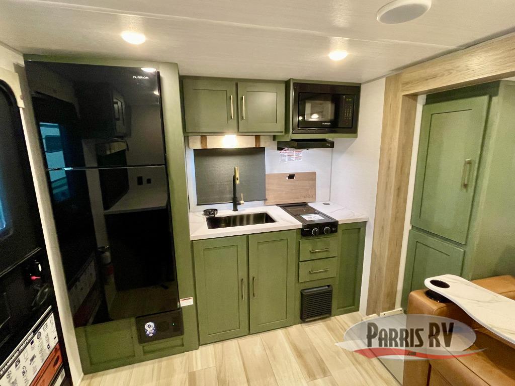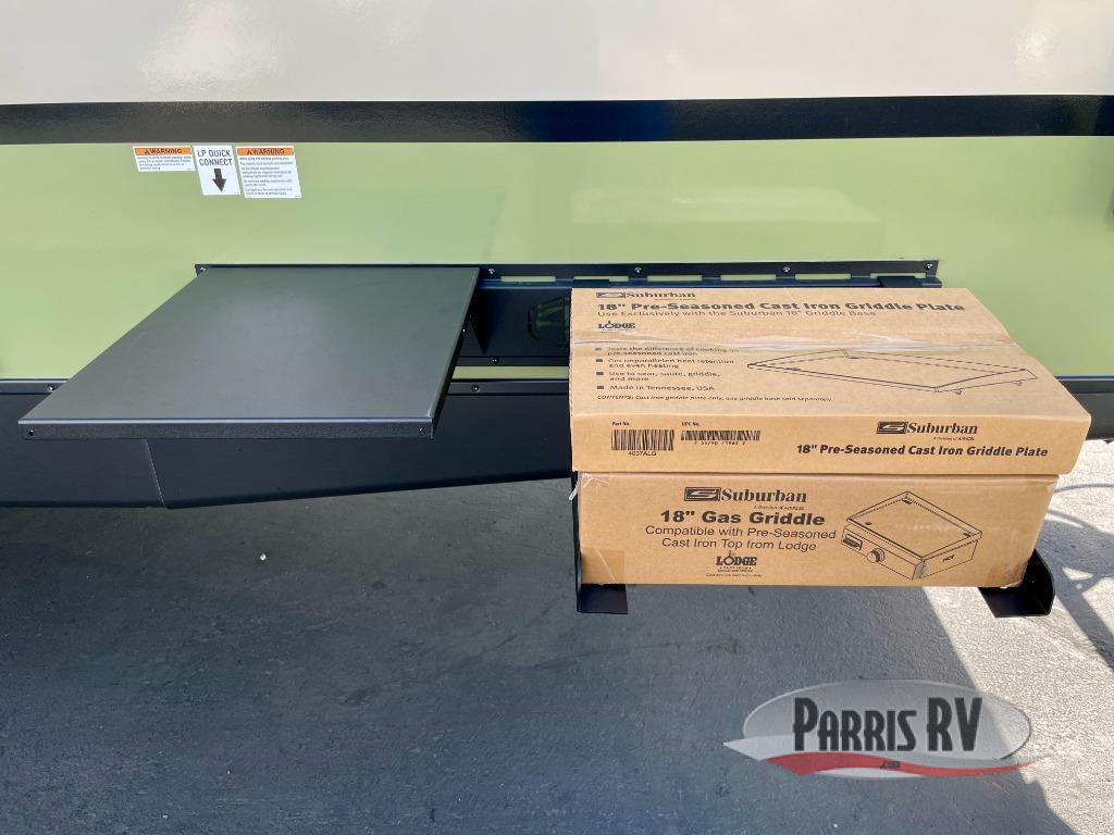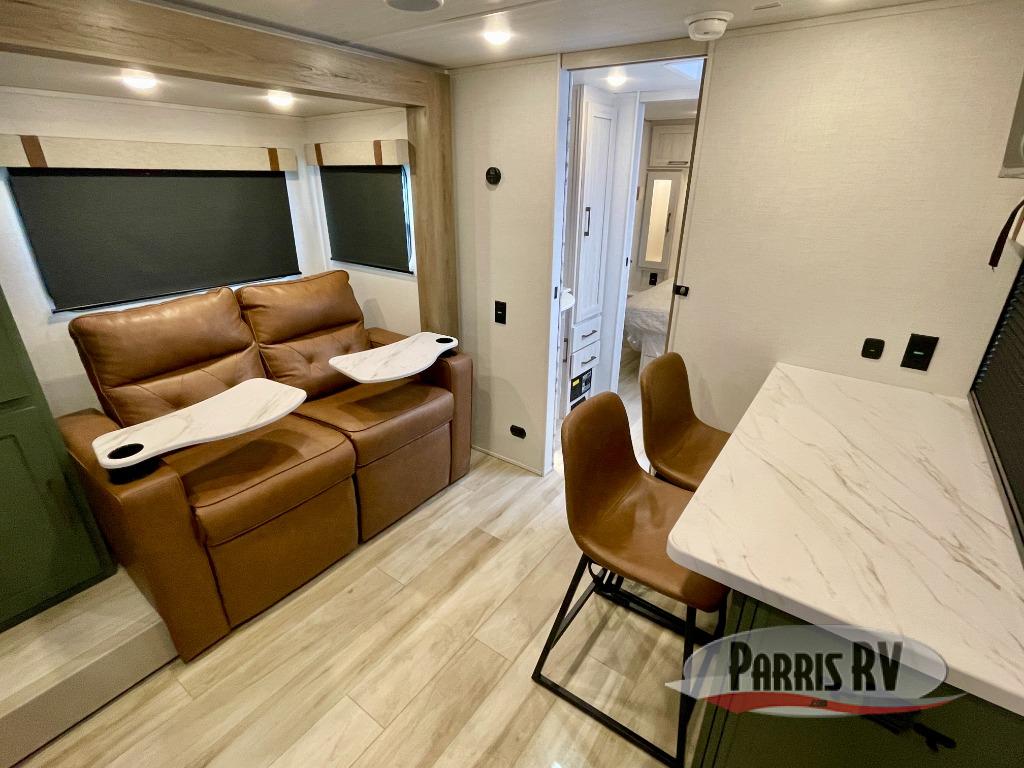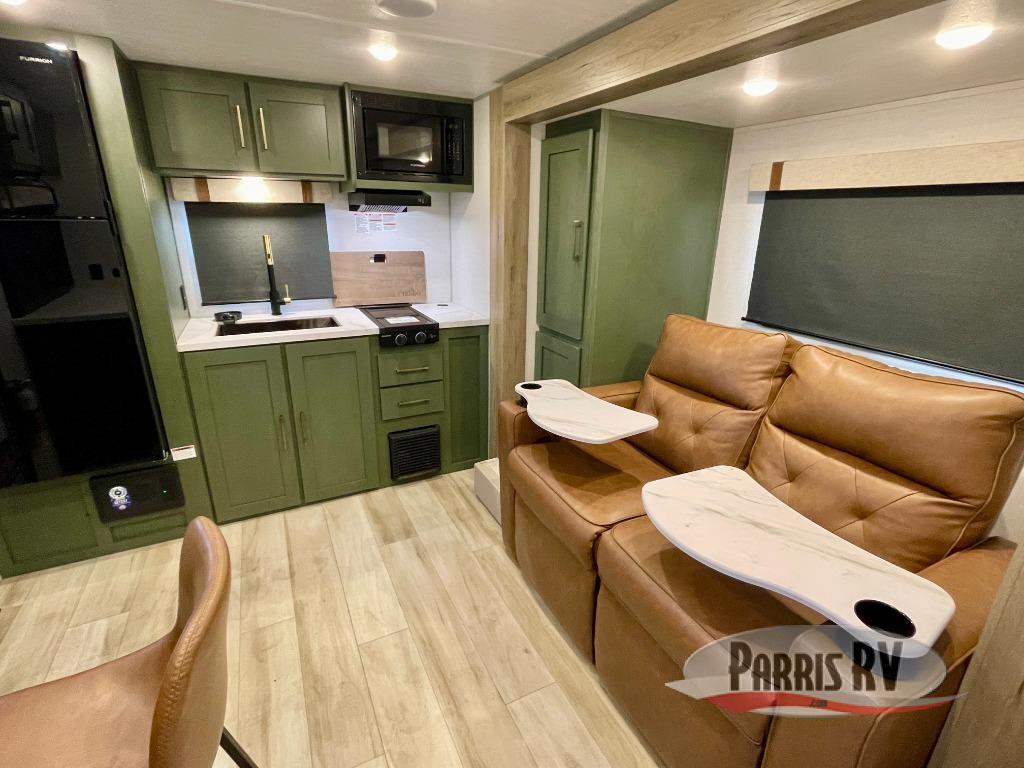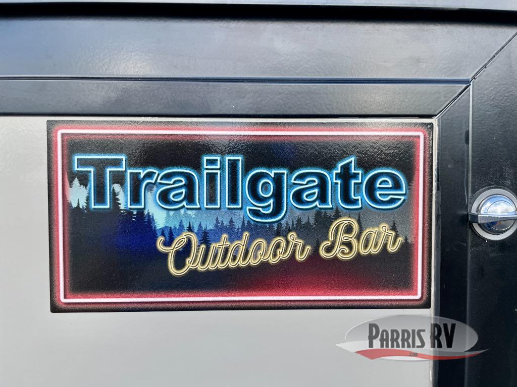 You'll love camping in this couple's trailer! There is a queen bed in the front bedroom, along with dual bedside wardrobes and overhead storage for clothes, books and more. And don't overlook the spacious walk-thru bath! Once you've made breakfast in the rear kitchen or on the outside kitchen, you can dine at the bar top with chairs and a flip-up window. There is also a Trailgate Outdoor Bar if you decide to dine outdoors!