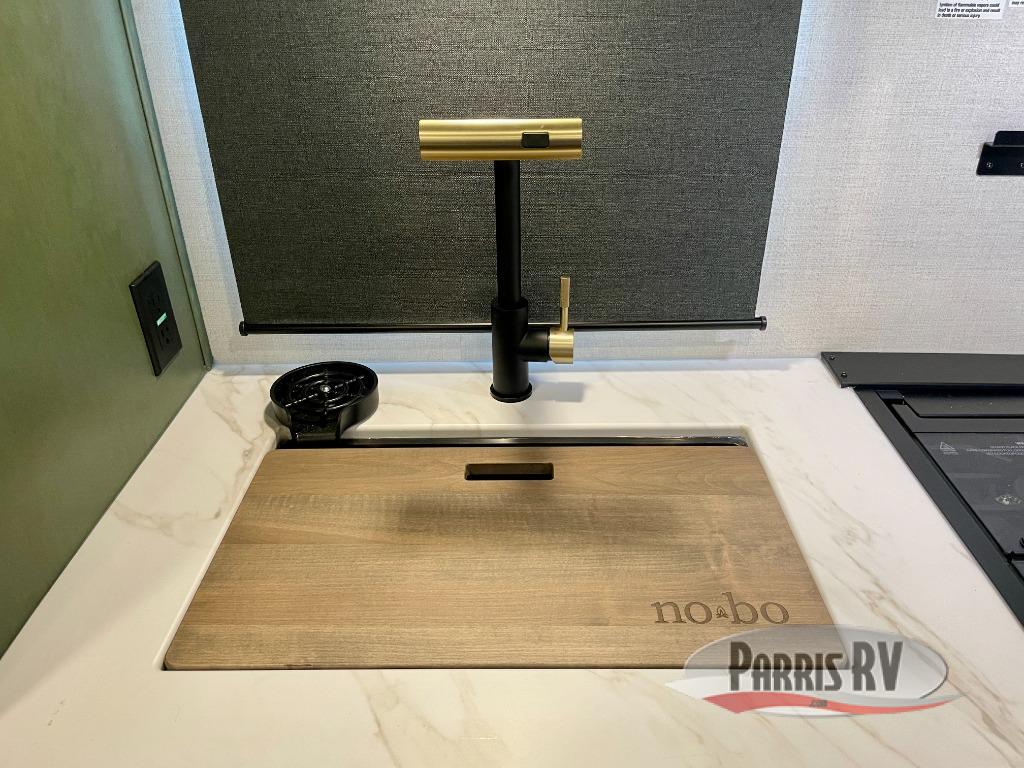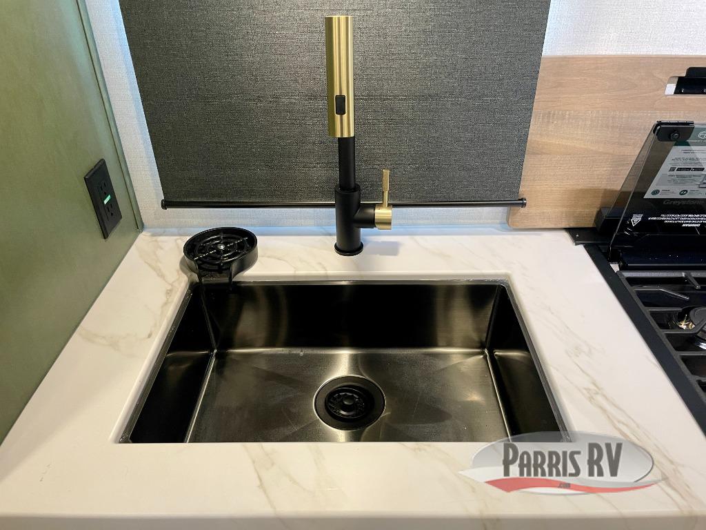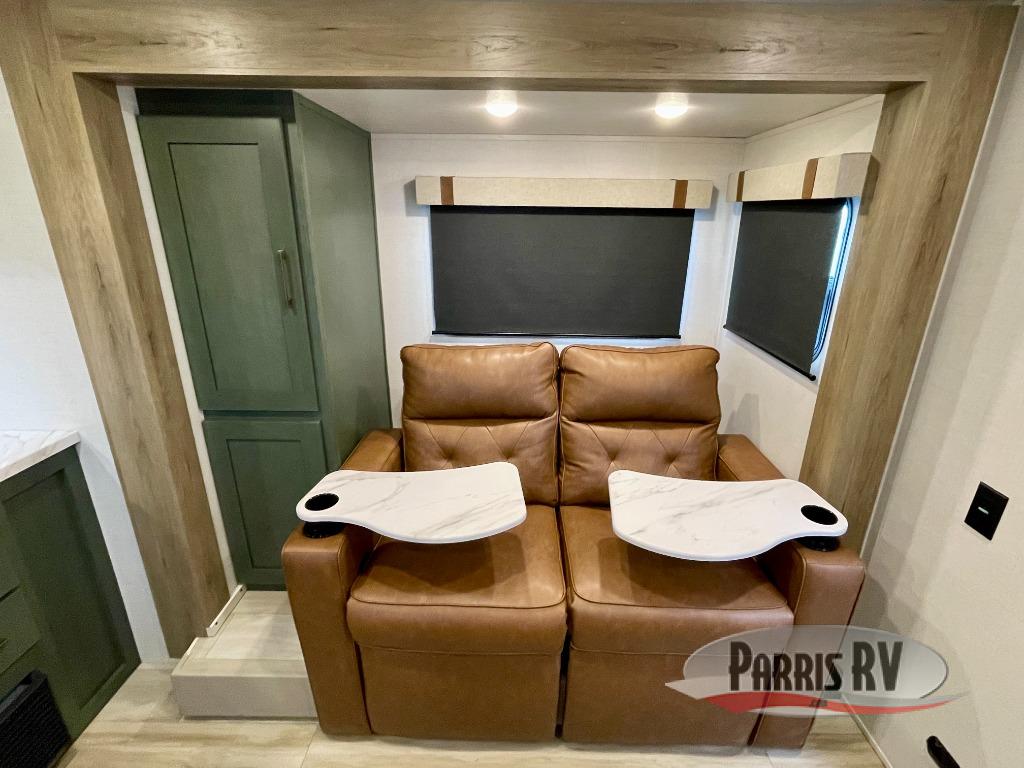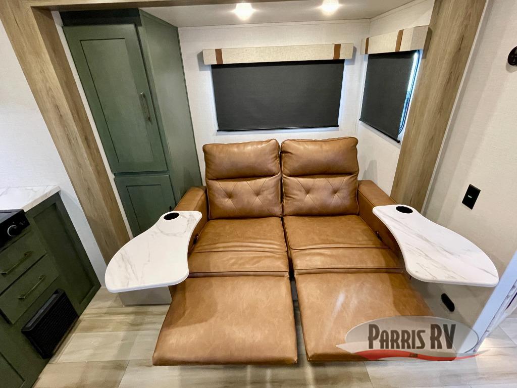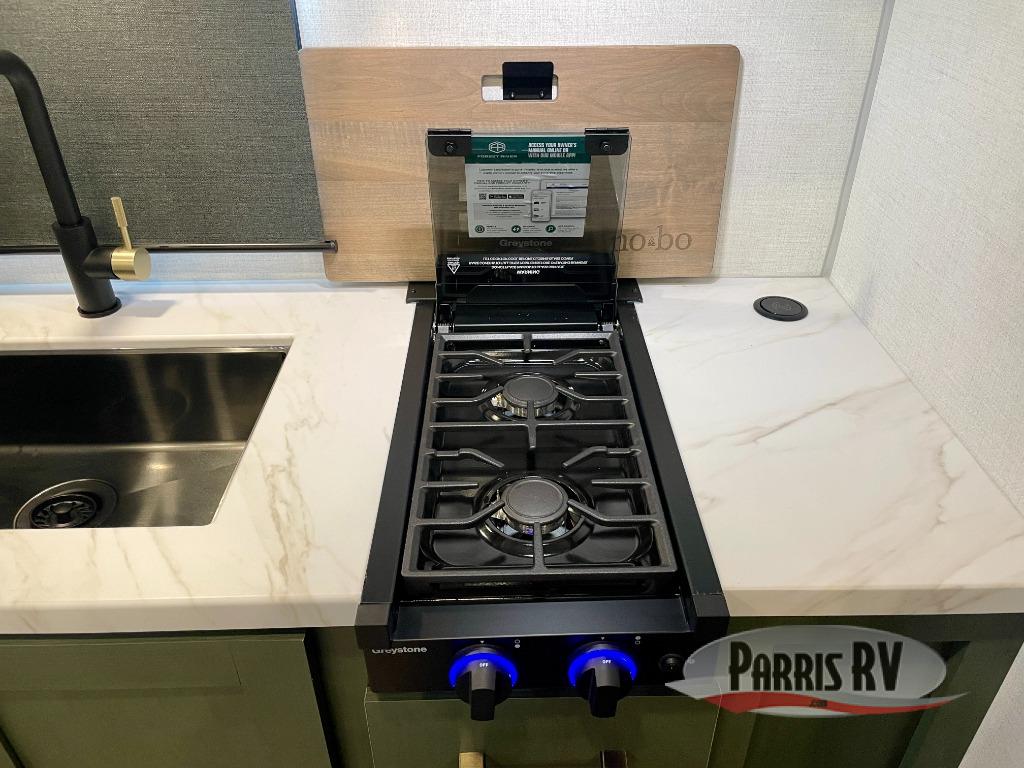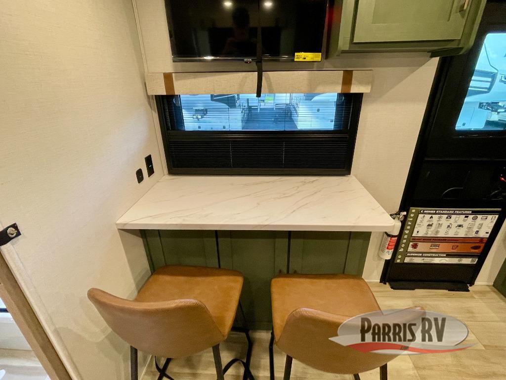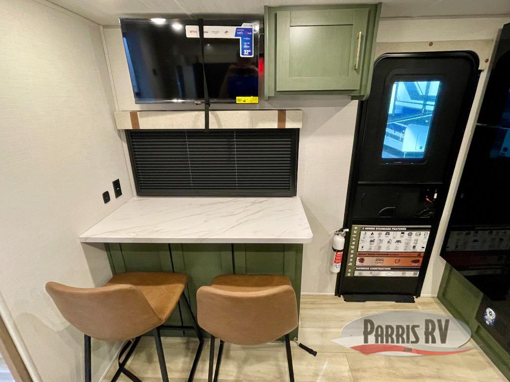 You'll love camping in this couple's trailer! There is a queen bed in the front bedroom, along with dual bedside wardrobes and overhead storage for clothes, books and more. And don't overlook the spacious walk-thru bath! Once you've made breakfast in the rear kitchen or on the outside kitchen, you can dine at the bar top with chairs and a flip-up window. There is also a Trailgate Outdoor Bar if you decide to dine outdoors!