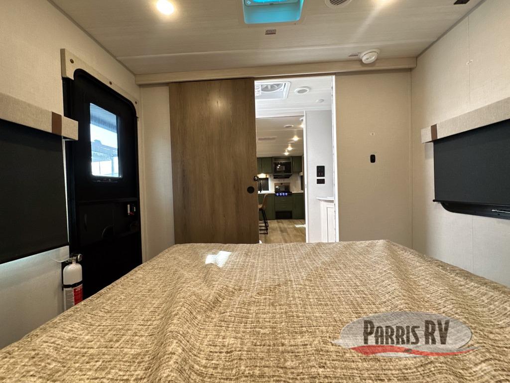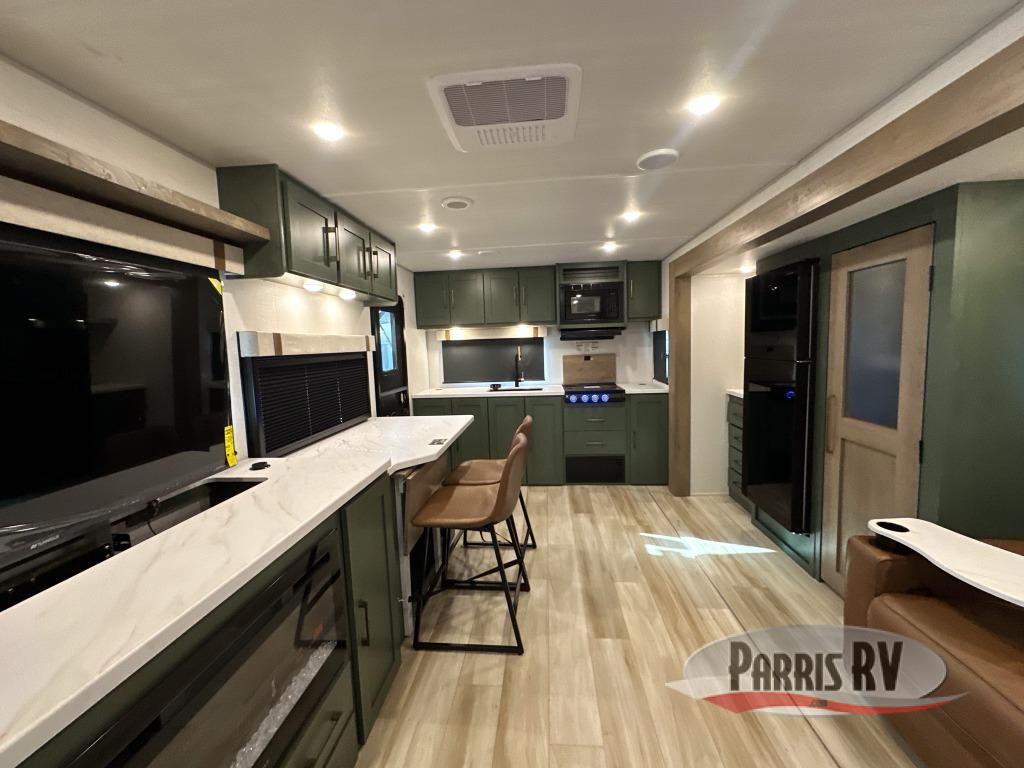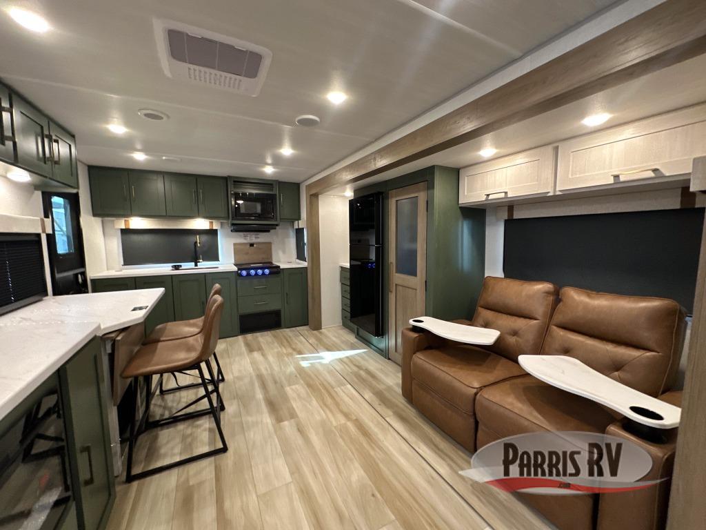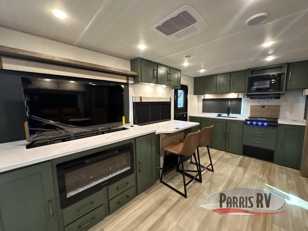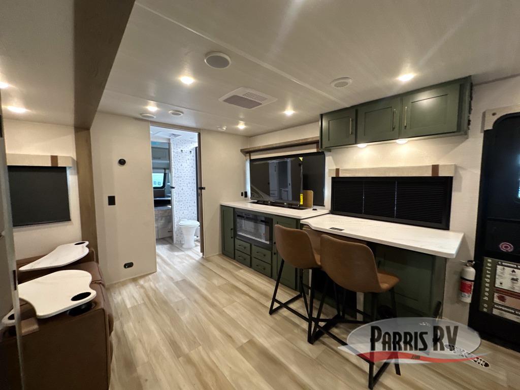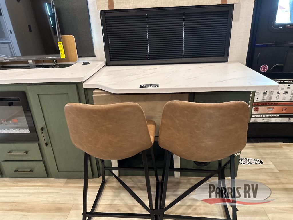 Make each camping trip one to remember in this dual entry, rear kitchen travel trailer! If you enter in through the front master bedroom, you'll find a queen bed and dual wardrobes for your things, plus a private entrance into the walk-thru bath. This will lead you to the main living area that is made spacious thanks to the large slide out. There is theater seating here, along with a refrigerator, pantry, and hutch with a shelf so everything has its place. Once the chef of your group has made dinner in the rear kitchen, you can dine at the Bar 2 Table pull-out dinette, which is conveniently located in front of the flip-up window. Just outside this window, you'll find the Trailgate outdoor bar, giving you a food truck atmosphere where you can visit with those sitting at the dinette table inside. When the optional Beast Mode Package on this model is chosen, you'll enjoy a 400-watt solar package, a fresh water filter, a Maxxair roof vent cover, plus a Beast Mode independent suspension for better handling.
