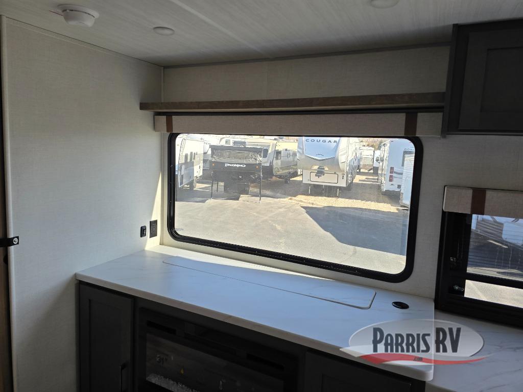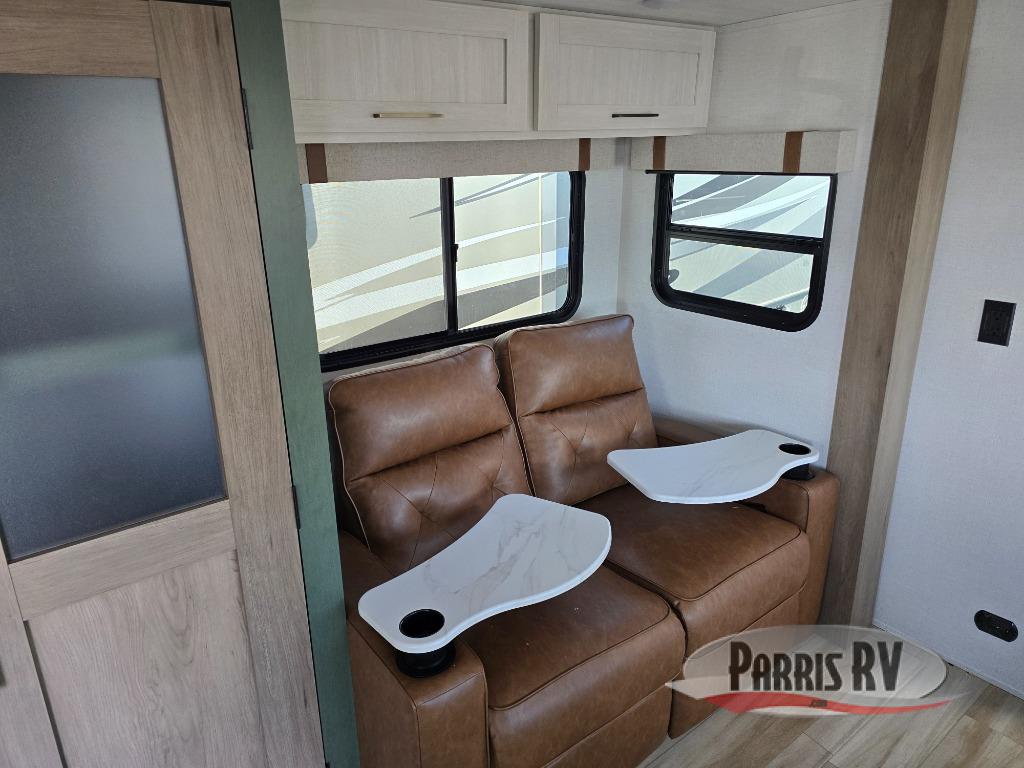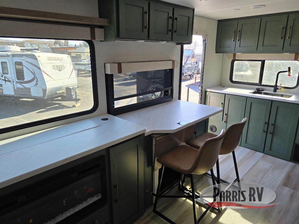Make each camping trip one to remember in this dual entry, rear kitchen travel trailer! If you enter in through the front master bedroom, you'll find a queen bed and dual wardrobes for your things, plus a private entrance into the walk-thru bath. This will lead you to the main living area that is made spacious thanks to the large slide out. There is theater seating here, along with a refrigerator, pantry, and hutch with a shelf so everything has its place. Once the chef of your group has made dinner in the rear kitchen, you can dine at the Bar 2 Table pull-out dinette, which is conveniently located in front of the flip-up window. Just outside this window, you'll find the Trailgate outdoor bar, giving you a food truck atmosphere where you can visit with those sitting at the dinette table inside. When the optional Beast Mode Package on this model is chosen, you'll enjoy a 400-watt solar package, a fresh water filter, a Maxxair roof vent cover, plus a Beast Mode independent suspension for better handling.