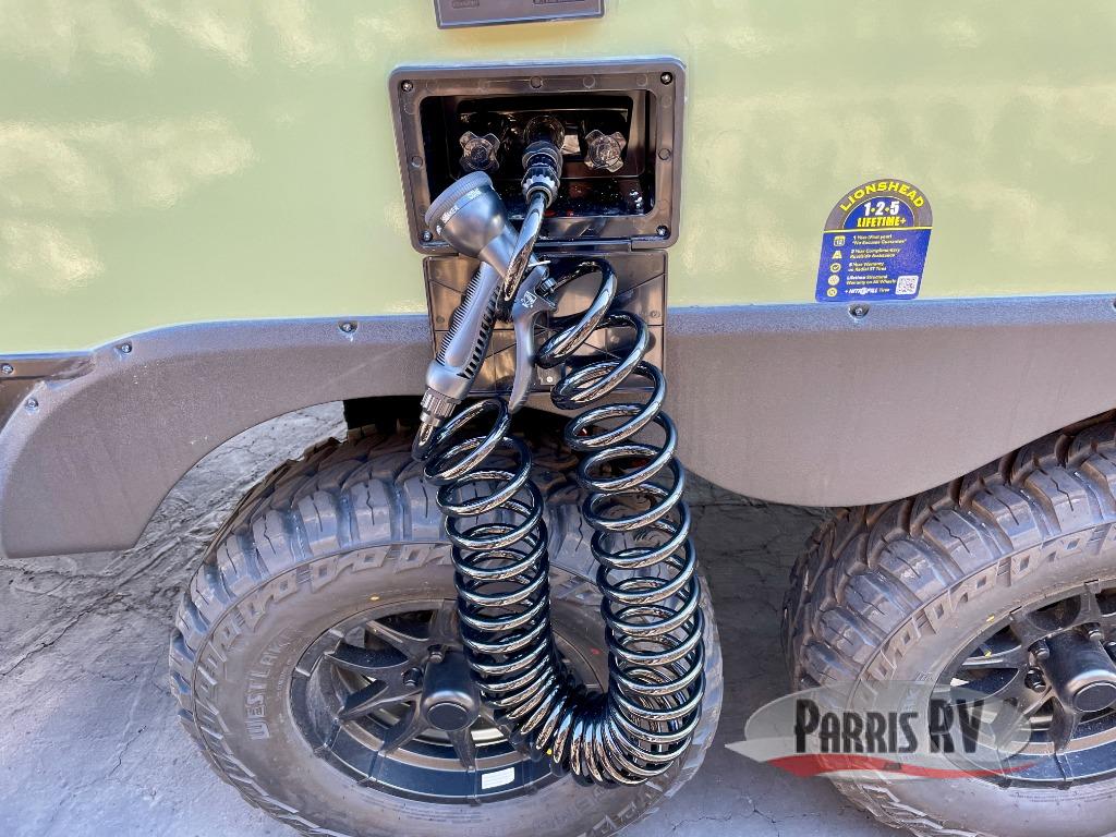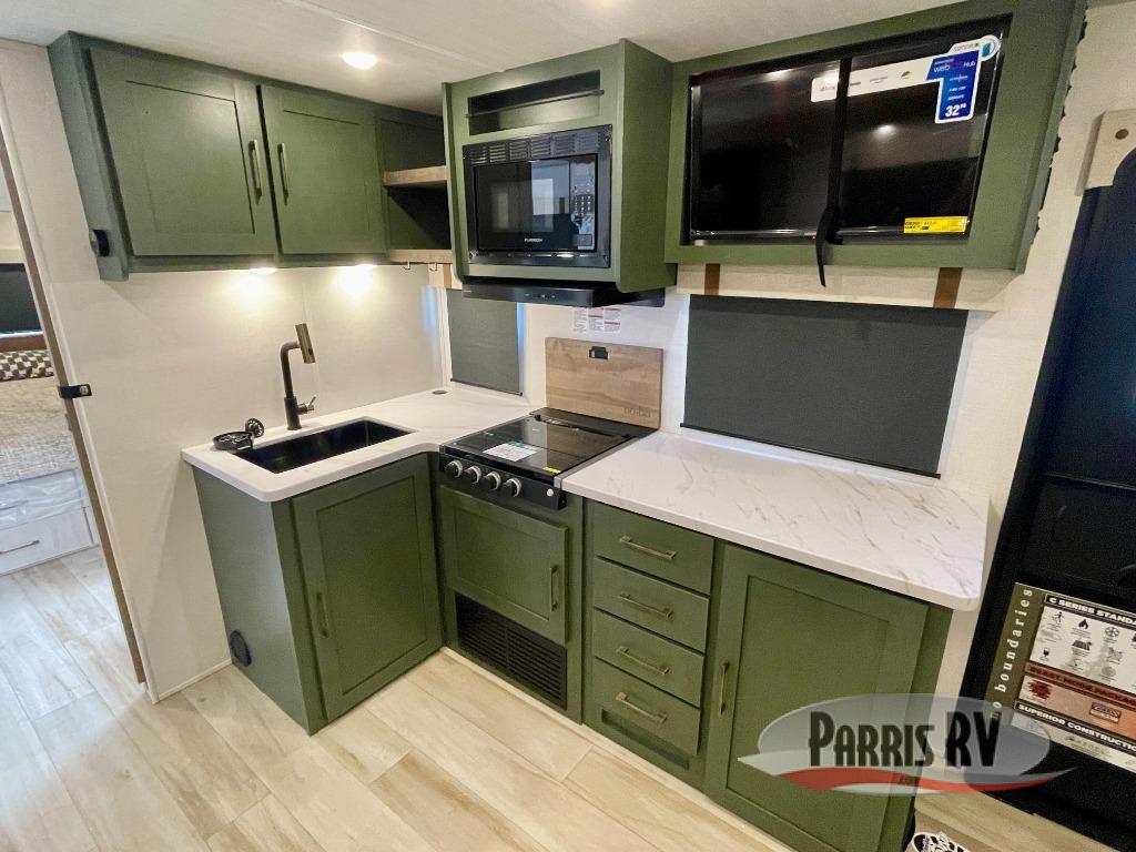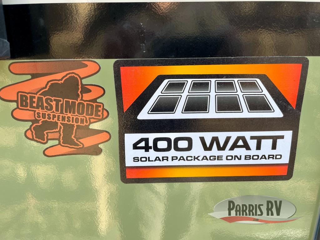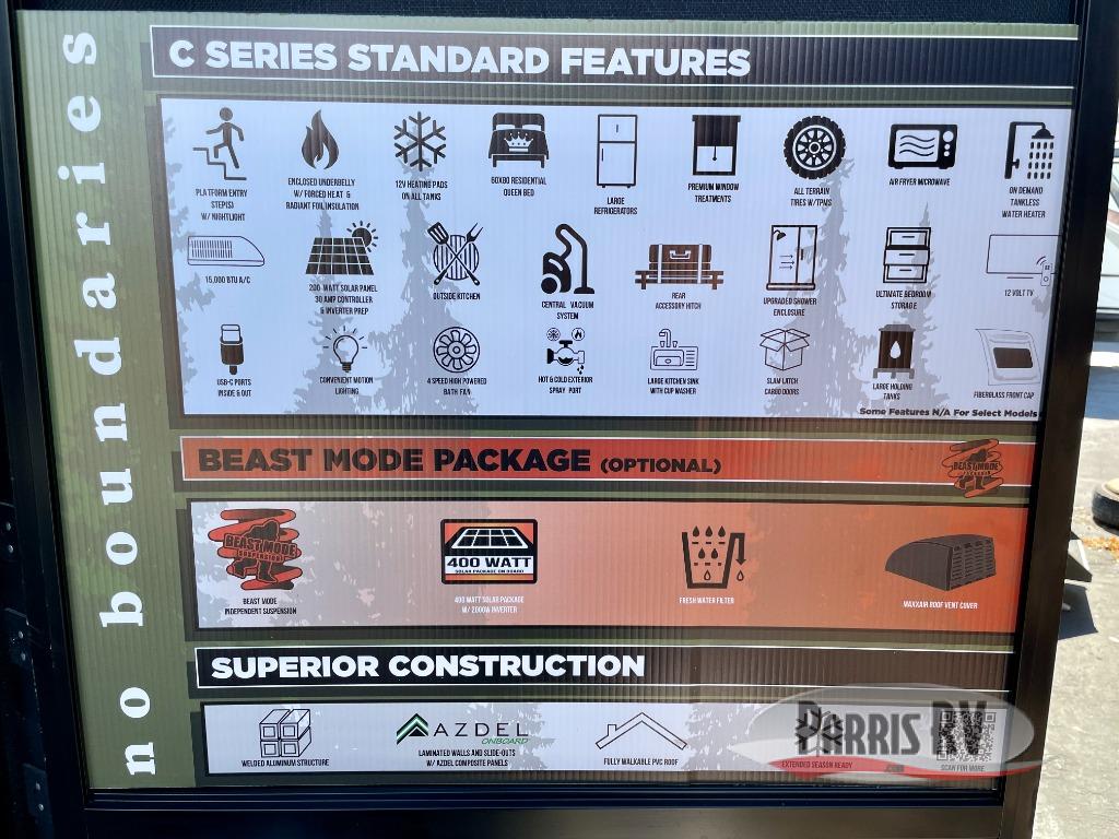 It will be so easy to enjoy camping trips in this No Boundaries travel trailer! The front master bedroom includes one of the dual entry doors so you can slip out early for a morning run without waking anyone else up. When you return, you can freshen up in the walk-thru bath, then head to the kitchen to make breakfast. There is also an outside kitchen so you can cook in the fresh mountain air. There is a booth dinette inside where you can dine at, play games, and even let a guest sleep over, and the tri-fold sofa slide provides more space and comfort! When the optional Beast Mode Package on this model is chosen, you'll enjoy a 400-watt solar package, a fresh water filter, a Maxxair roof vent cover, plus a Beast Mode independent suspension for better handling.