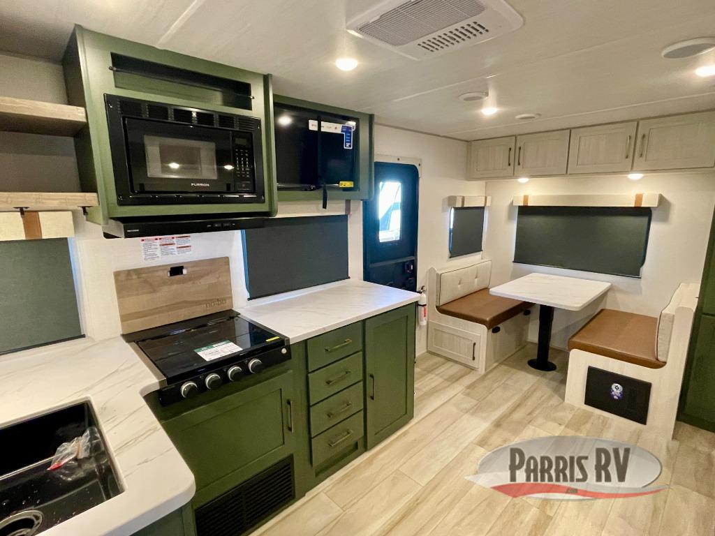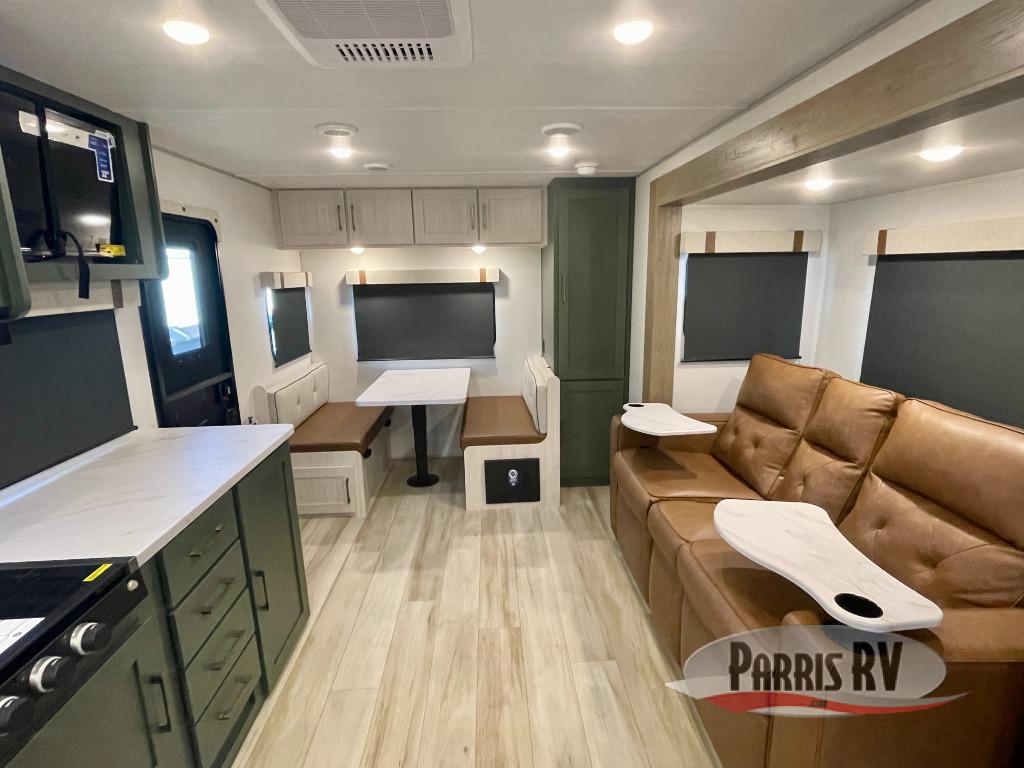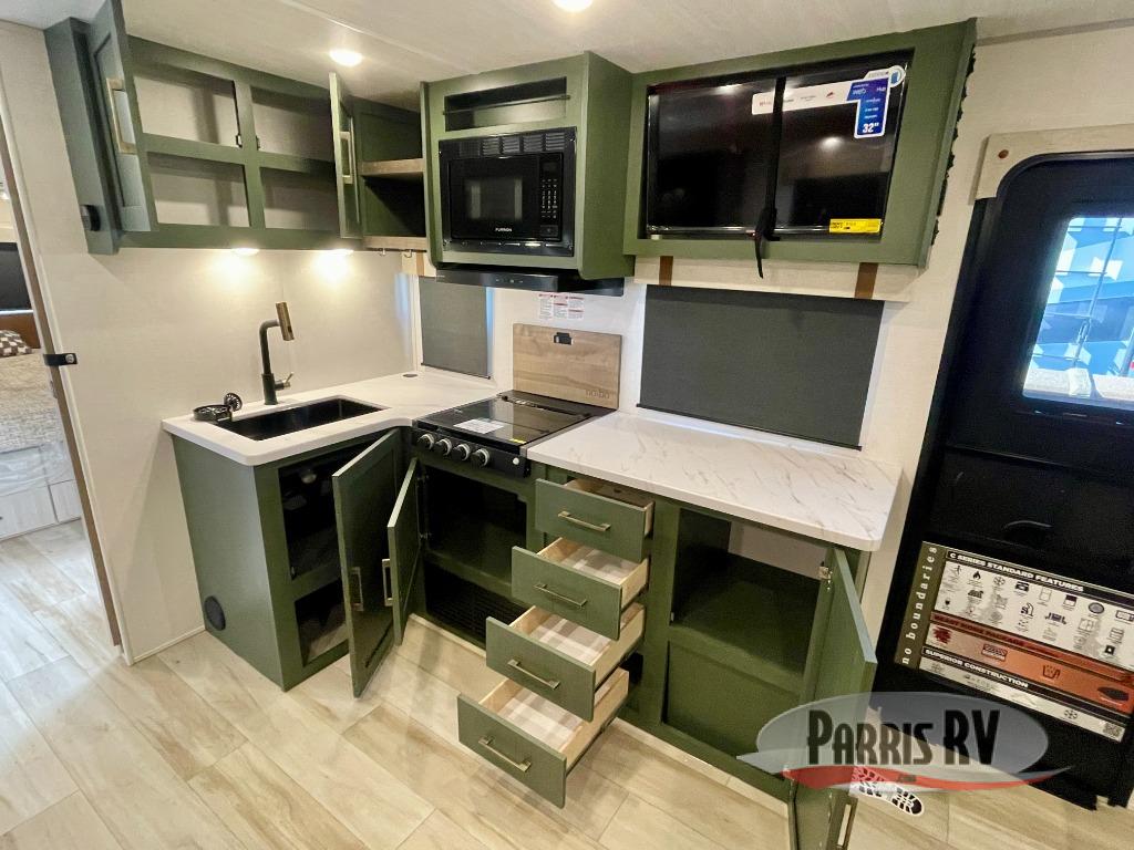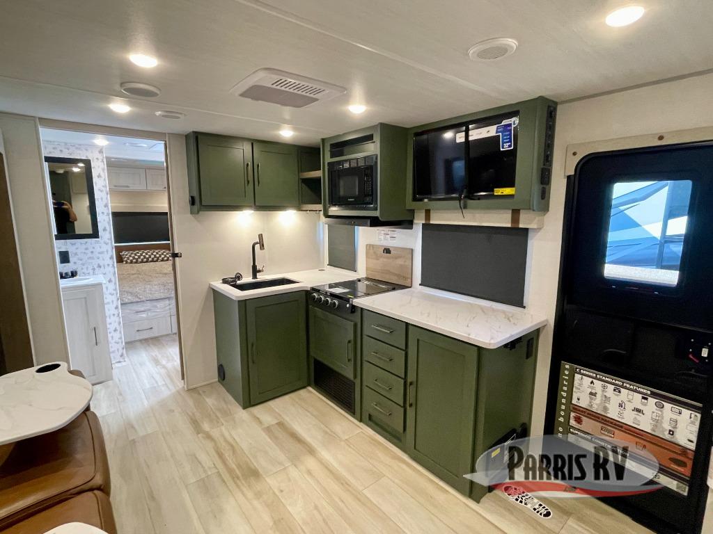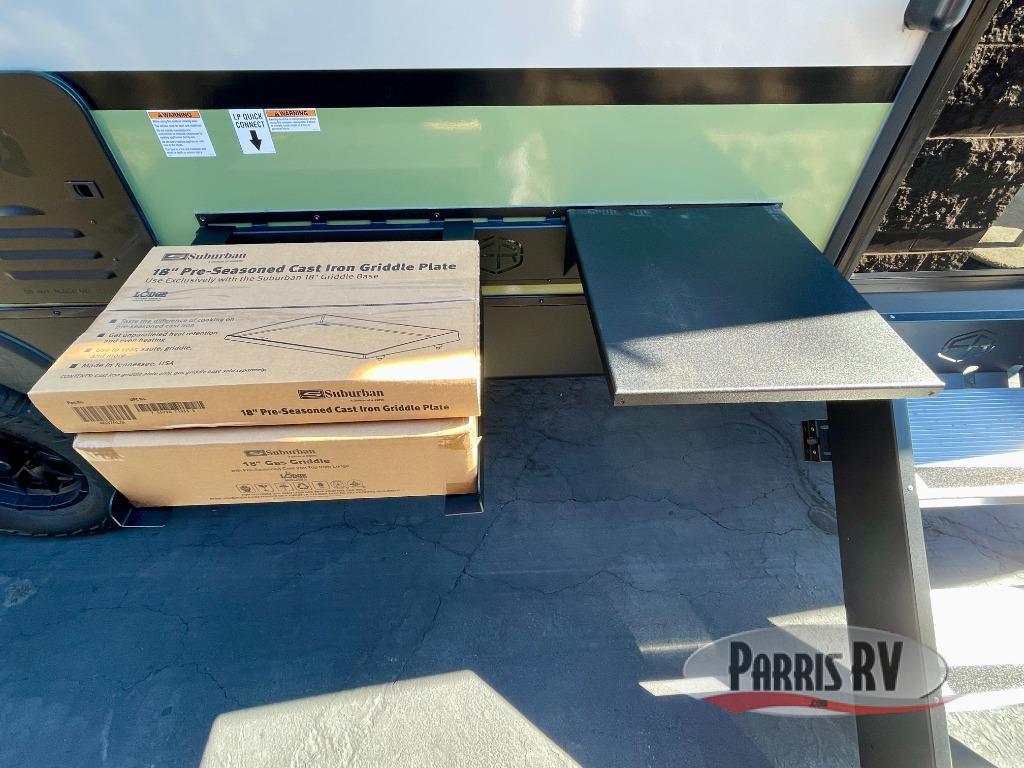 It will be so easy to enjoy camping trips in this No Boundaries travel trailer! The front master bedroom includes one of the dual entry doors so you can slip out early for a morning run without waking anyone else up. When you return, you can freshen up in the walk-thru bath, then head to the kitchen to make breakfast. There is also an outside kitchen so you can cook in the fresh mountain air. There is a booth dinette inside where you can dine at, play games, and even let a guest sleep over, and the tri-fold sofa slide provides more space and comfort! When the optional Beast Mode Package on this model is chosen, you'll enjoy a 400-watt solar package, a fresh water filter, a Maxxair roof vent cover, plus a Beast Mode independent suspension for better handling.