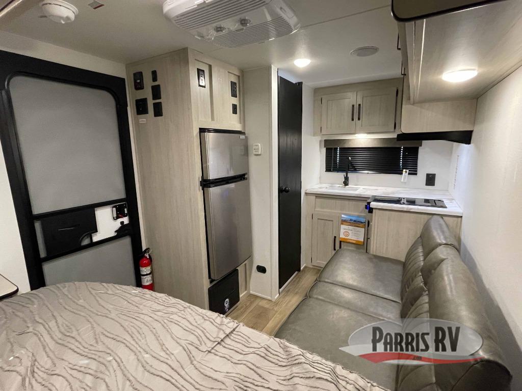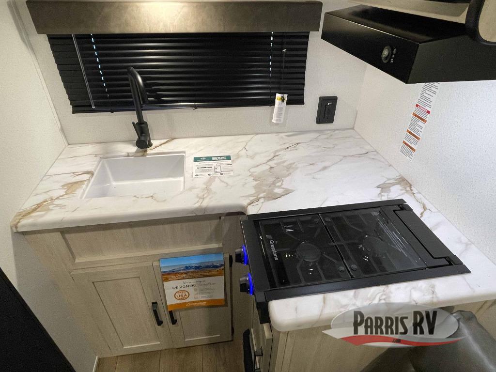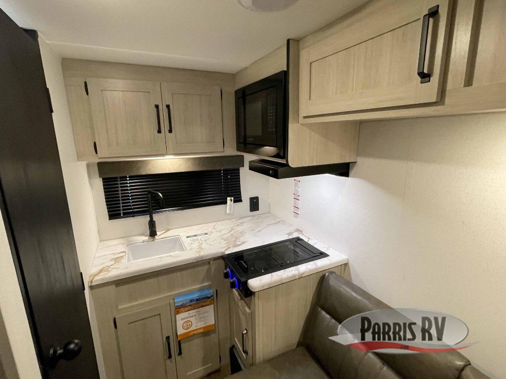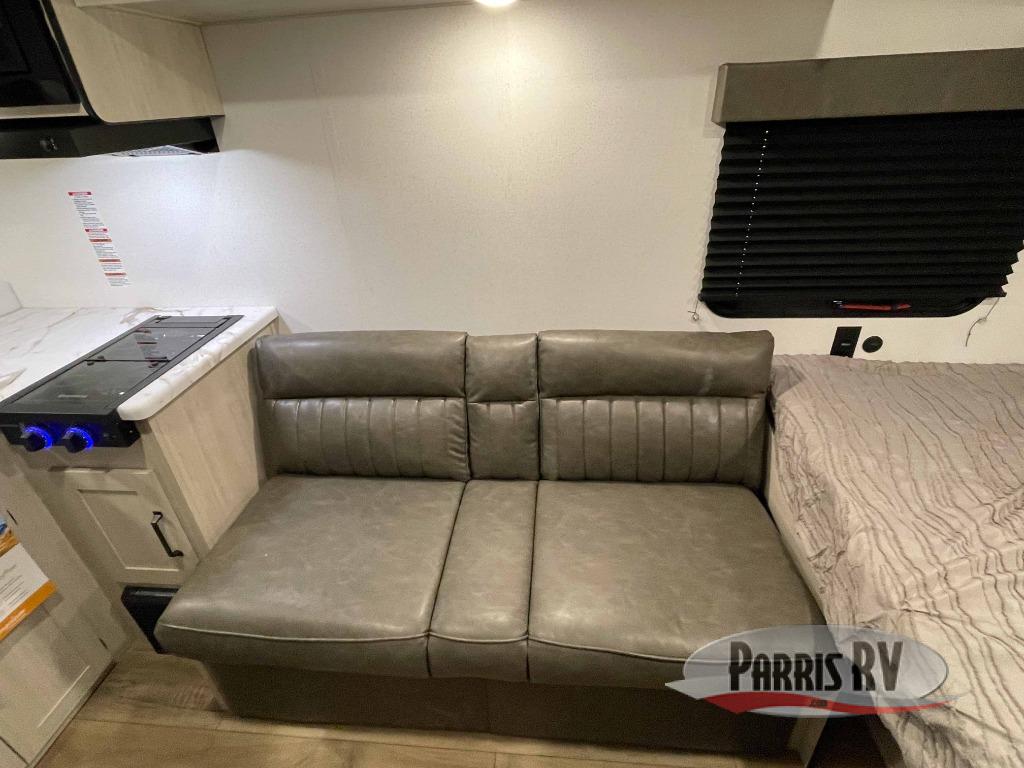 It will be so easy to enjoy camping trips in this single axle travel trailer! There is an RV queen bed up front with flip-up storage at the foot of the bed for your belongings, and any additional guests can sleep on the sofa. A full kitchen includes a stainless two burner cooktop and stainless microwave to cook meals each day, and the 4.3 cu. ft. 12V black glass refrigerator will keep your food fresh. And a private bath with a toilet and shower will let you freshen up without having to use the camp's facilities!