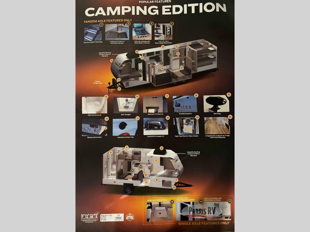 The Puma Camping Edition by Palomino offer an affordable travel trailer for rookie campers or seasoned RVers! They are built with 5/8" tongue and groove plywood flooring and a front diamond plate for added protection. There are also exterior clamp style door latches, back up camera prep, and 20 lb. LP bottles. Head inside to find Thermofoil countertops with a smooth drop edge, bedroom USB ports and outlets, and a GE appliance and kitchen package.
