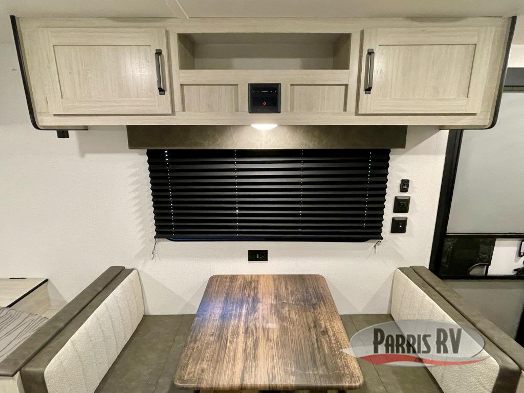 It will be so easy to enjoy camping trips in this single axle travel trailer! There is a front RV queen bed with flip-up storage at the foot of the bed for your belongings, and an additional guest or two little ones can sleep on the booth dinette when it's not being used to dine at. A full kitchen includes a stainless two burner cooktop and stainless microwave to cook meals each day, and the 4.3 cu. ft. 12V black glass refrigerator will keep your food fresh. And a private bath with a toilet and shower will let you freshen up without having to use the camp's facilities!