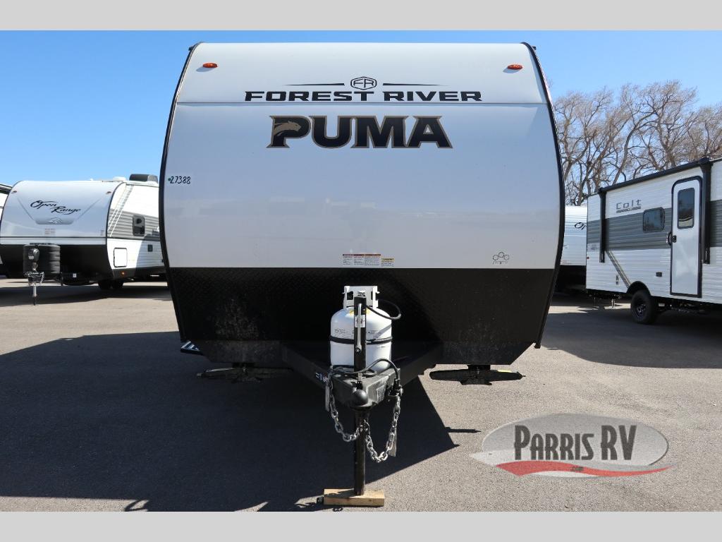 The Puma Camping Edition by Forest River offer an affordable travel trailer for rookie campers or seasoned RVers! They are built with 5/8" tongue and groove plywood flooring and a front diamond plate for added protection. There are also exterior magnetic baggage door latches, back up camera prep, a battery disconnect. Head inside to find Thermofoil countertops with a smooth drop edge, bedroom USB ports and outlets, and pleated shades in the living room.