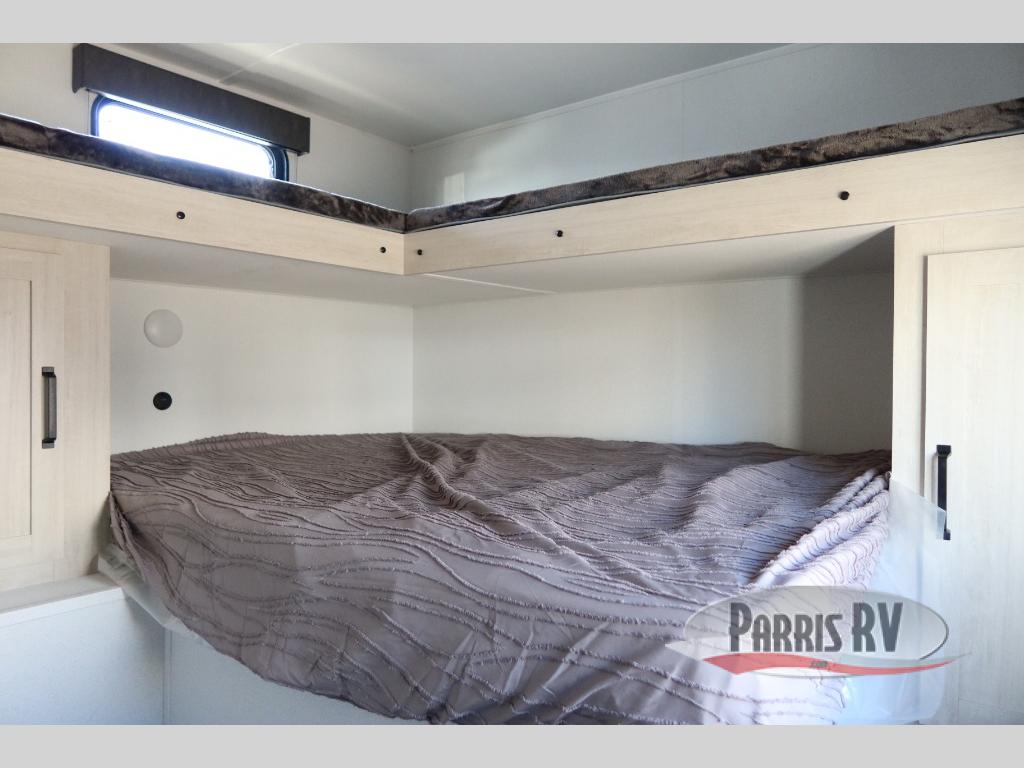 If you're looking for more space, this double axle unit features a large slide so you can walk about freely. Here, you'll find the booth dinette and sofa, which sit across from the optional TV if you want to enjoy movie nights. The full kitchen includes a stainless microwave and three burner cooktop to make meals, plus a pantry and 12V refrigerator for food storage. And an optional outside mini kitchen with a grill can be added if you enjoy cooking outdoors! Your guests or littles are sure to enjoy the rear bedroom with a queen bed, a 28" x 65" bunk, 28" x 76" bunk, a shirt closet, and a wardrobe so everything has a place!