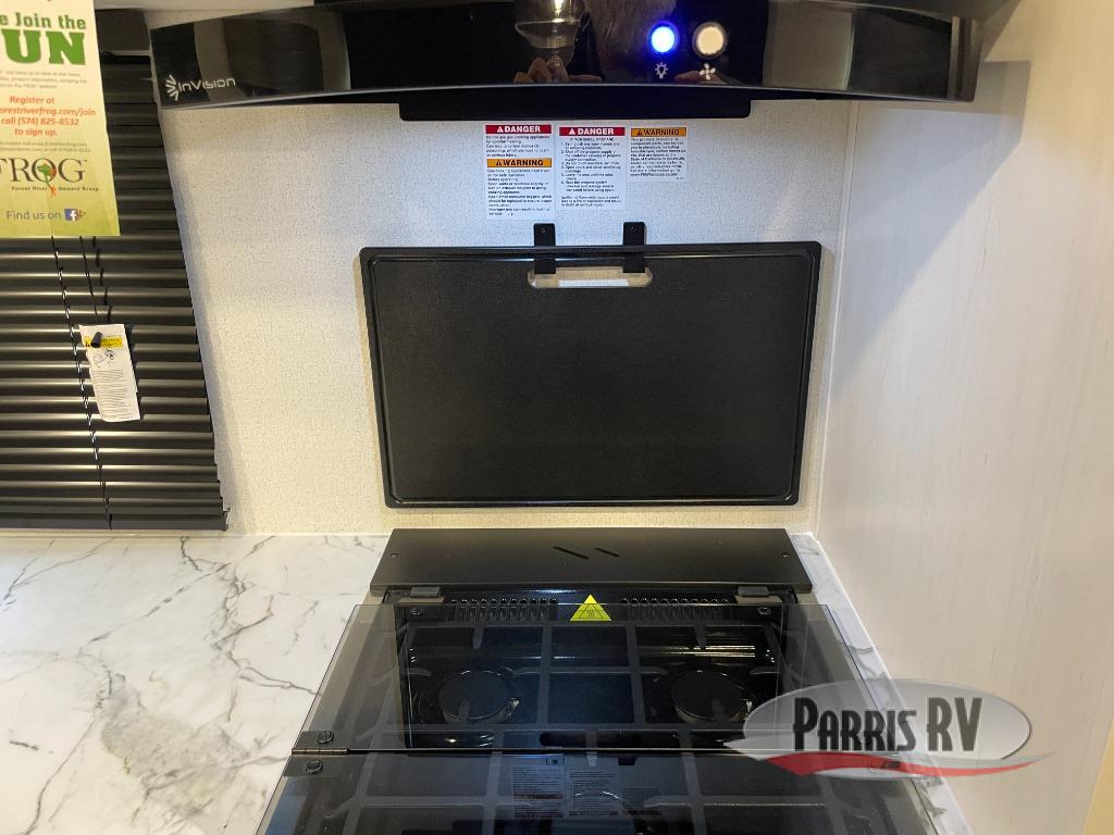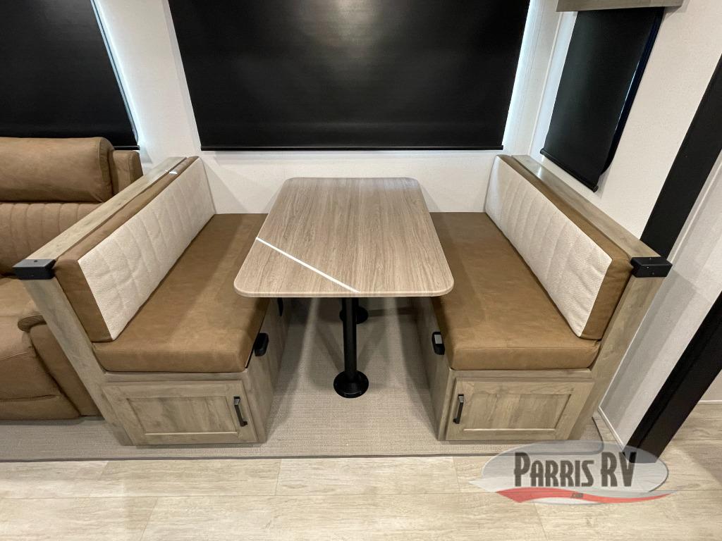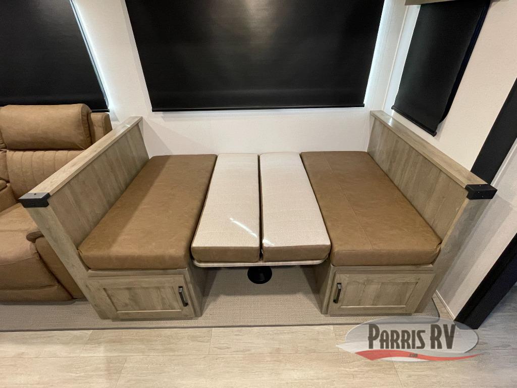 The large slide out in this trailer offers seating and sleeping space on a sofa sleeper and a booth dinette plus adds more floor space to the main living and kitchen area. The rear full bathroom has a 30" x 48" shower with a seat and a linen closet for towels and such, and the front bedroom includes a queen bed and clothing storage plus windows for views of your campsite. And the chef of your group can make meals in the full kitchen, complete with a cooktop, microwave and electric refrigerator! The 21' power awning provides an outdoor living area protected from the elements, and the exterior offers a drop frame pass-thru for ample storage space!