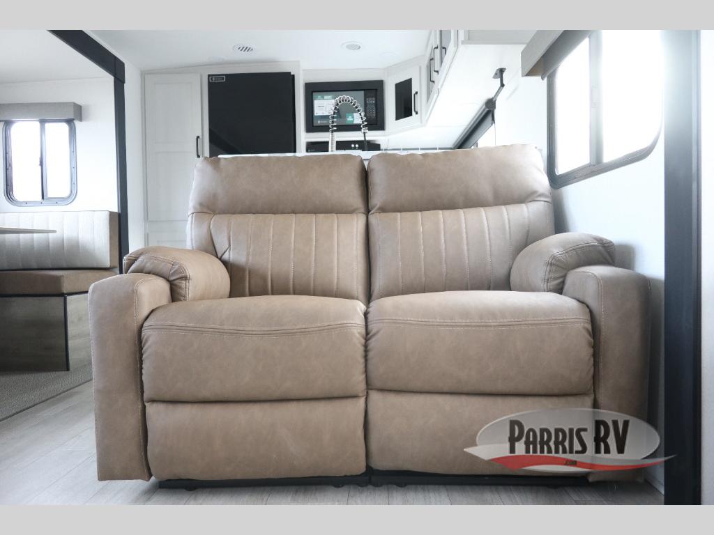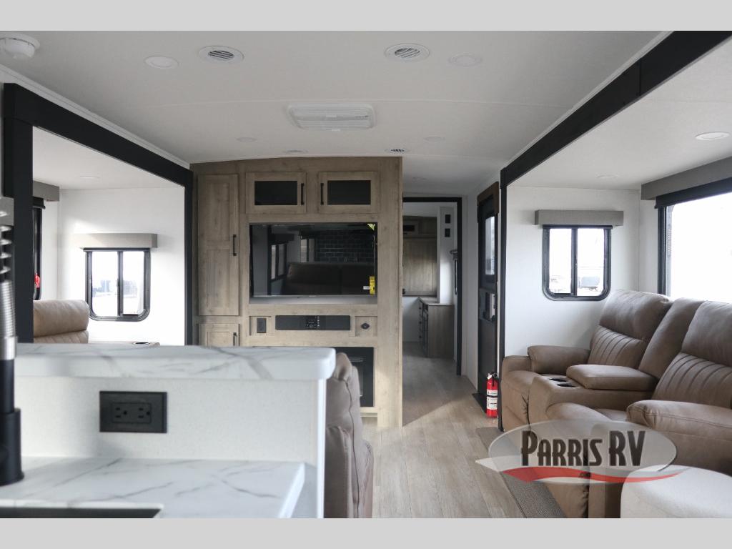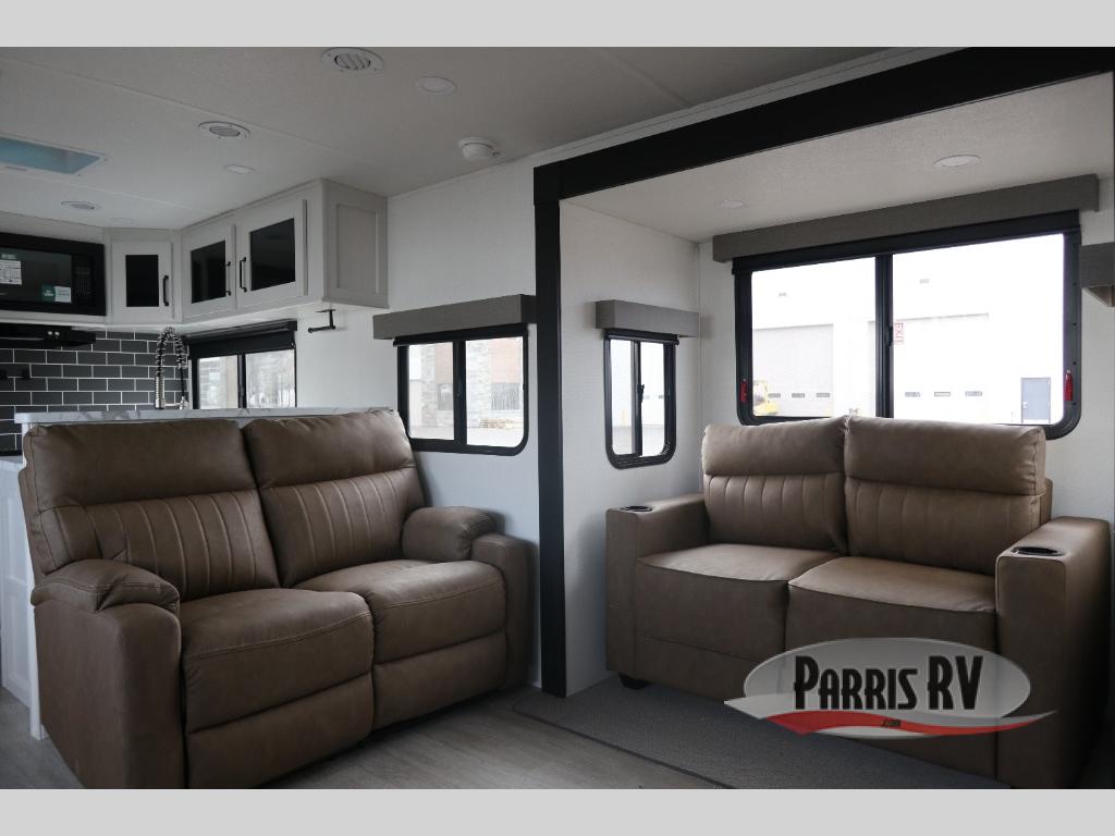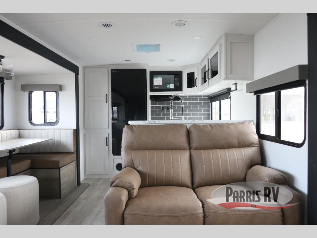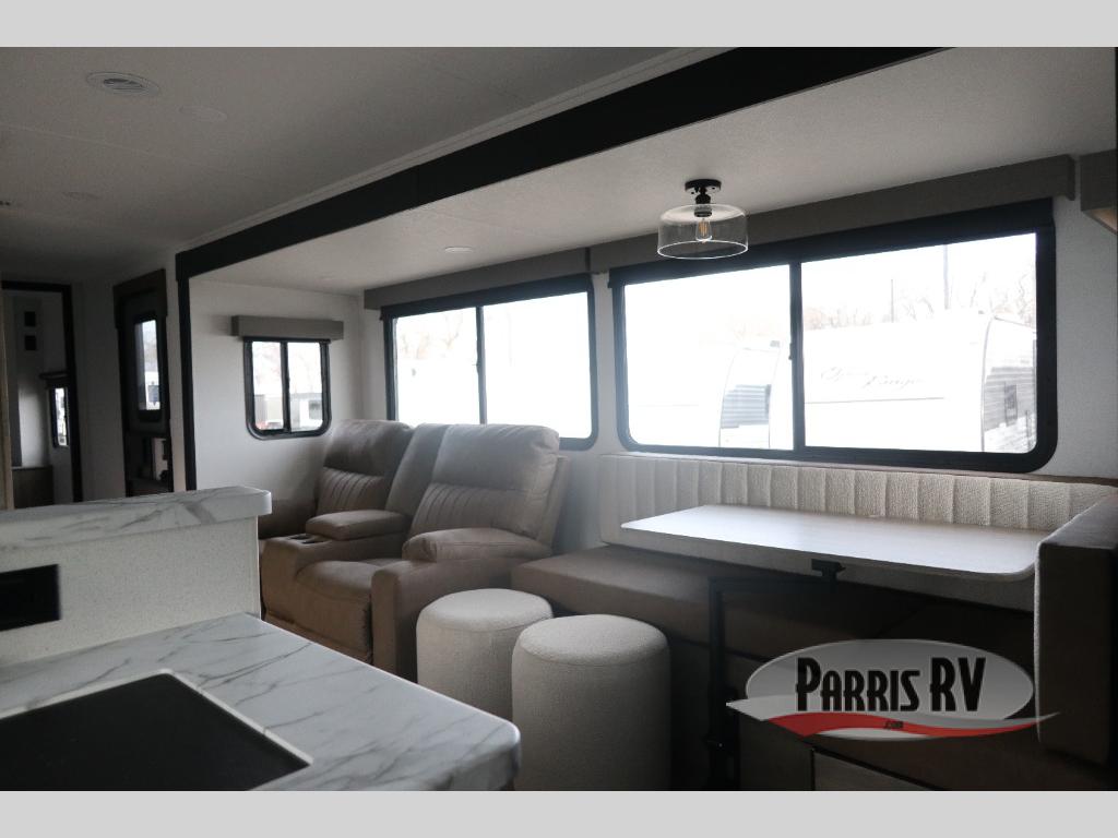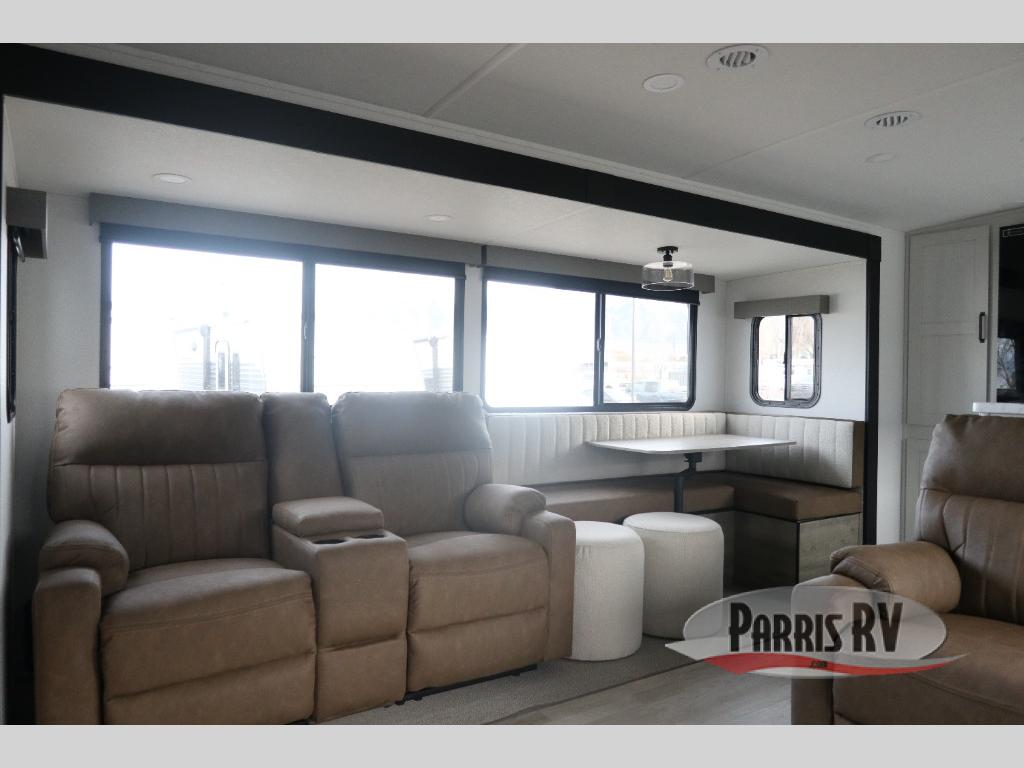 One look at this spacious travel trailer and you'll be sold! The rear kitchen features a U-shaped counter, an 11-cu. ft. refrigerator, plus a pantry for dry goods and snacks. There is a 1/2 dinette with bench seating, plus a tri-fold sofa and two theater seats. Everyone can take turns cleaning up in the full bath that includes a shower with a seat, then head outdoors to relax under the patio awnings with LED lights. When it's time for bed, you will enjoy the king bed slide out in the front bedroom. You'll also find a dresser and a closet here, plus a wardrobe with washer and dryer prep if you choose to add those appliances!