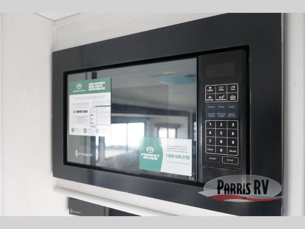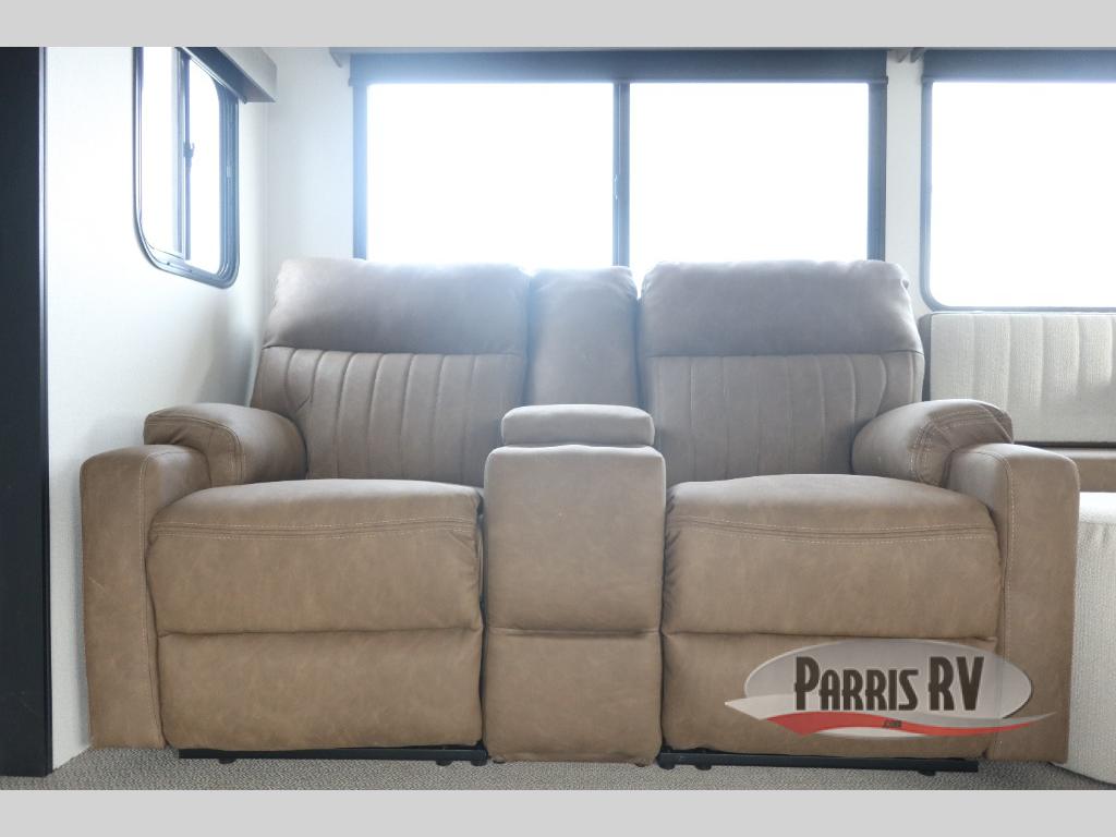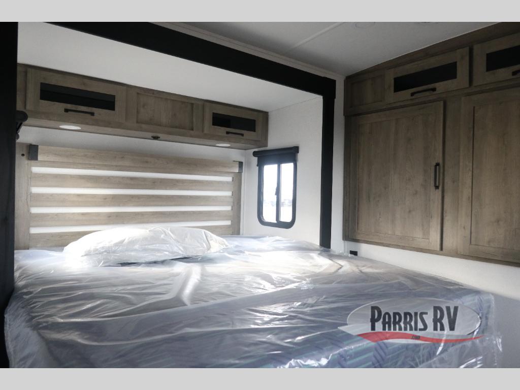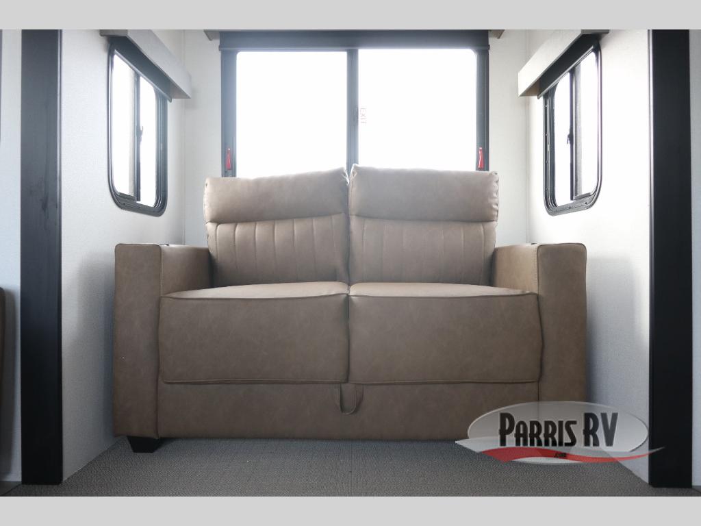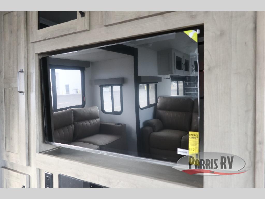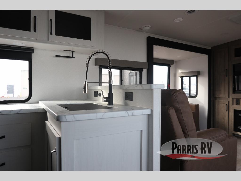 One look at this spacious travel trailer and you'll be sold! The rear kitchen features a U-shaped counter, an 11-cu. ft. refrigerator, plus a pantry for dry goods and snacks. There is a 1/2 dinette with bench seating, plus a tri-fold sofa and two theater seats. Everyone can take turns cleaning up in the full bath that includes a shower with a seat, then head outdoors to relax under the patio awnings with LED lights. When it's time for bed, you will enjoy the king bed slide out in the front bedroom. You'll also find a dresser and a closet here, plus a wardrobe with washer and dryer prep if you choose to add those appliances!