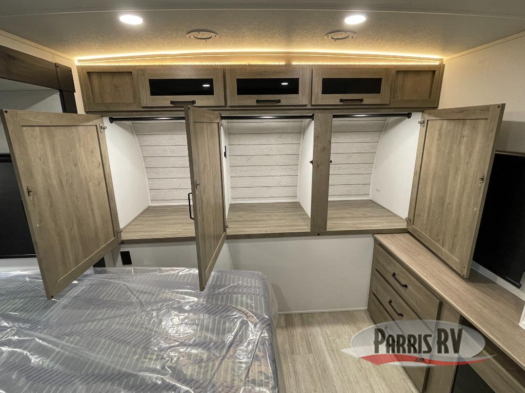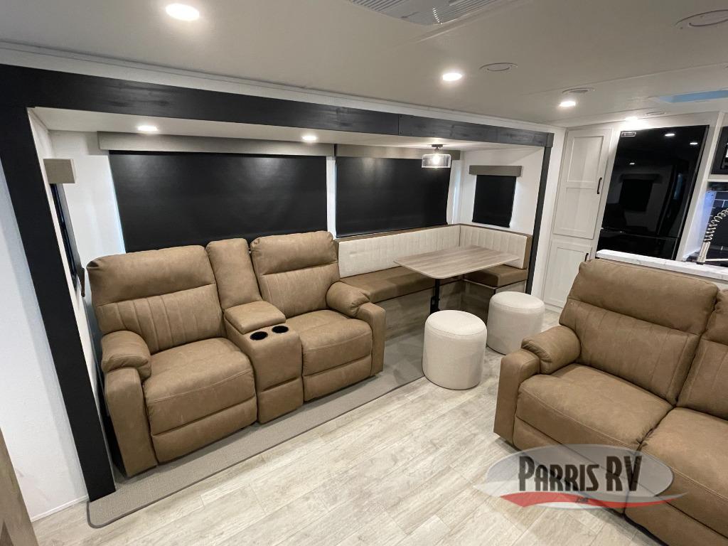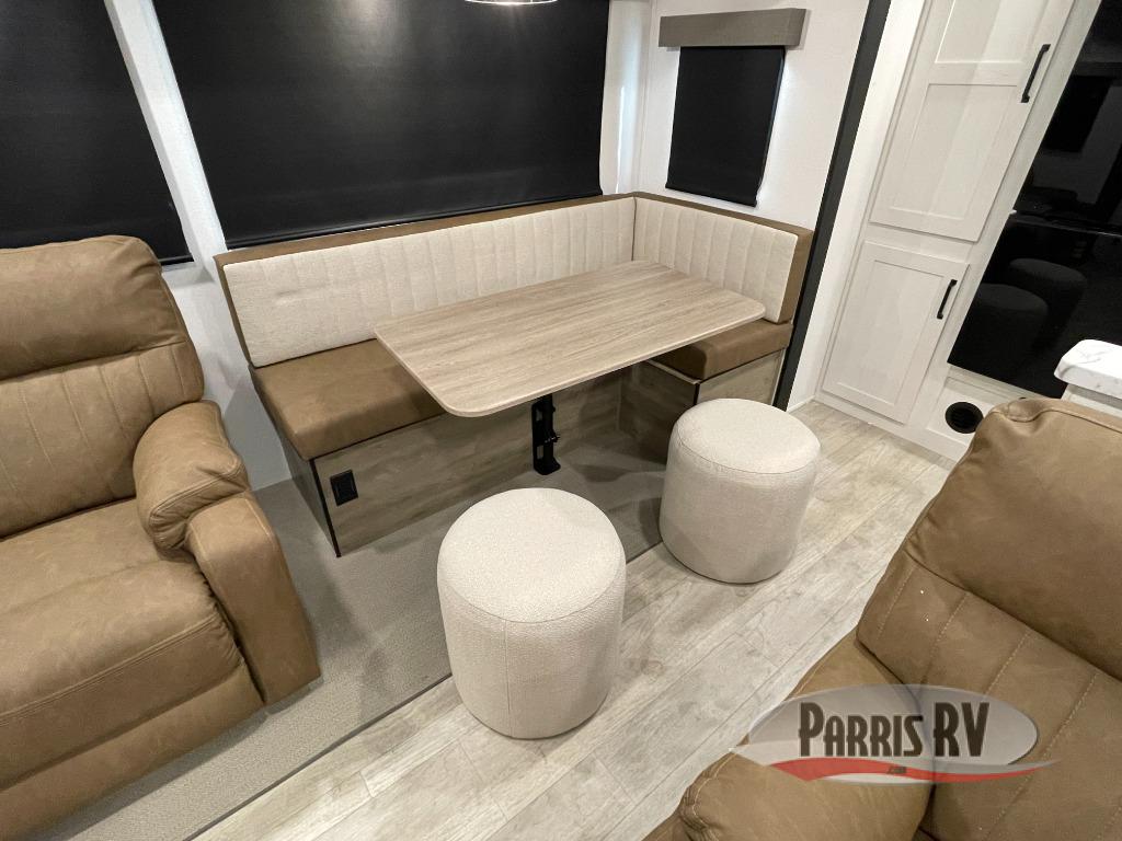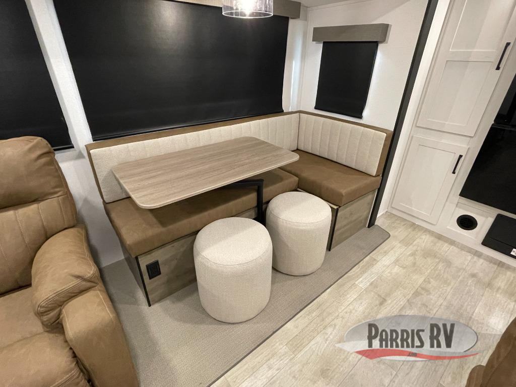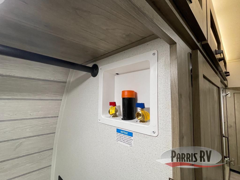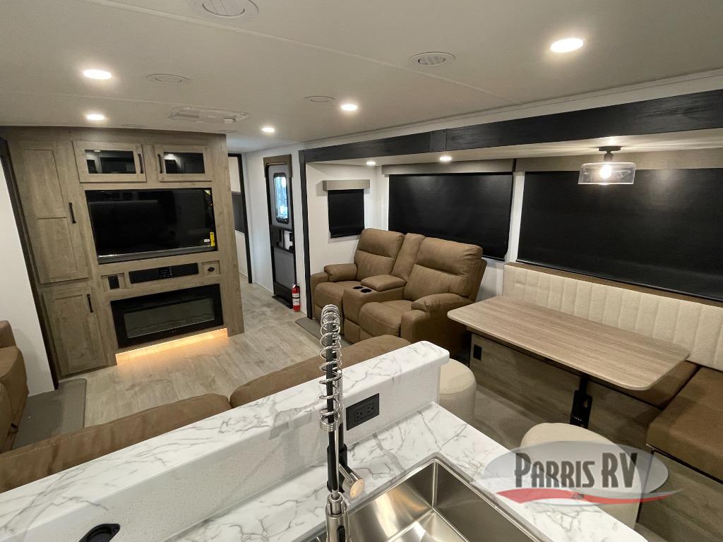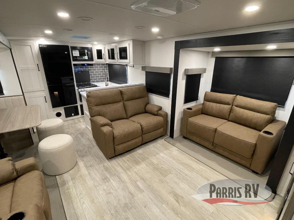 One look at this spacious travel trailer and you'll be sold! The rear kitchen features a U-shaped counter, an 11-cu. ft. refrigerator, plus a pantry for dry goods and snacks. There is a 1/2 dinette with bench seating, plus a tri-fold sofa and two theater seats. Everyone can take turns cleaning up in the full bath that includes a shower with a seat, then head outdoors to relax under the patio awnings with LED lights. When it's time for bed, you will enjoy the king bed slide out in the front bedroom. You'll also find a dresser and a closet here, plus a wardrobe with washer and dryer prep if you choose to add those appliances!