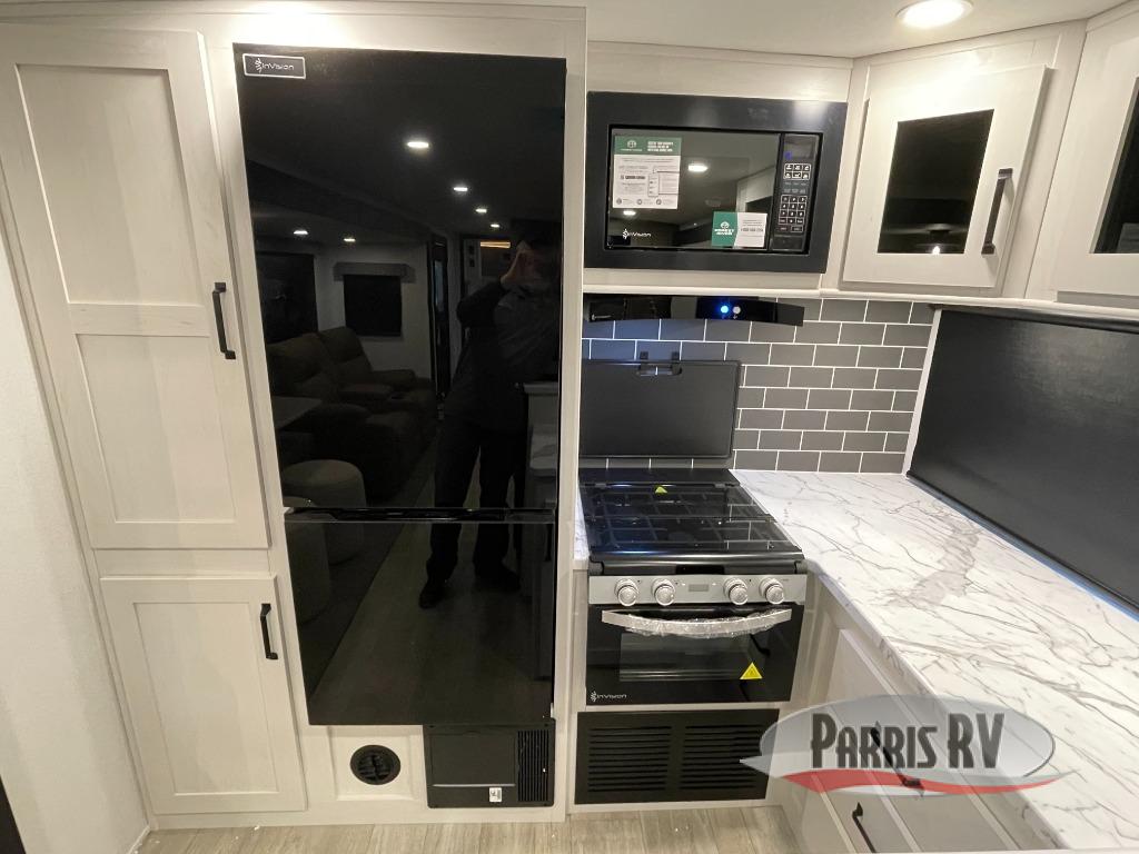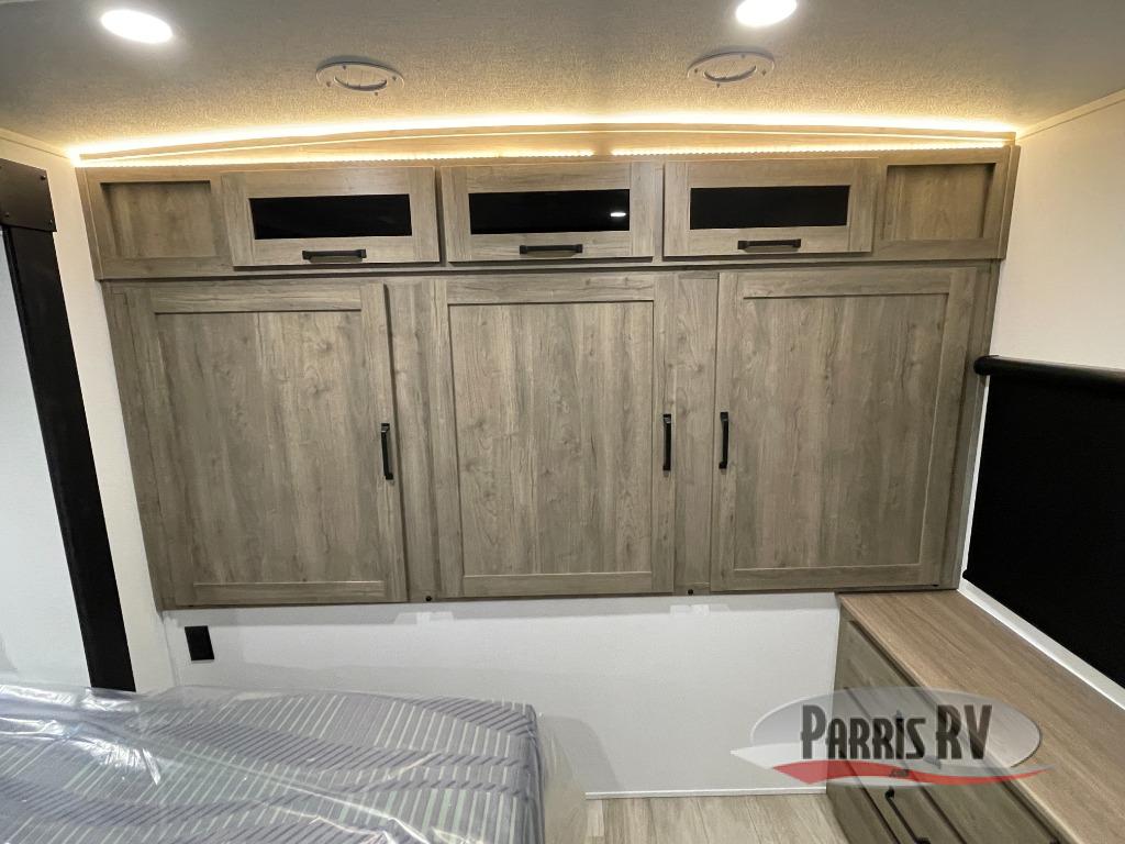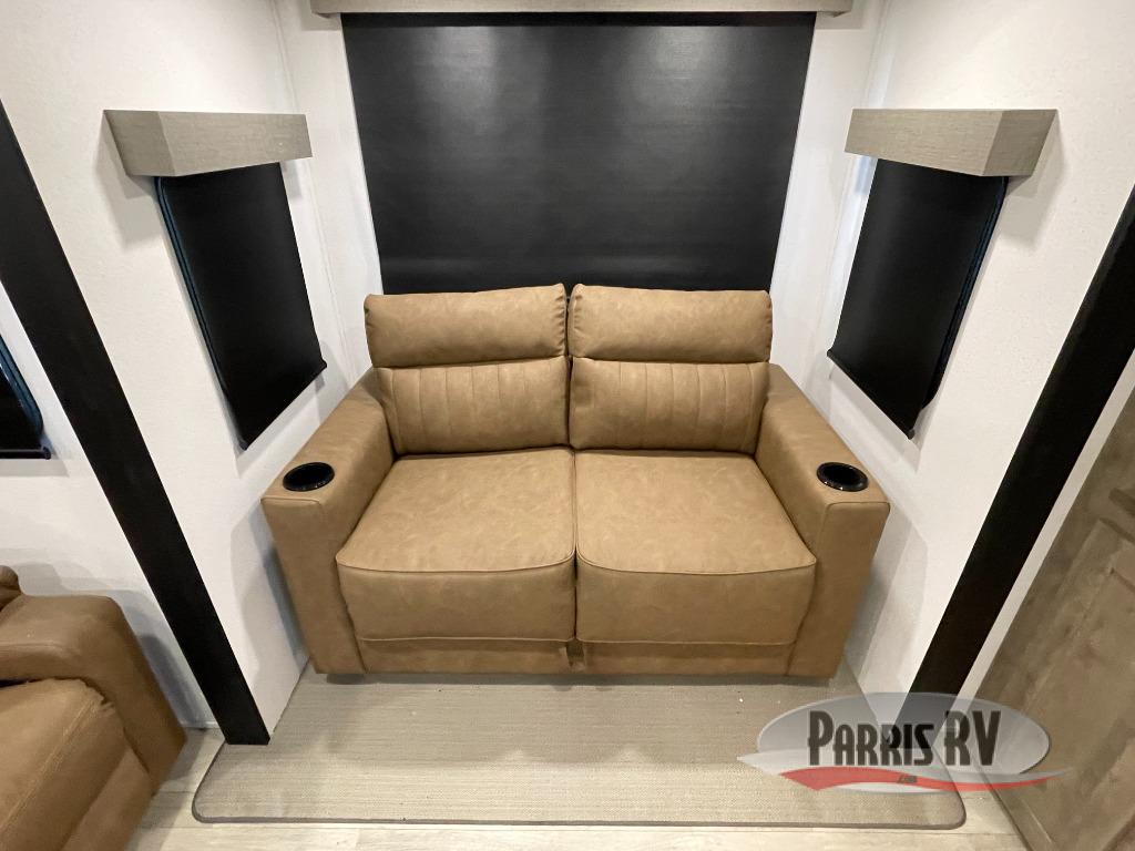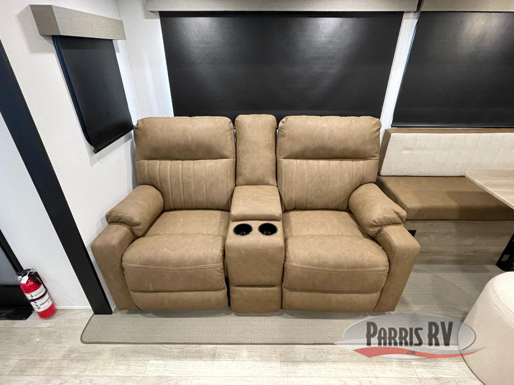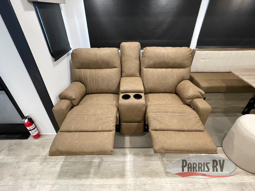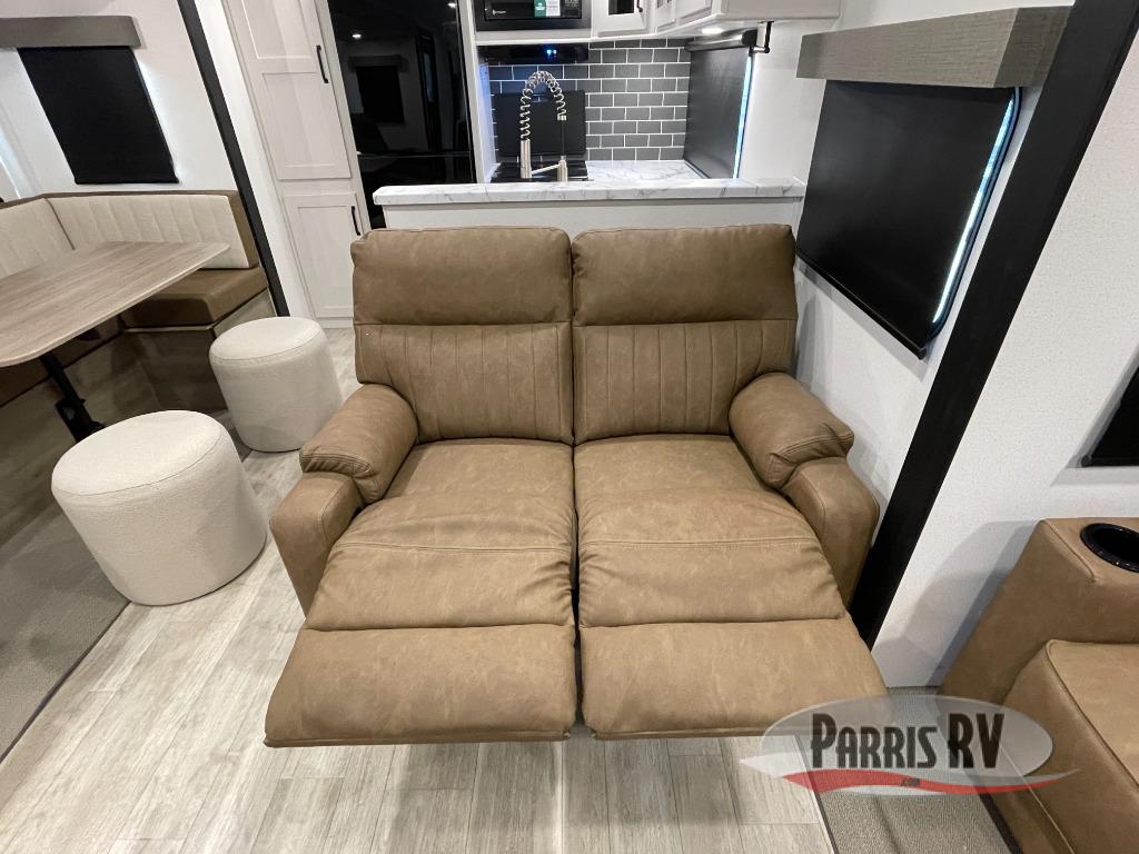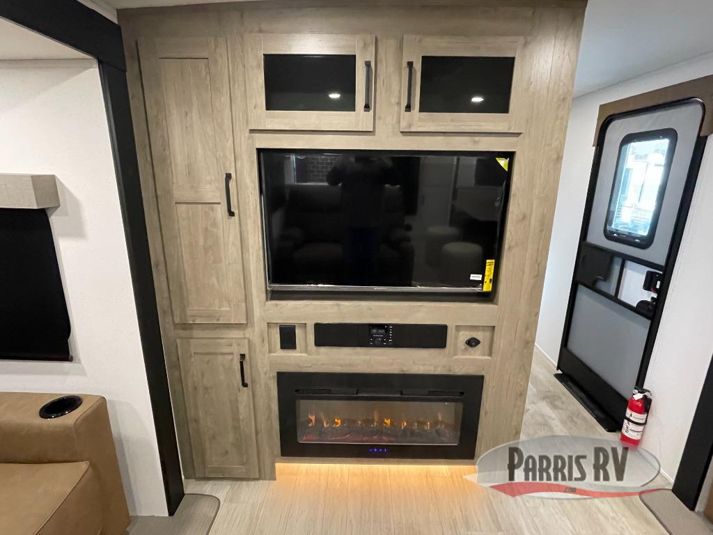 One look at this spacious travel trailer and you'll be sold! The rear kitchen features a U-shaped counter, an 11-cu. ft. refrigerator, plus a pantry for dry goods and snacks. There is a 1/2 dinette with bench seating, plus a tri-fold sofa and two theater seats. Everyone can take turns cleaning up in the full bath that includes a shower with a seat, then head outdoors to relax under the patio awnings with LED lights. When it's time for bed, you will enjoy the king bed slide out in the front bedroom. You'll also find a dresser and a closet here, plus a wardrobe with washer and dryer prep if you choose to add those appliances!