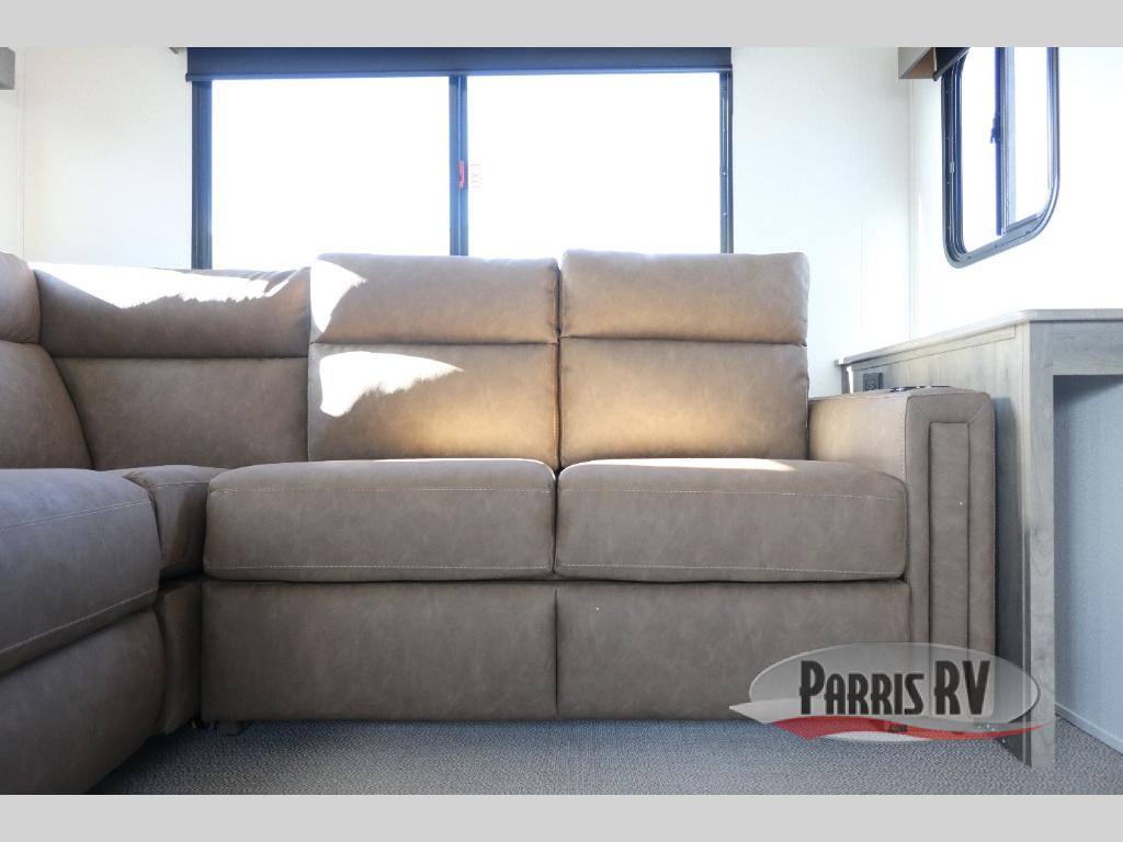 This travel trailer will feel just like home with its front living area, master bedroom, and triple slides for more space! You'll enjoy the L-shaped sofa with a tri-fold on one end and theater seats on the other. And there is a front entertainment center with a TV and fireplace to make it cozier. A middle kitchen includes all the appliances to make meals each day, plus an electric refrigerator and pantry for food storage. Head towards the back to find the master bedroom with a king bed slide out, dual wardrobes, and a desk with drawers if you need to get some work done. And the full rear bath is super accommodating with its dual bath sinks plus washer and dryer prep!