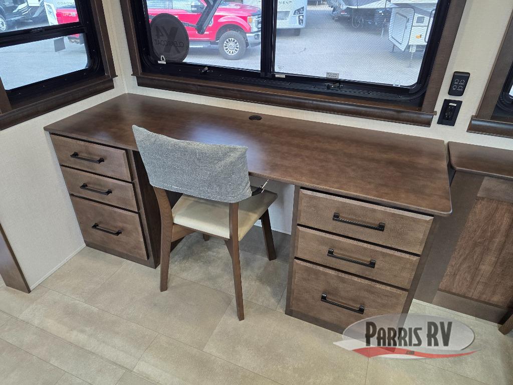 Show your family a good time with this RiverStone fifth wheel! You will get to stay in a super comfortable master suite at the front of this unit which has a dual-sink vanity in the full bathroom. The bedroom offers you a king-size bed that you can rest on while you watch the 40" LED TV across from you, and there is a half bathroom just outside the bedroom for your friends or family to use. If you've decided to bring work with you on the road, you'll be grateful to find a desk in the living area, and the pull-out dinette is a great place to sit down for meals. Work your magic in the kitchen and prepare something delicious on the four-burner range for everyone to eat.