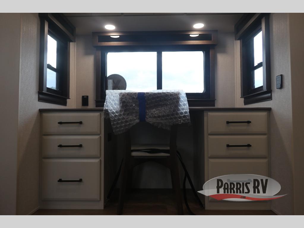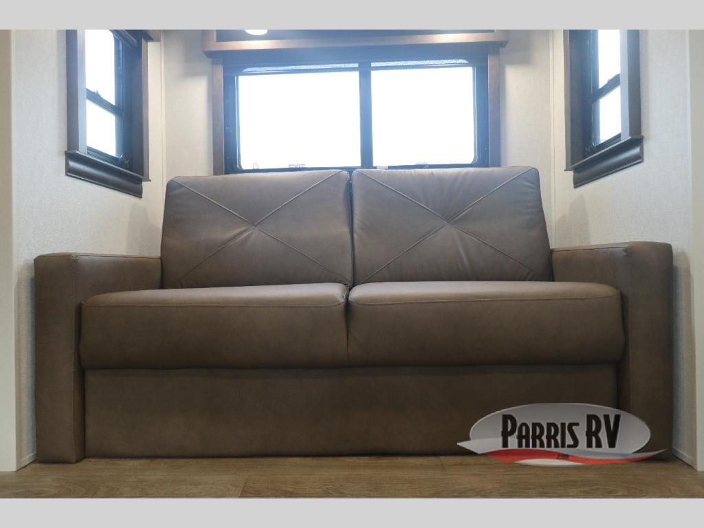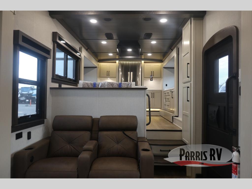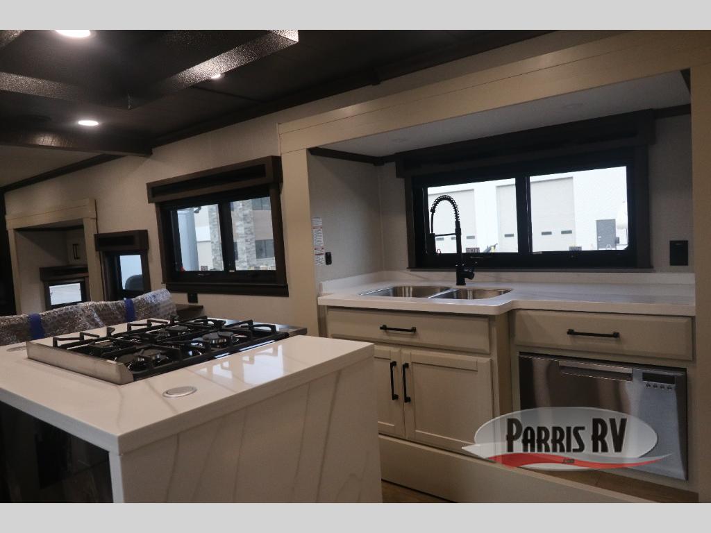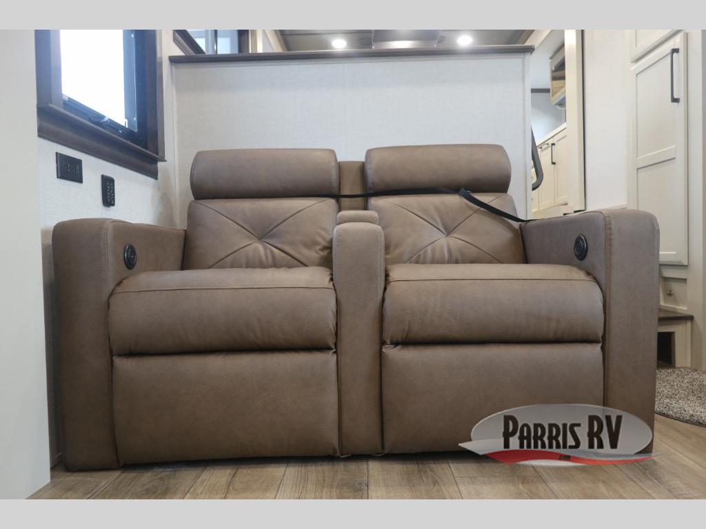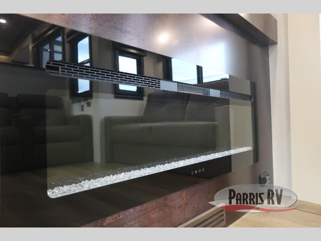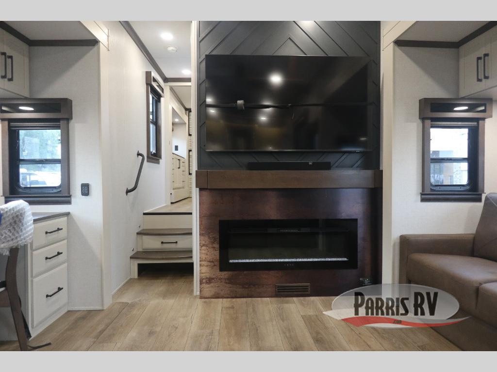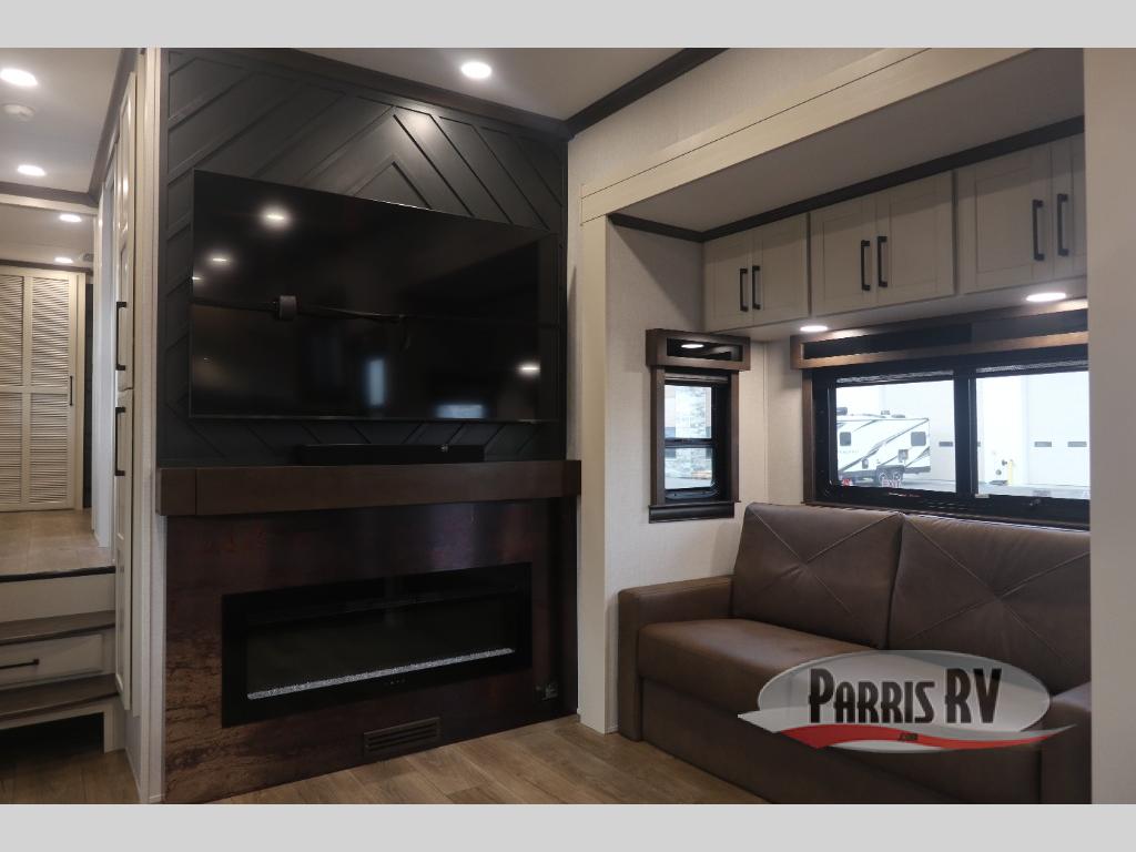You will feel right at home in this fifth wheel! The rear private bedroom has a 72" x 80" king bed slide for a good night's rest, a rear large wardrobe with the washer and dryer next to it, and even a dresser with a 40" LED TV. And two can get ready at once in the full bathroom with the dual sink vanity. You can then head to either the desk slide to get some work done or whip up some scrambled eggs on the three burner cooktop at the island in the front kitchen. The kitchen even has a dishwasher for easy clean up and two bar stools at the high top dinette that overlooks the middle living area. Relax each night in true comfort on either the E-Z Glide sofa bed slide or the theater seating across from the entertainment center which has a fireplace and 65" Samsung LED Smart TV to watch your favorite movies!