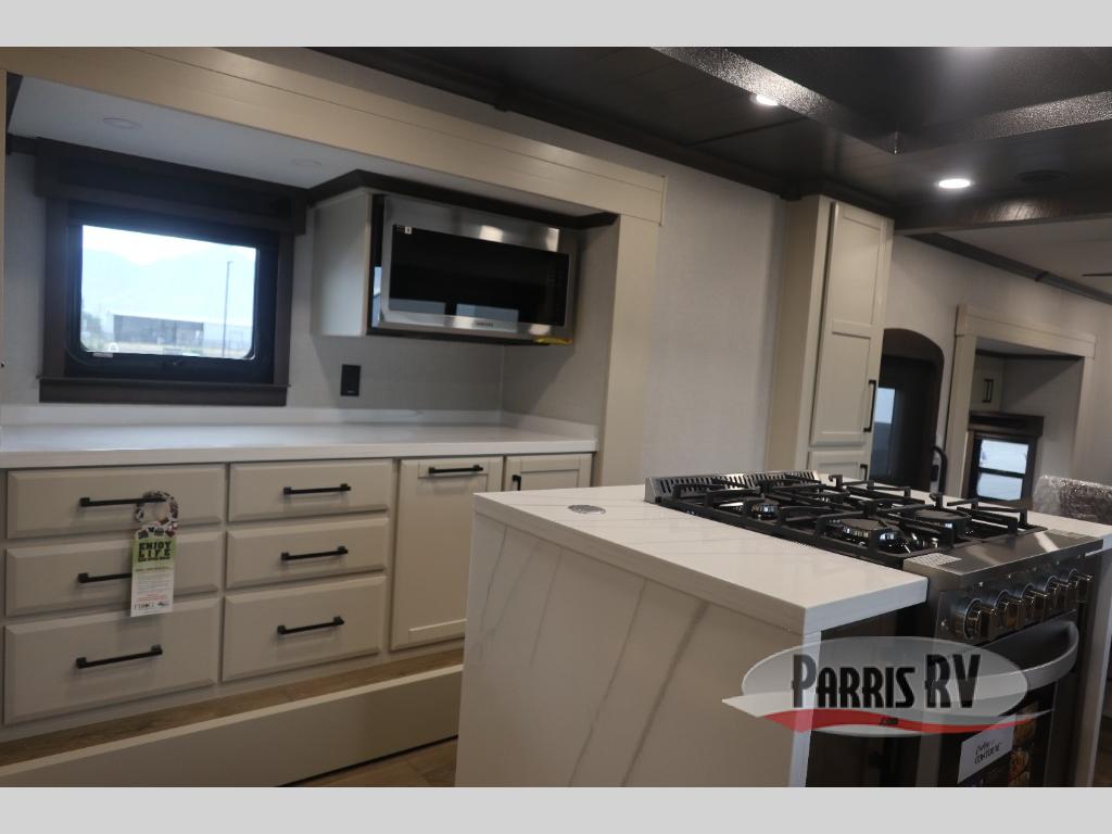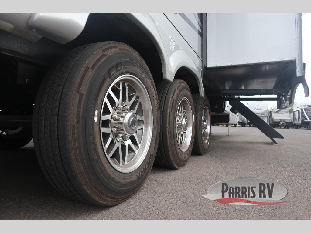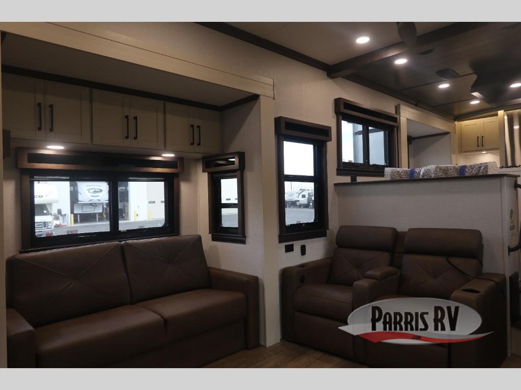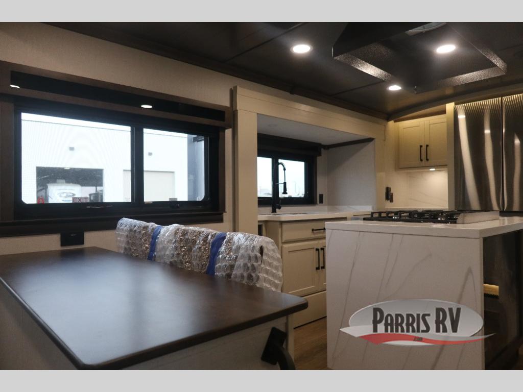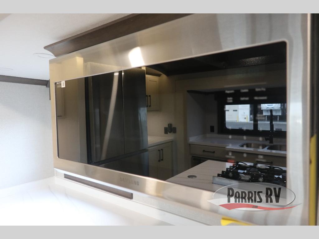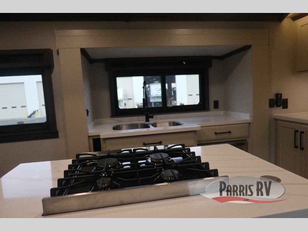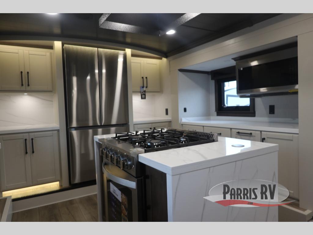 You will feel right at home in this fifth wheel! The rear private bedroom has a 72" x 80" king bed slide for a good night's rest, a rear large wardrobe with the washer and dryer next to it, and even a dresser with a 40" LED TV. And two can get ready at once in the full bathroom with the dual sink vanity. You can then head to either the desk slide to get some work done or whip up some scrambled eggs on the three burner cooktop at the island in the front kitchen. The kitchen even has a dishwasher for easy clean up and two bar stools at the high top dinette that overlooks the middle living area. Relax each night in true comfort on either the E-Z Glide sofa bed slide or the theater seating across from the entertainment center which has a fireplace and 65" Samsung LED Smart TV to watch your favorite movies!