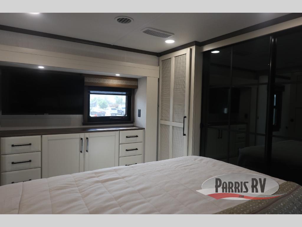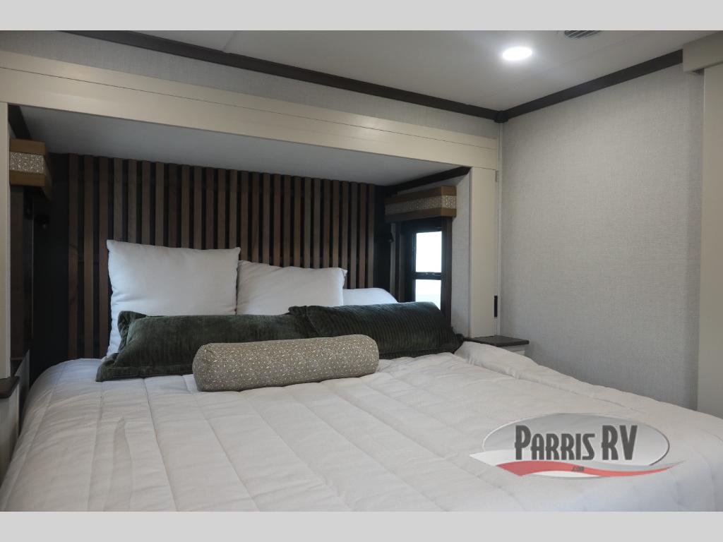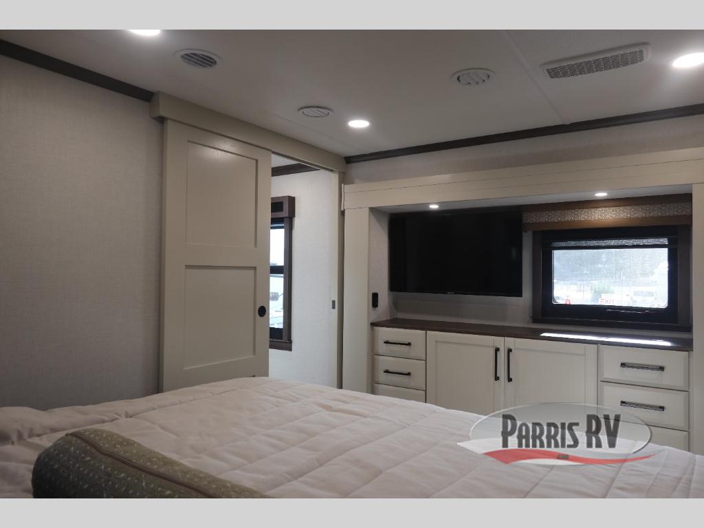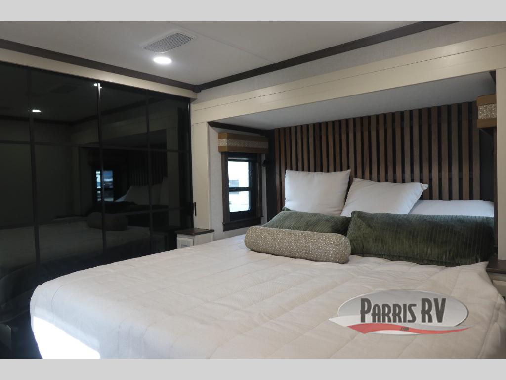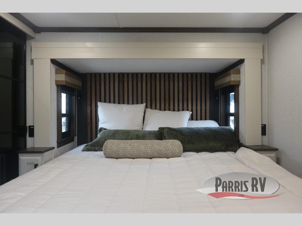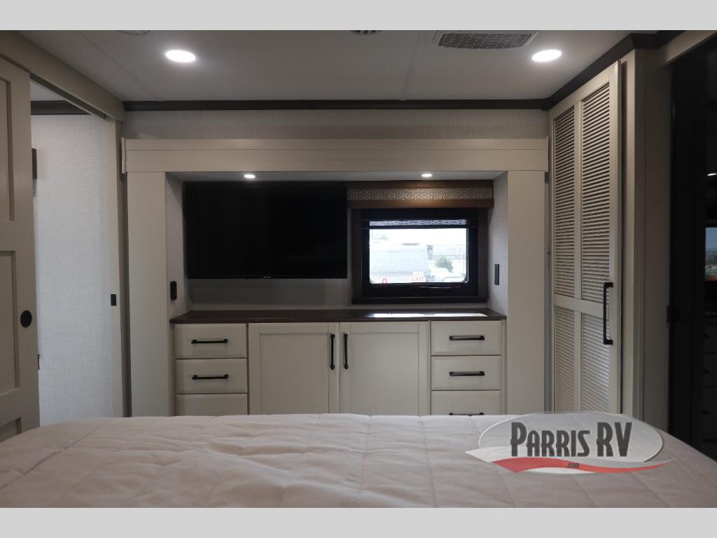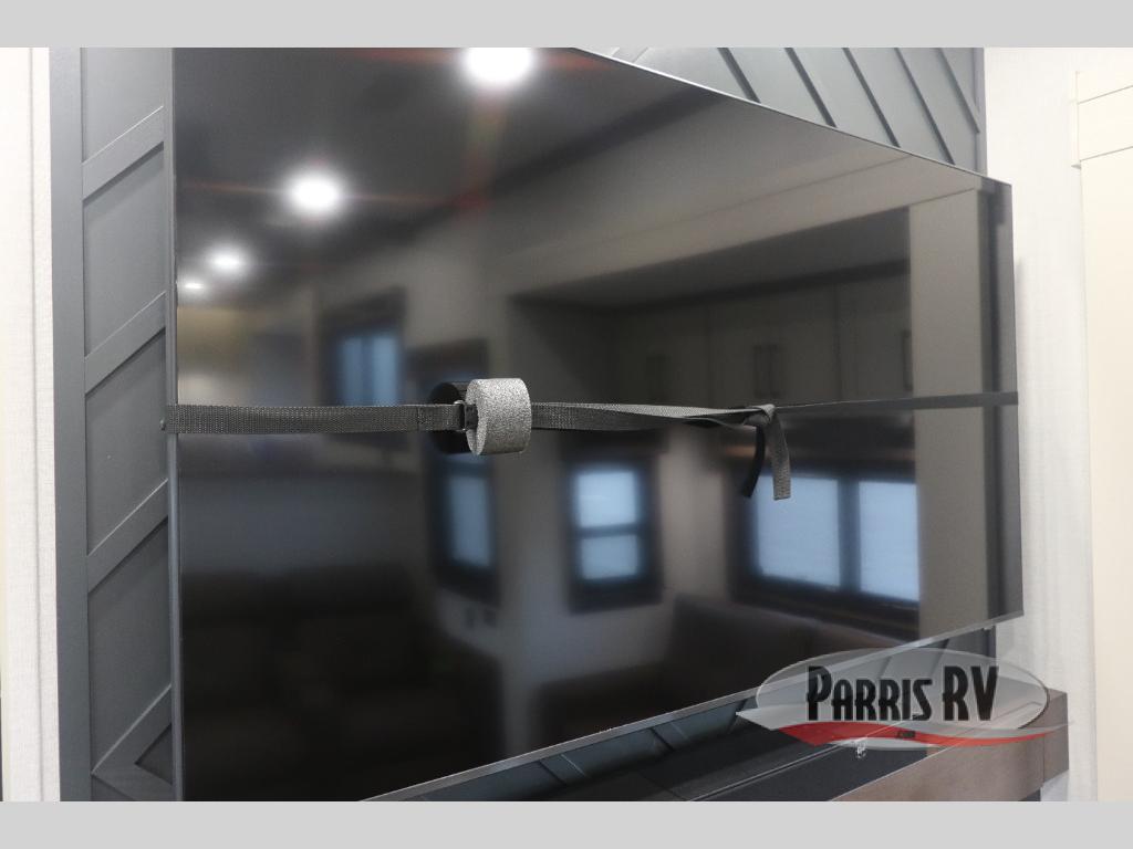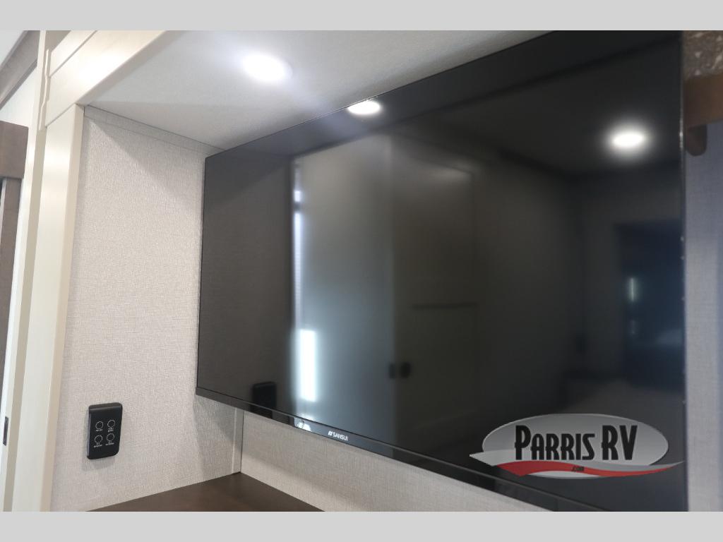You will feel right at home in this fifth wheel! The rear private bedroom has a 72" x 80" king bed slide for a good night's rest, a rear large wardrobe with the washer and dryer next to it, and even a dresser with a 40" LED TV. And two can get ready at once in the full bathroom with the dual sink vanity. You can then head to either the desk slide to get some work done or whip up some scrambled eggs on the three burner cooktop at the island in the front kitchen. The kitchen even has a dishwasher for easy clean up and two bar stools at the high top dinette that overlooks the middle living area. Relax each night in true comfort on either the E-Z Glide sofa bed slide or the theater seating across from the entertainment center which has a fireplace and 65" Samsung LED Smart TV to watch your favorite movies!