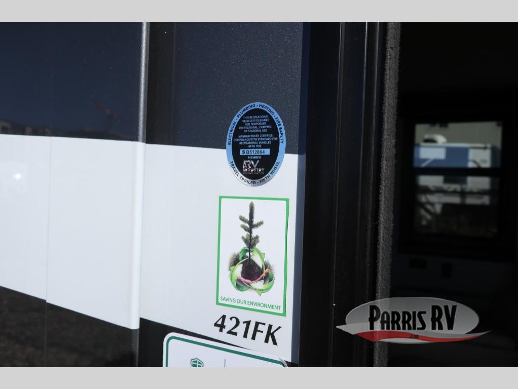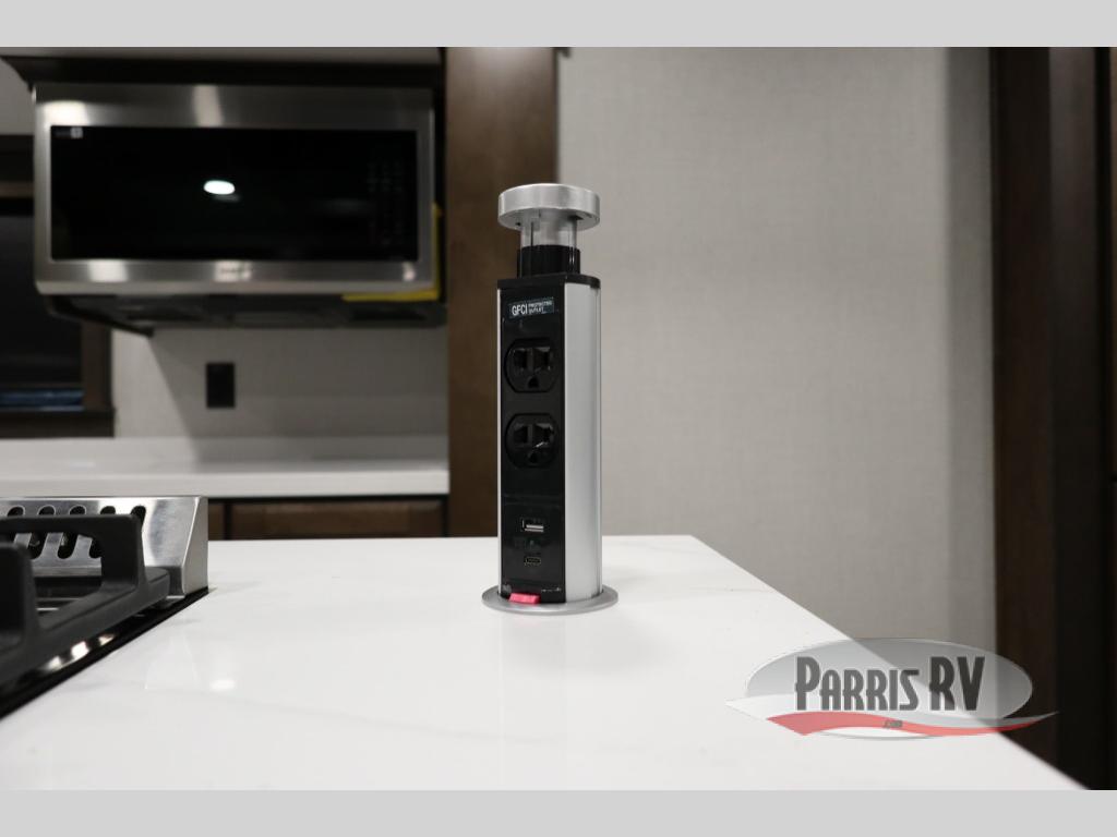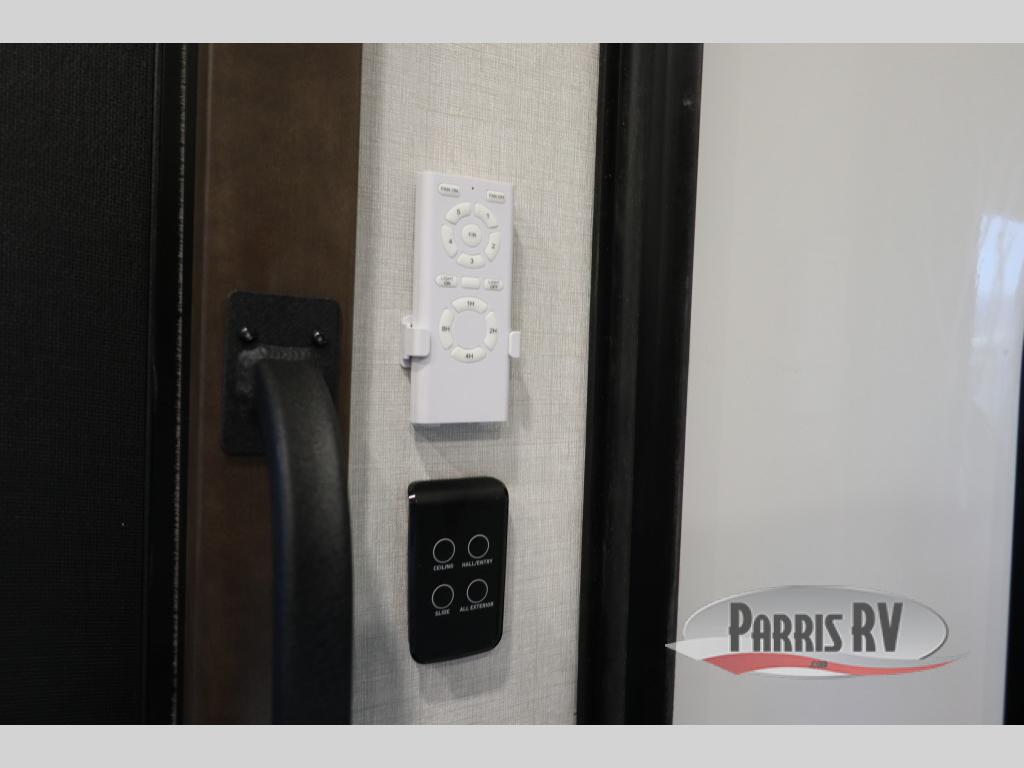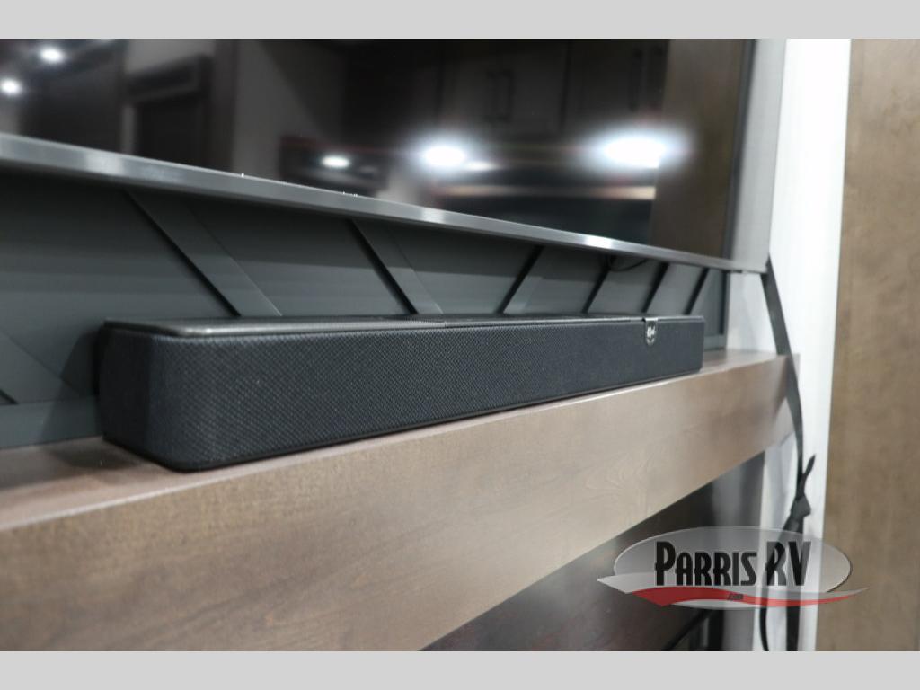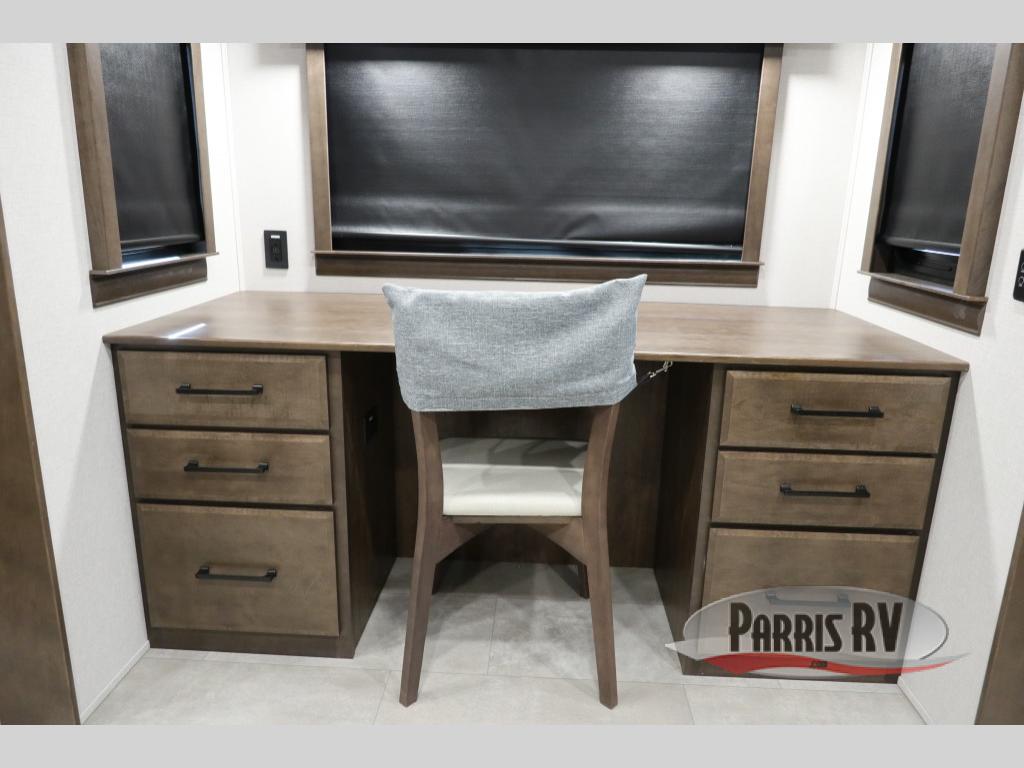 You will feel right at home in this fifth wheel! The rear private bedroom has a 72" x 80" king bed slide for a good night's rest, a rear large wardrobe with the washer and dryer next to it, and even a dresser with a 40" LED TV. And two can get ready at once in the full bathroom with the dual sink vanity. You can then head to either the desk slide to get some work done or whip up some scrambled eggs on the three burner cooktop at the island in the front kitchen. The kitchen even has a dishwasher for easy clean up and two bar stools at the high top dinette that overlooks the middle living area. Relax each night in true comfort on either the E-Z Glide sofa bed slide or the theater seating across from the entertainment center which has a fireplace and 65" Samsung LED Smart TV to watch your favorite movies!