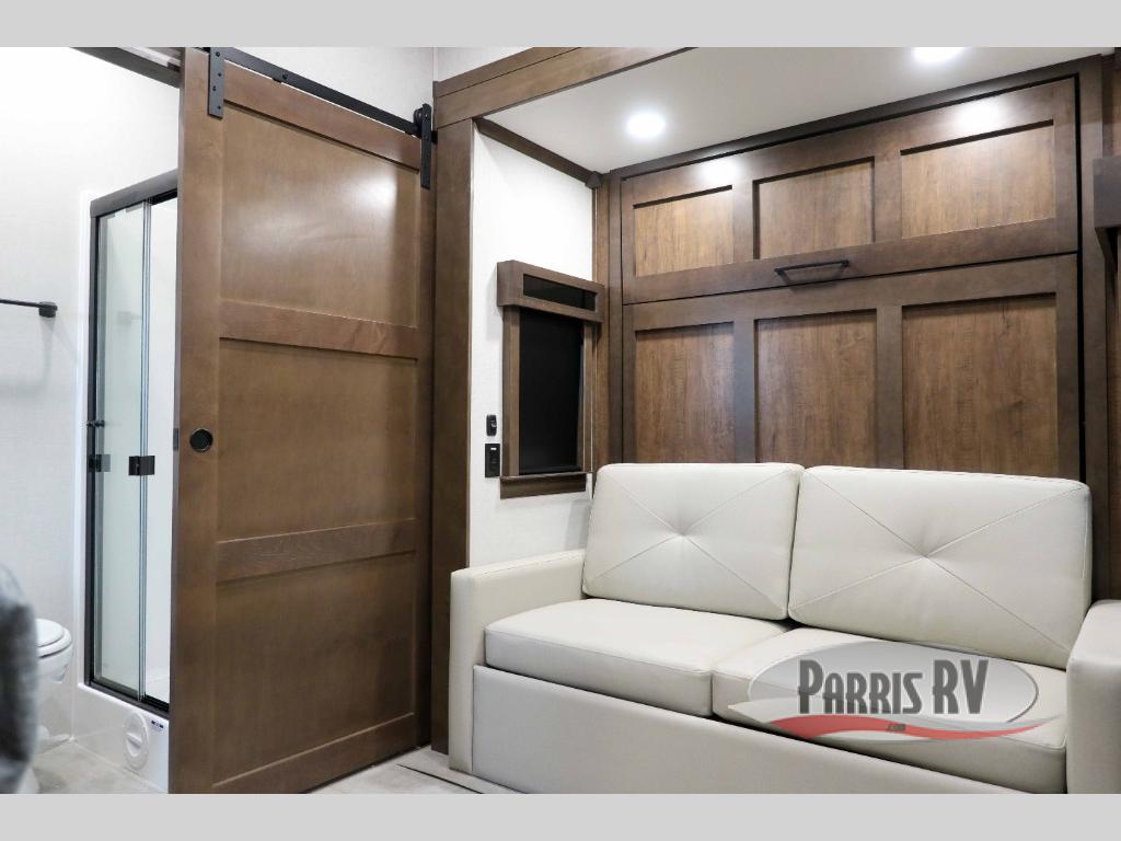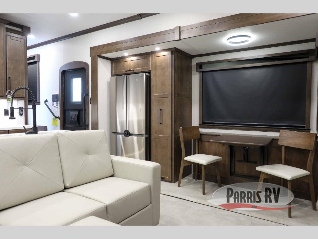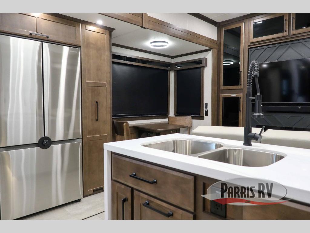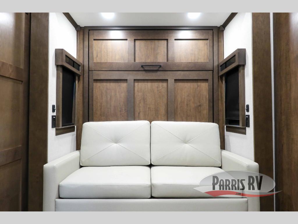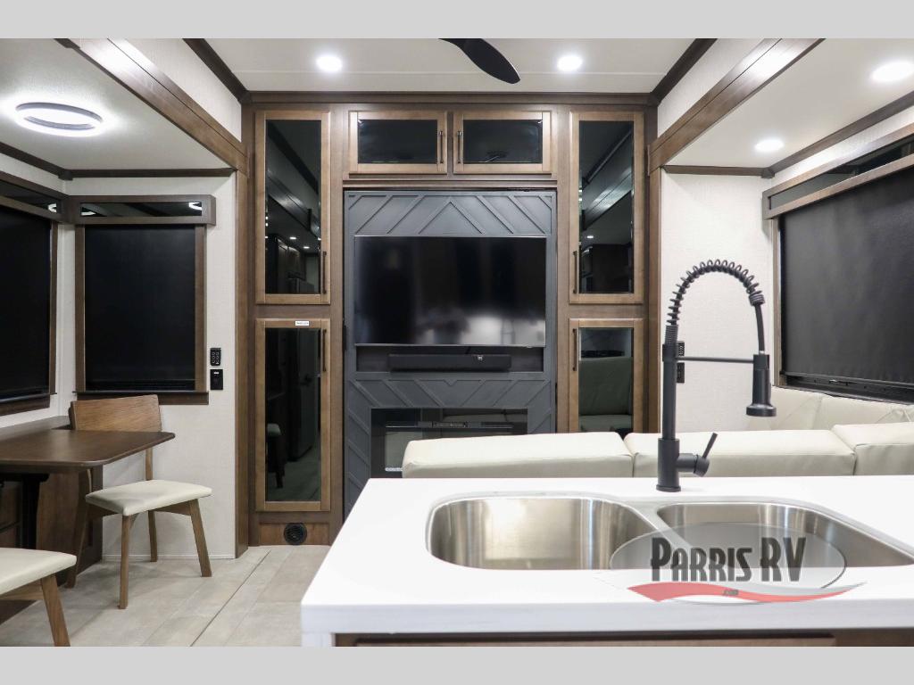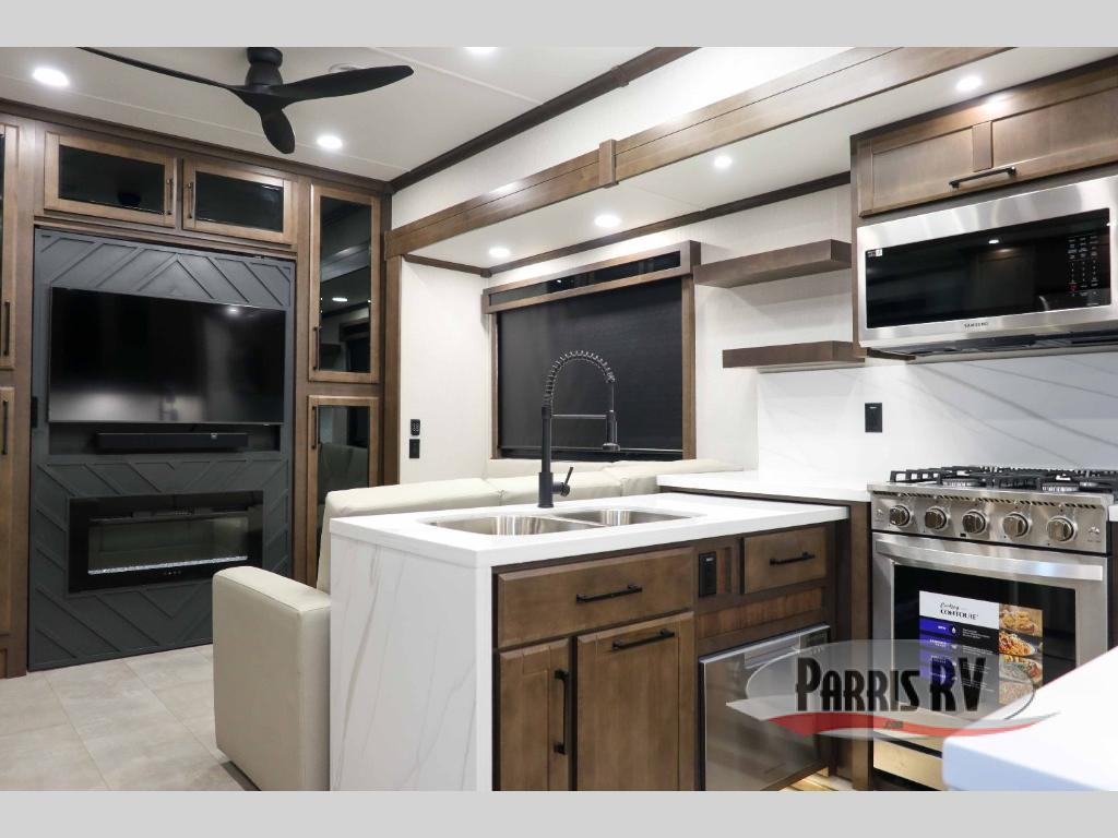 This is the perfect fifth wheel to travel with friends since there are two private bedrooms, one of which is a rear master with a full bath and its own exterior entry door. There is also a Murphy sofa here for your guests to sleep on, along with a wardrobe for their clothes and overhead storage. Head to the front private bedroom where you'll find a king bed slide, a dresser and a bench, a front wardrobe, plus a washer and dryer to make life at the campground easier than ever. The middle of this unit features the kitchen and living area. There is plenty of counter space plus a hutch and pantry for added storage. A sectional sofa provides tons of comfort, especially since its in perfect view of the fireplace and swinging entertainment center. There is also a dinette with four chairs where you can dine together and play a game of cards in the evening!