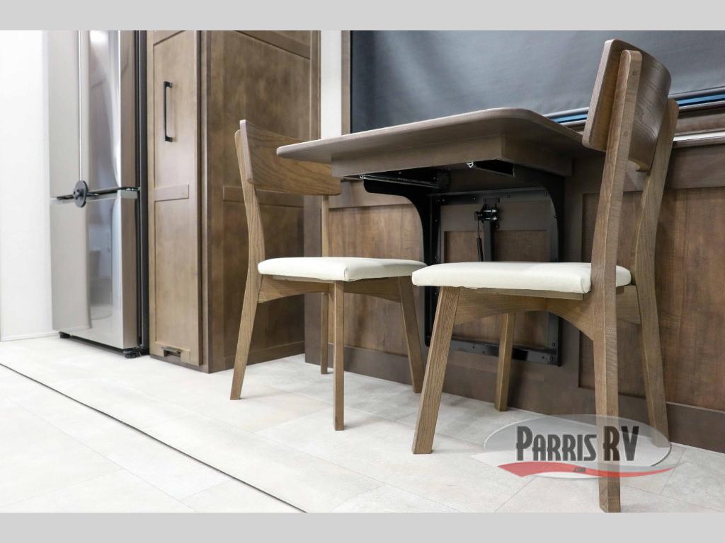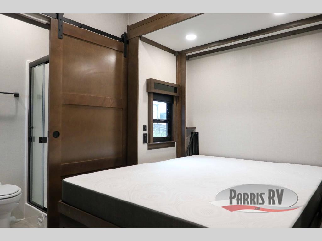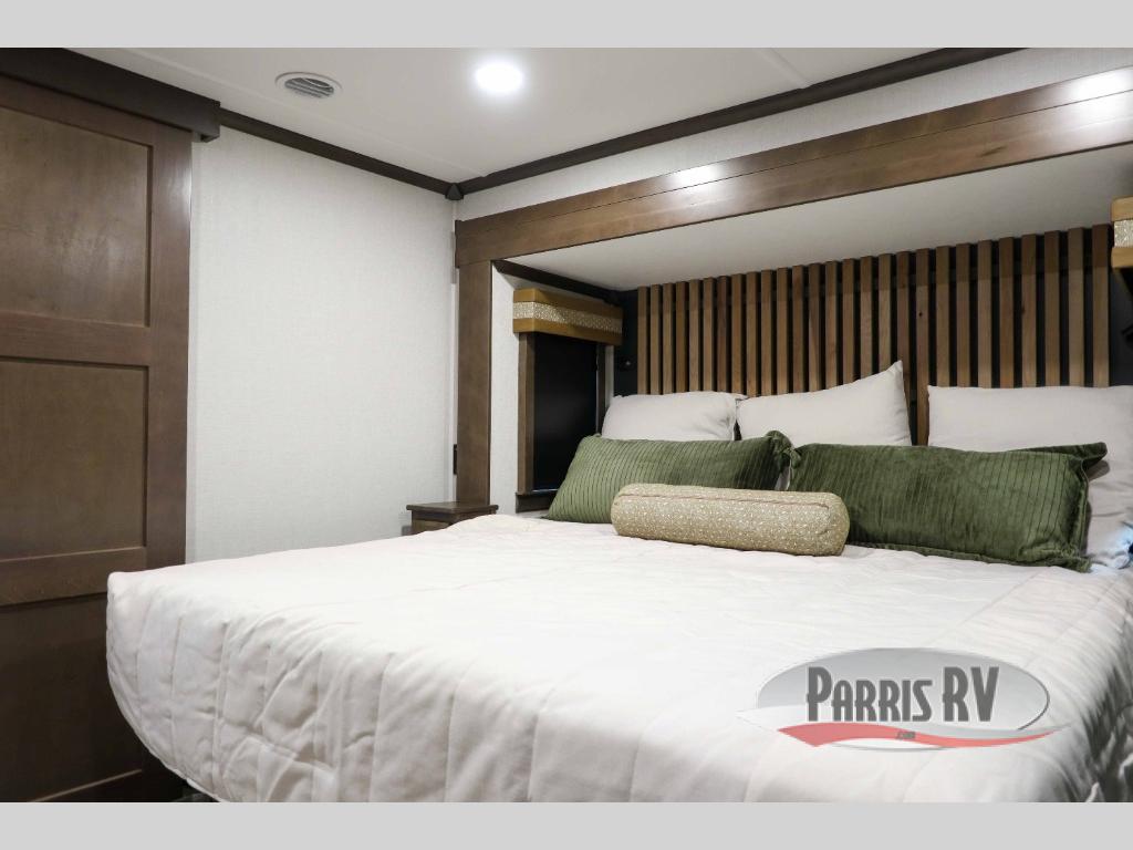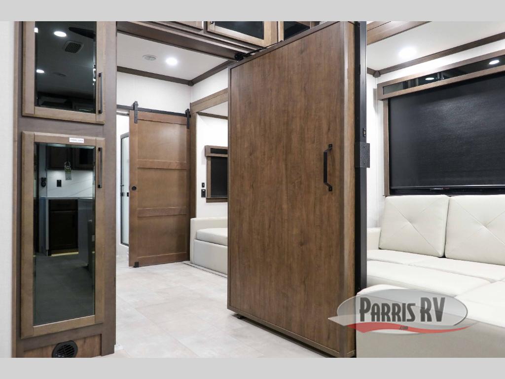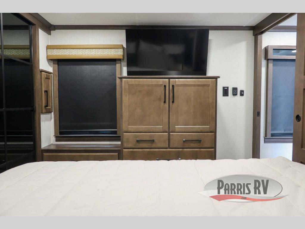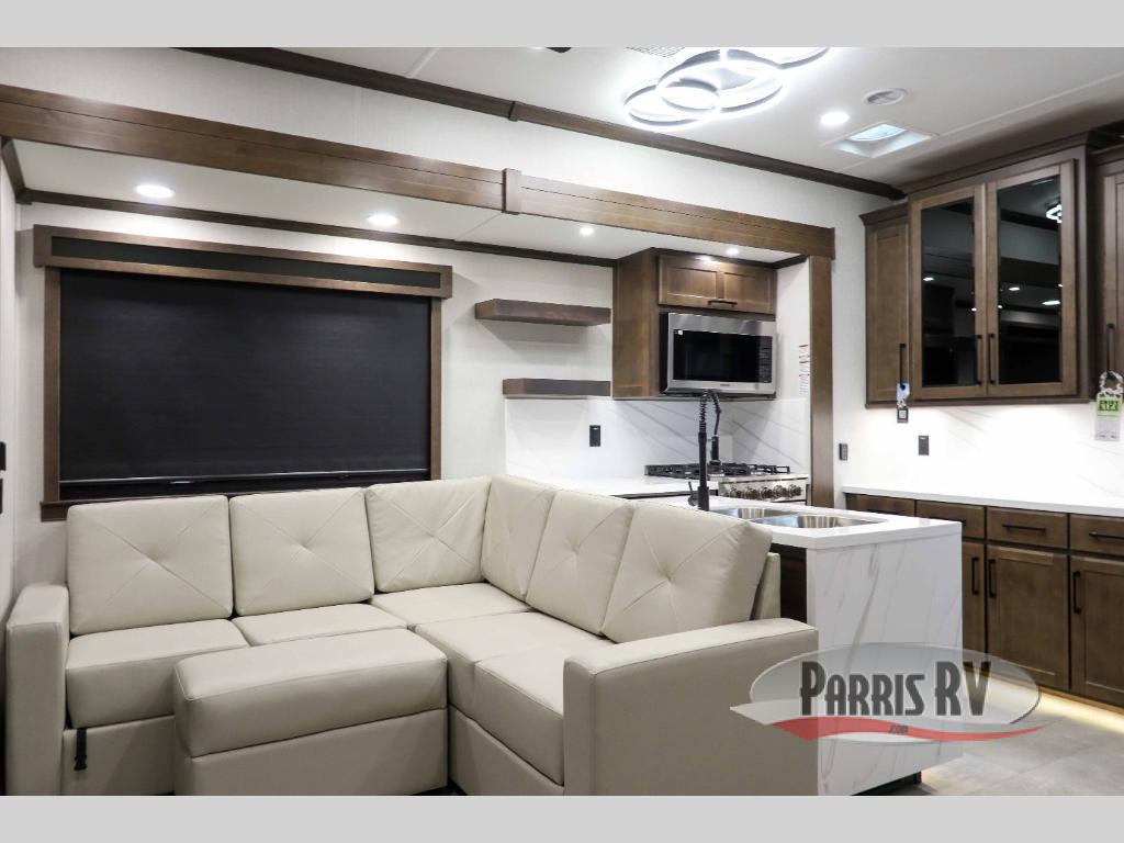 This is the perfect fifth wheel to travel with friends since there are two private bedrooms, one of which is a rear master with a full bath and its own exterior entry door. There is also a Murphy sofa here for your guests to sleep on, along with a wardrobe for their clothes and overhead storage. Head to the front private bedroom where you'll find a king bed slide, a dresser and a bench, a front wardrobe, plus a washer and dryer to make life at the campground easier than ever. The middle of this unit features the kitchen and living area. There is plenty of counter space plus a hutch and pantry for added storage. A sectional sofa provides tons of comfort, especially since its in perfect view of the fireplace and swinging entertainment center. There is also a dinette with four chairs where you can dine together and play a game of cards in the evening!
