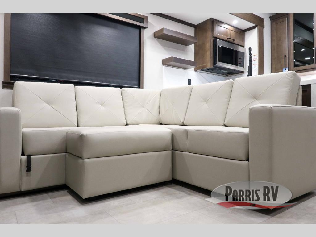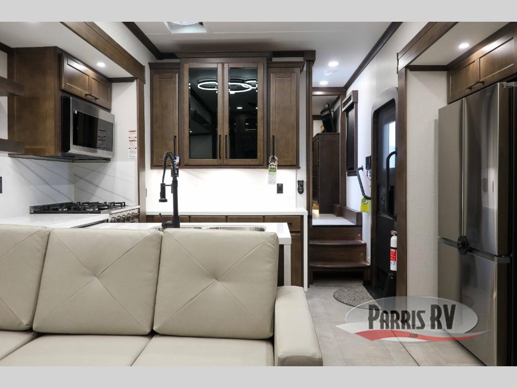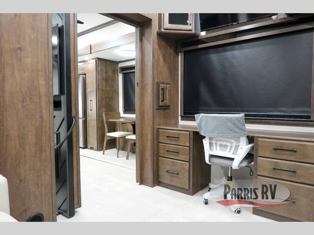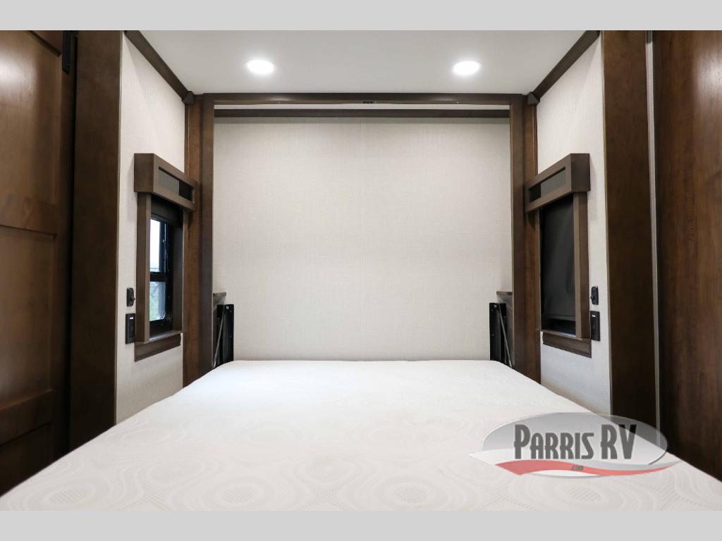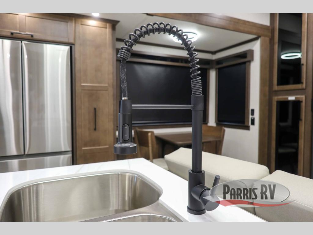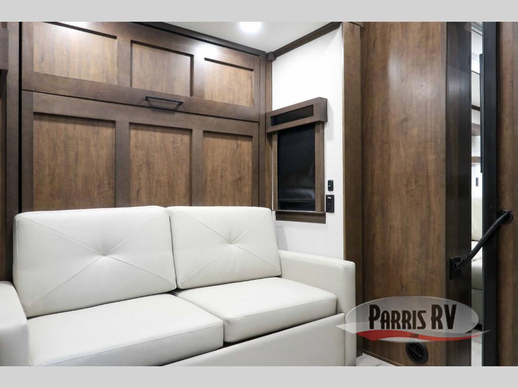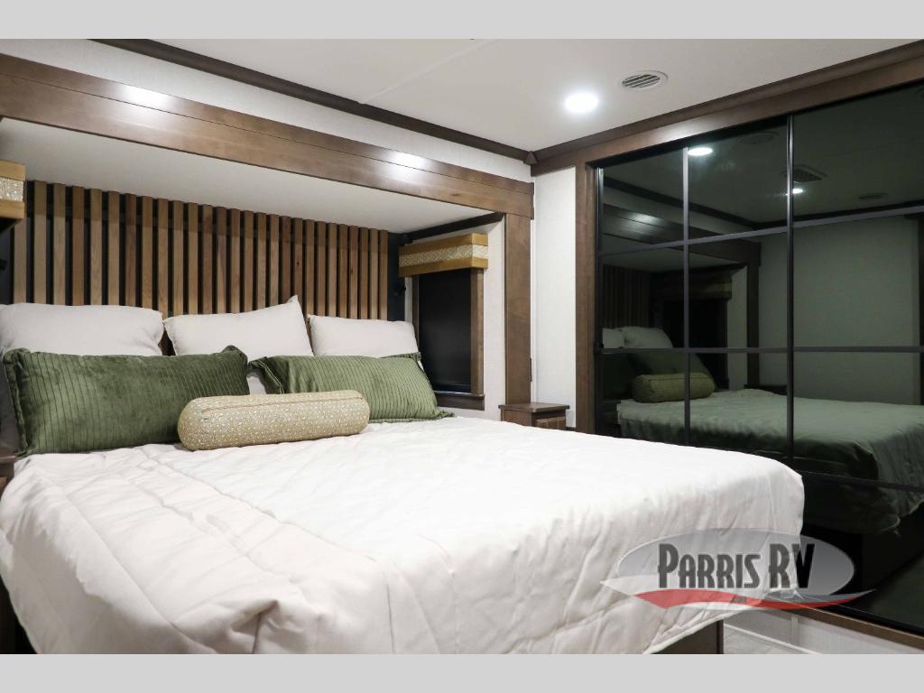 This is the perfect fifth wheel to travel with friends since there are two private bedrooms, one of which is a rear master with a full bath and its own exterior entry door. There is also a Murphy sofa here for your guests to sleep on, along with a wardrobe for their clothes and overhead storage. Head to the front private bedroom where you'll find a king bed slide, a dresser and a bench, a front wardrobe, plus a washer and dryer to make life at the campground easier than ever. The middle of this unit features the kitchen and living area. There is plenty of counter space plus a hutch and pantry for added storage. A sectional sofa provides tons of comfort, especially since its in perfect view of the fireplace and swinging entertainment center. There is also a dinette with four chairs where you can dine together and play a game of cards in the evening!