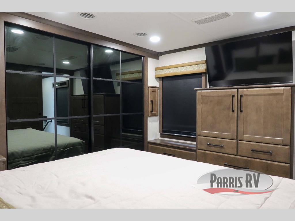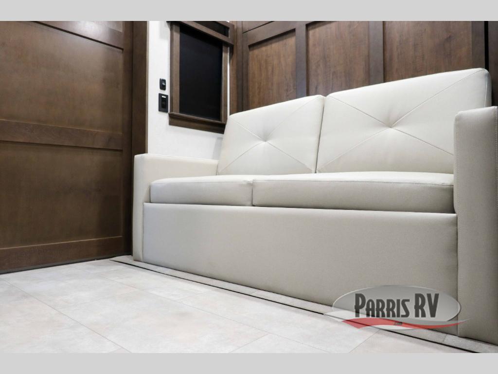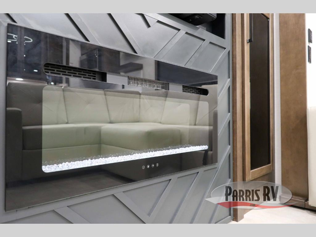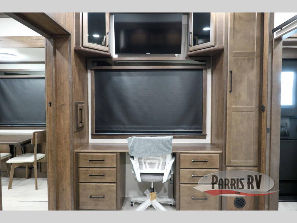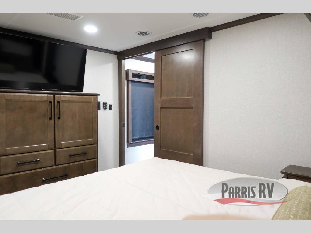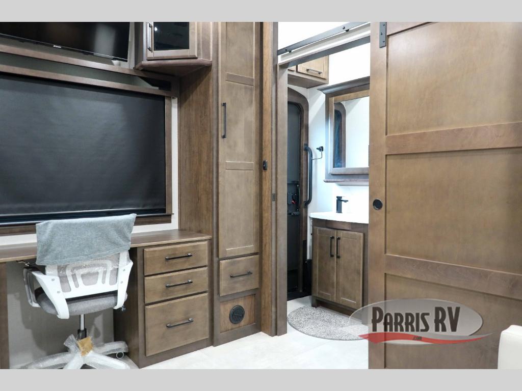 This is the perfect fifth wheel to travel with friends since there are two private bedrooms, one of which is a rear master with a full bath and its own exterior entry door. There is also a Murphy sofa here for your guests to sleep on, along with a wardrobe for their clothes and overhead storage. Head to the front private bedroom where you'll find a king bed slide, a dresser and a bench, a front wardrobe, plus a washer and dryer to make life at the campground easier than ever. The middle of this unit features the kitchen and living area. There is plenty of counter space plus a hutch and pantry for added storage. A sectional sofa provides tons of comfort, especially since its in perfect view of the fireplace and swinging entertainment center. There is also a dinette with four chairs where you can dine together and play a game of cards in the evening!