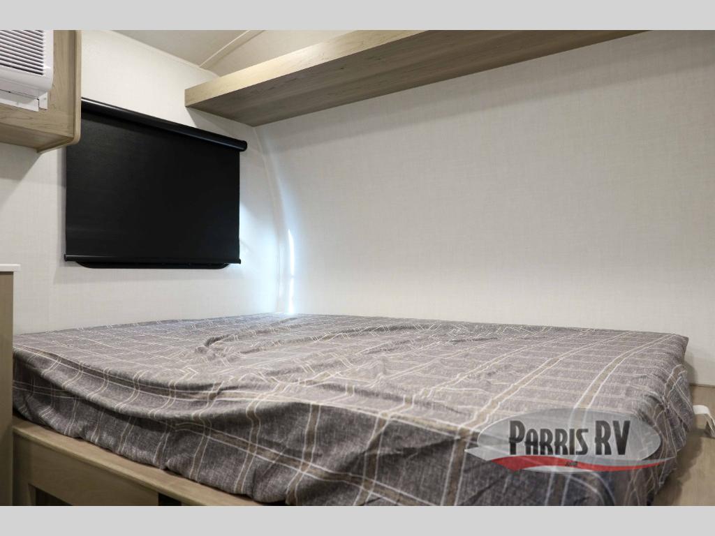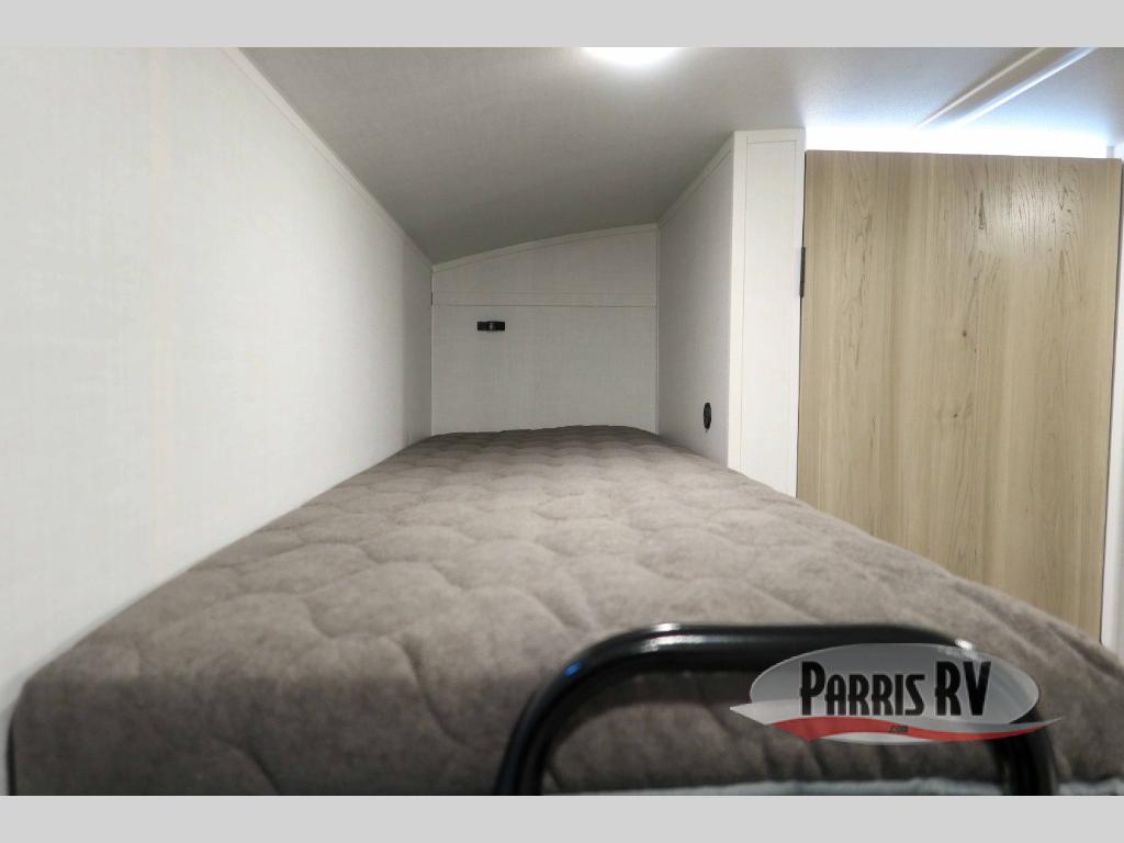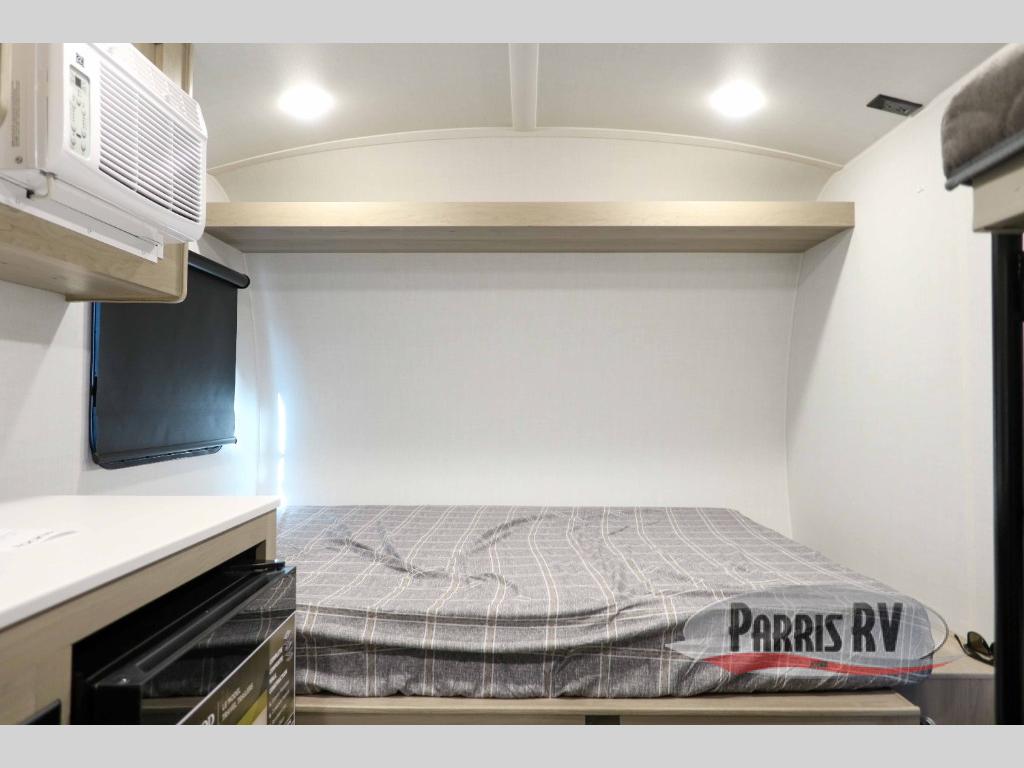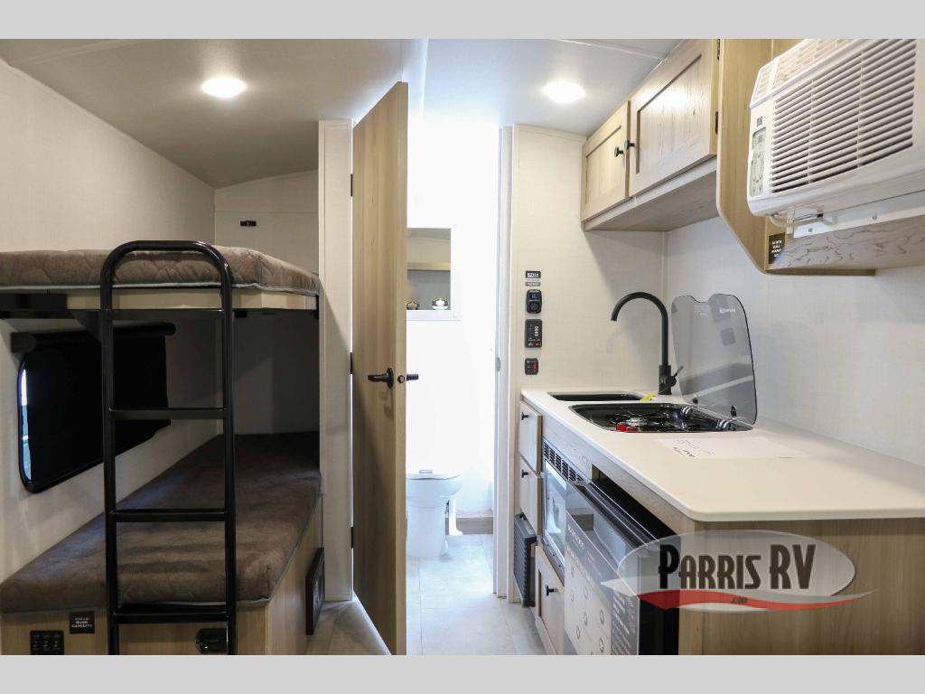 Perfect for couples, families, or friends, this trailer offers a comfortable and functional space to relax, recharge, and explore. The full bathroom is a serene retreat, equipped with everything you need to refresh and rejuvenate after a day of adventure. The two bunk beds give a snug and inviting sleeping spot, perfect for kids or adults looking for a cozy spot to rest. The kitchen is equipped with a microwave for quick and easy meal prep, and a fridge to keep your favorite snacks and drinks fresh. Overhead cabinets provide plenty of storage for your gear, cookware, and essentials, keeping your trailer tidy and organized. The bed offers a restful sleeping space, perfect for unwinding after a long day of exploring.