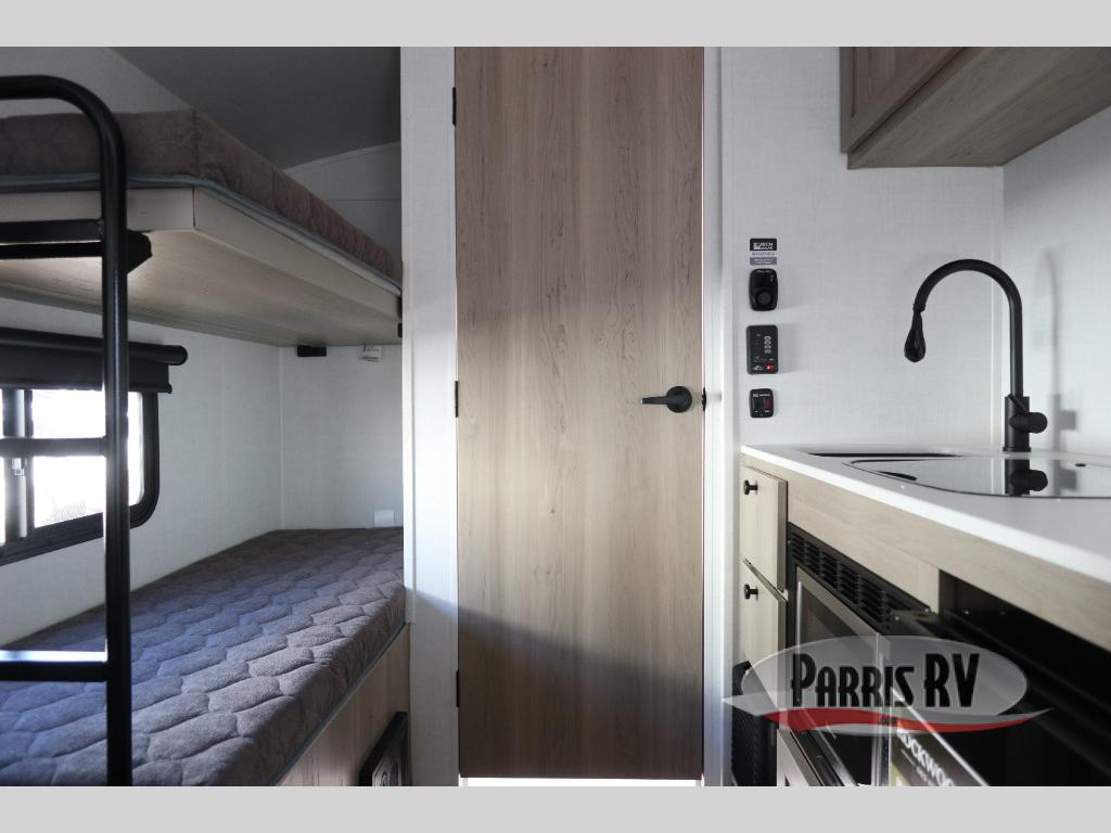Perfect for couples, families, or friends, this trailer offers a comfortable and functional space to relax, recharge, and explore. The full bathroom is a serene retreat, equipped with everything you need to refresh and rejuvenate after a day of adventure. The two bunk beds give a snug and inviting sleeping spot, perfect for kids or adults looking for a cozy spot to rest. The kitchen is equipped with a microwave for quick and easy meal prep, and a fridge to keep your favorite snacks and drinks fresh. Overhead cabinets provide plenty of storage for your gear, cookware, and essentials, keeping your trailer tidy and organized. The bed offers a restful sleeping space, perfect for unwinding after a long day of exploring.
