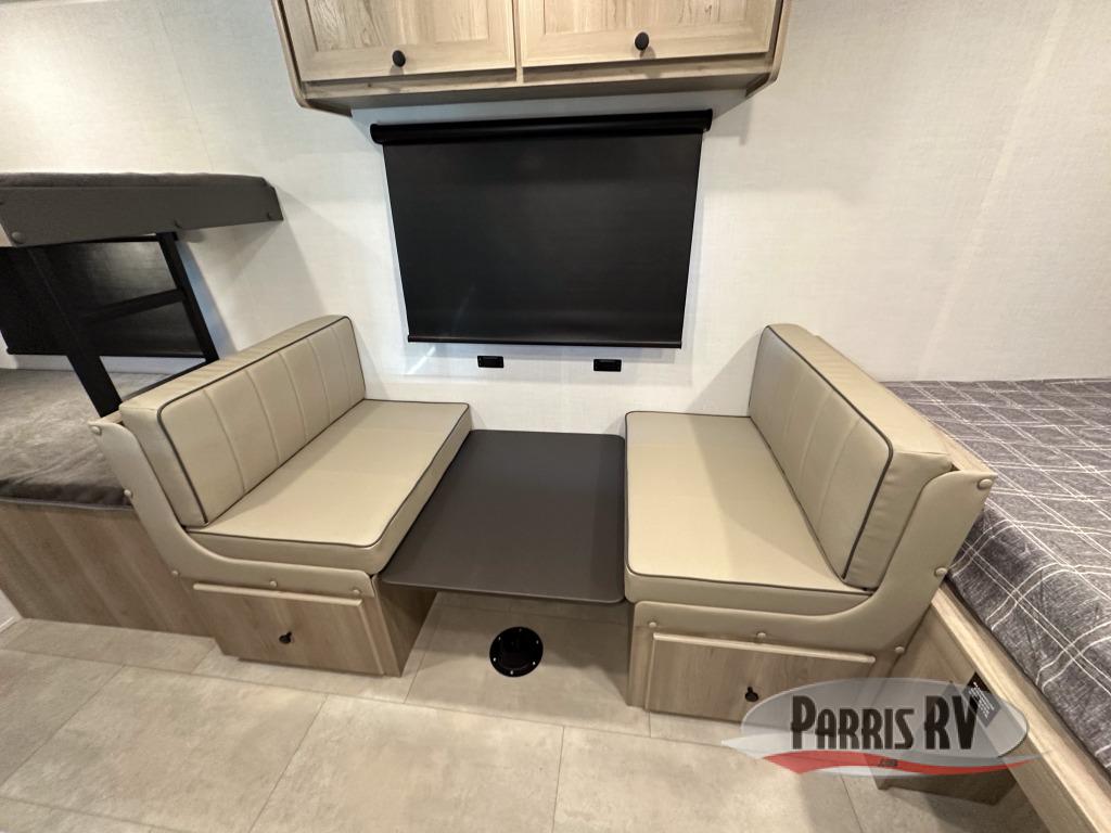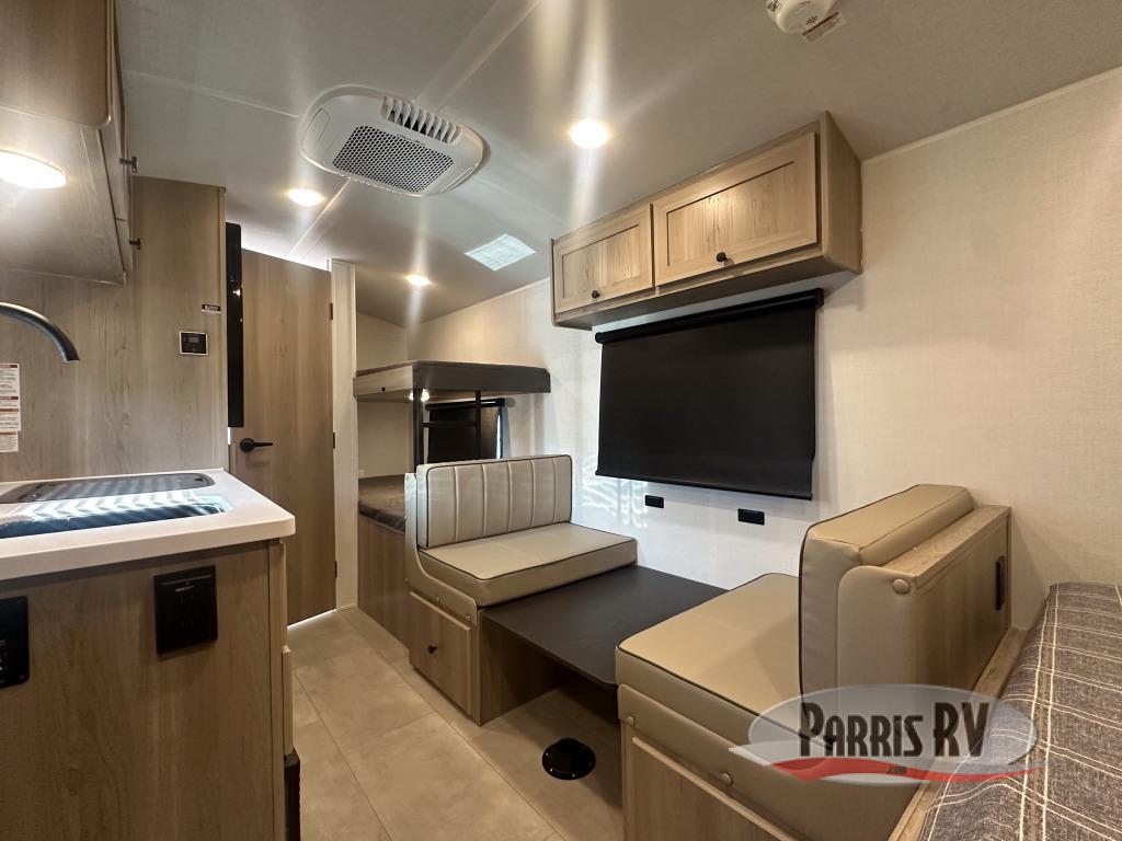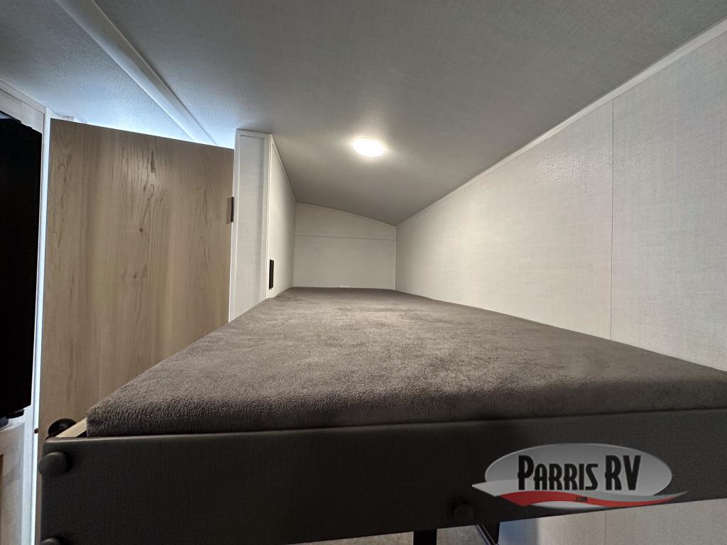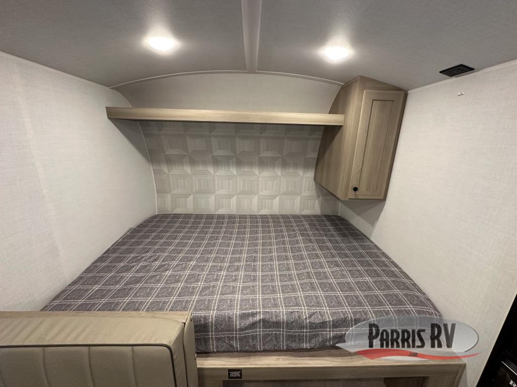 When you enter this compact but mighty trailer, you’re greeted by a comfortable 54" x 80" full bed at the front, complete with a shelf and wardrobe to keep your clothing and essentials neatly organized. To one side sits a cozy 32" dinette, perfect for enjoying a meal or playing a board game after a day of exploring. Across from it, the well-equipped kitchen includes a sink, microwave, and refrigerator everything you need to quickly whip up a meal. One rear corner houses a convenient bathroom with a shower and toilet, giving you the comfort of home without relying on campsite facilities. In the opposite corner, 30" x 74" double bunks provide extra sleeping space so more guests can join the adventure.