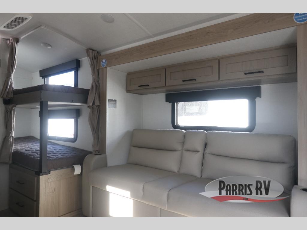 You're going to love camping with your family or friends in this spacious bunk model! The bunk beds will be perfect for little ones, while you take the front full-size bed. There is also a 44" booth dinette within the slide out for additional sleeping and seating space. The kitchen includes everything the chef will need to prepare meals each day, including a recessed cooktop, microwave oven, and a 12V refrigerator for perishables. If the weather is nice, you may just go outside and relax under the 14' power awning. And check out the exterior storage that will be perfect for luggage, or extra camp gear.