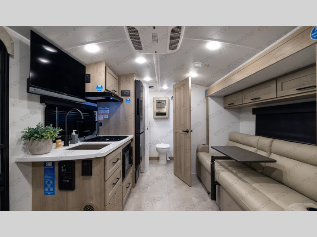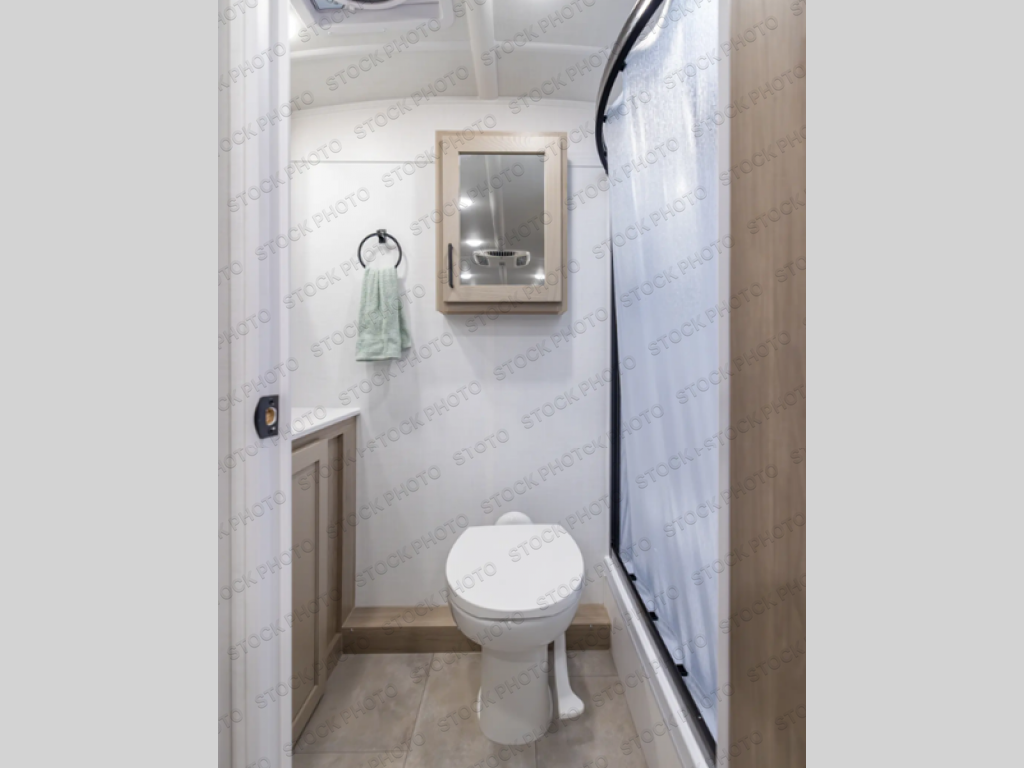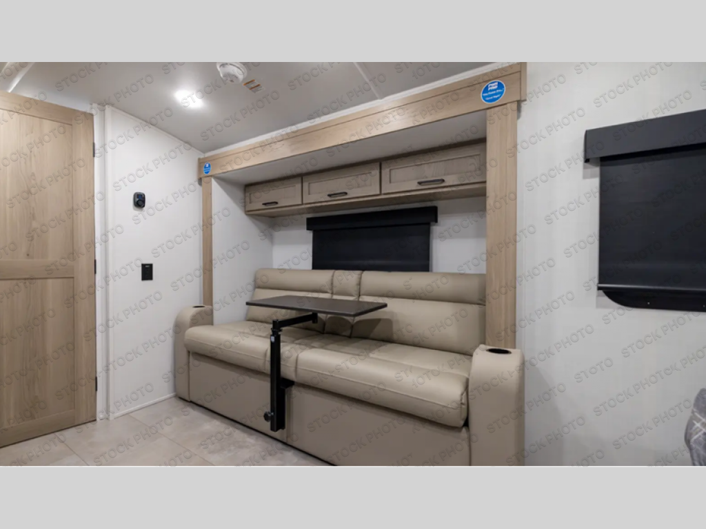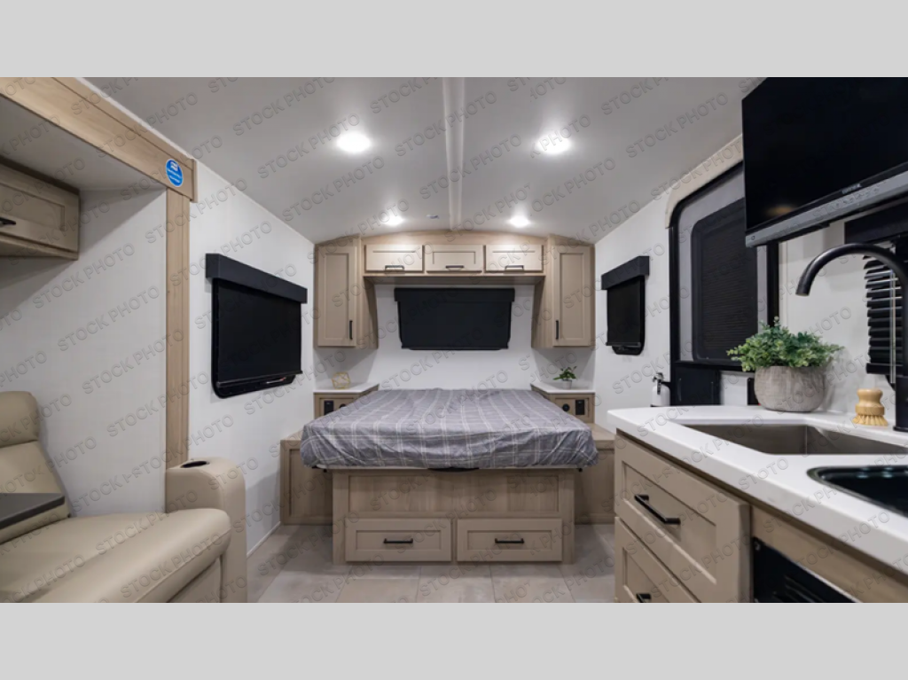 This travel trailer will feel more like home with its front bedroom and walk-around full-size bed. You'll enjoy the 12V TV as you relax on the 72" sofa with a table and cupholders. The full rear bath includes a spacious shower to clean up in each day and there is a linen closet for clean towels. When you're ready to prepare dinner you'll have a three burner cooktop and microwave oven indoors! And don't forget the exterior storage allows you to bring along beach toys and tackle boxes. The optional Power Package available on this model includes three 200W solar panels, a side solar plug-in, a 3kW 160A inverter, and more off-grid features!