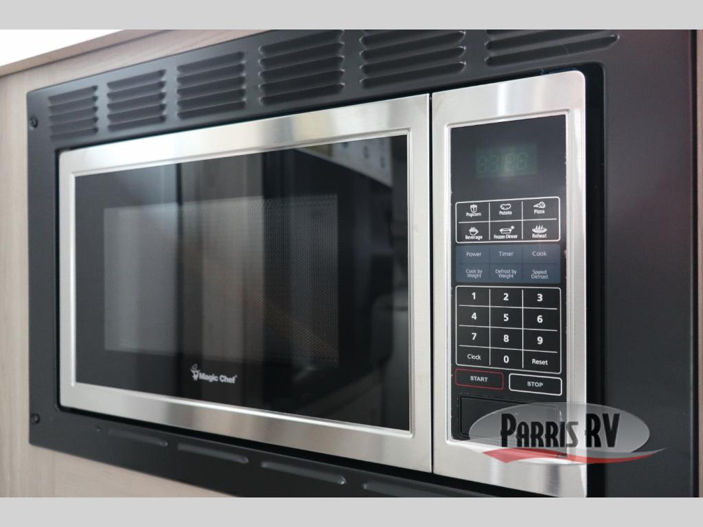 Are you looking for a lightweight trailer with at-home comforts? Take a look at this single slide out unit that can sleep three to four each night. There is a queen-size bed in the back with a 26" x 80" flip-up bunk for cozy sleeping space, a 72" sofa with cupholders to relax on, plus a 12V TV for movie nights! The front kitchen includes a 12V refrigerator to store food, plus a microwave oven and a gas oven to cook meals each day.