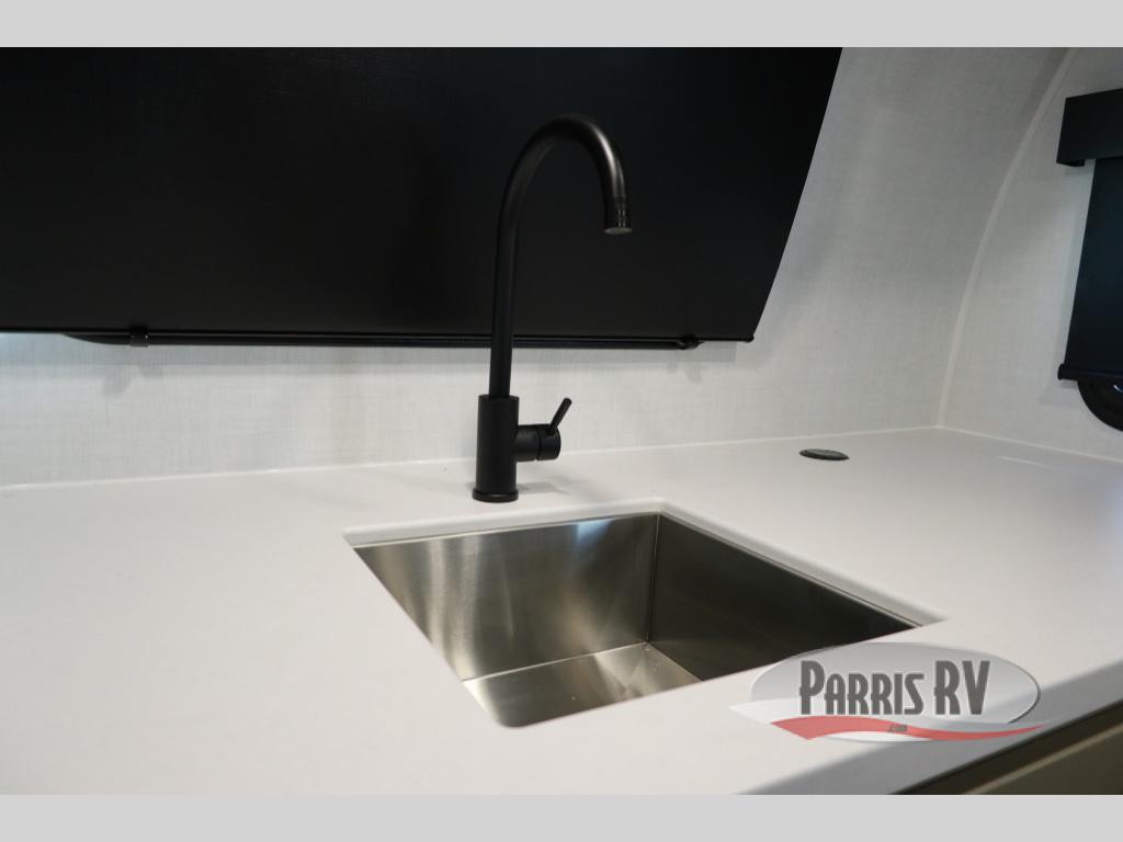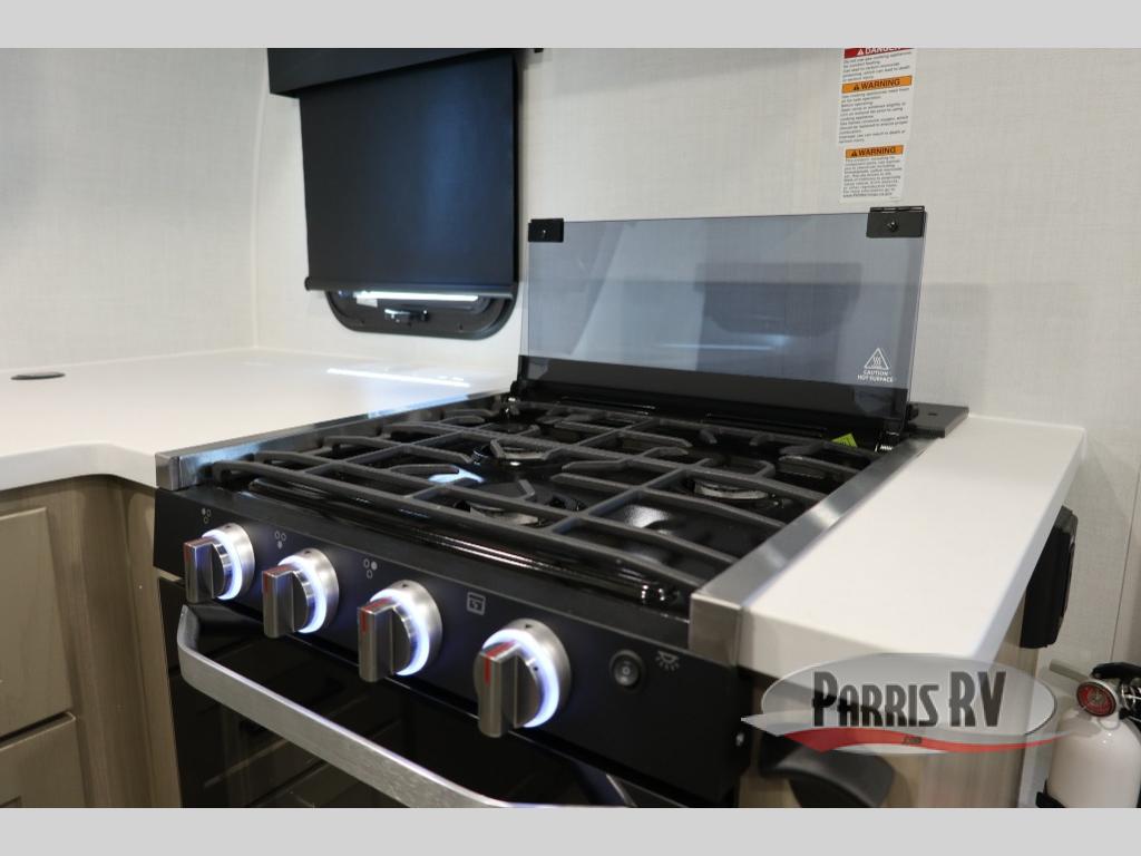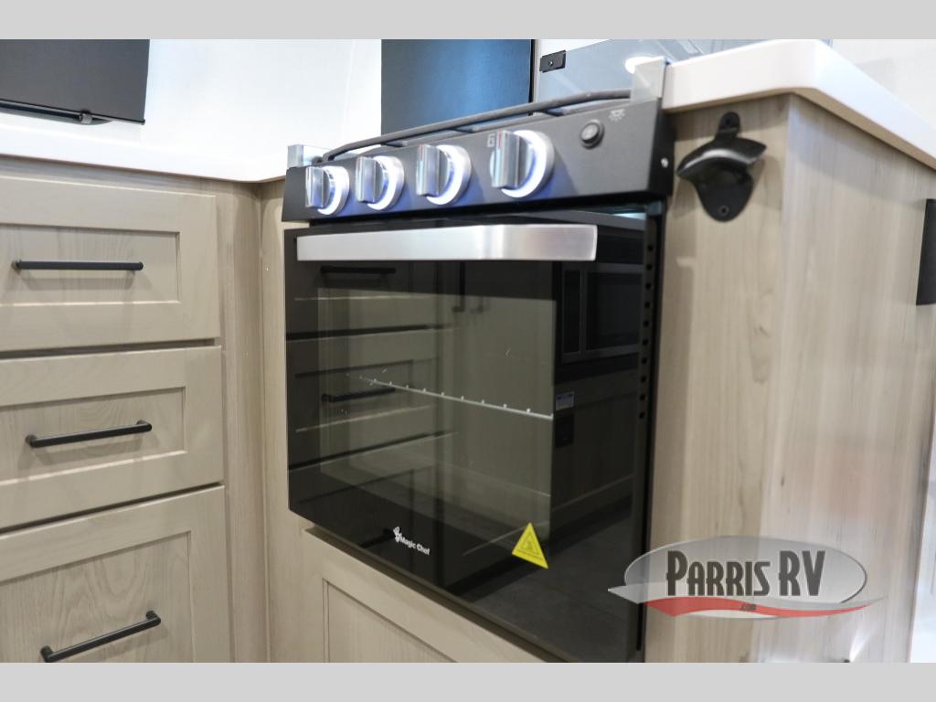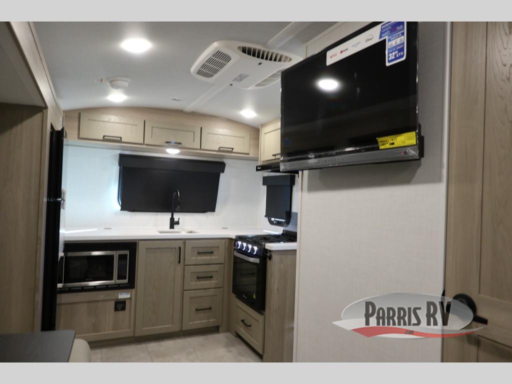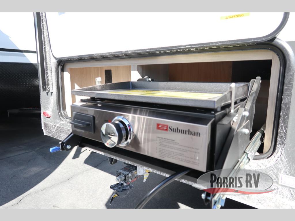 Are you looking for a lightweight trailer with at-home comforts? Take a look at this single slide out unit that can sleep three to four each night. There is a queen-size bed in the back with a 26" x 80" flip-up bunk for cozy sleeping space, a 72" sofa with cupholders to relax on, plus a 12V TV for movie nights! The front kitchen includes a 12V refrigerator to store food, plus a microwave oven and a gas oven to cook meals each day.