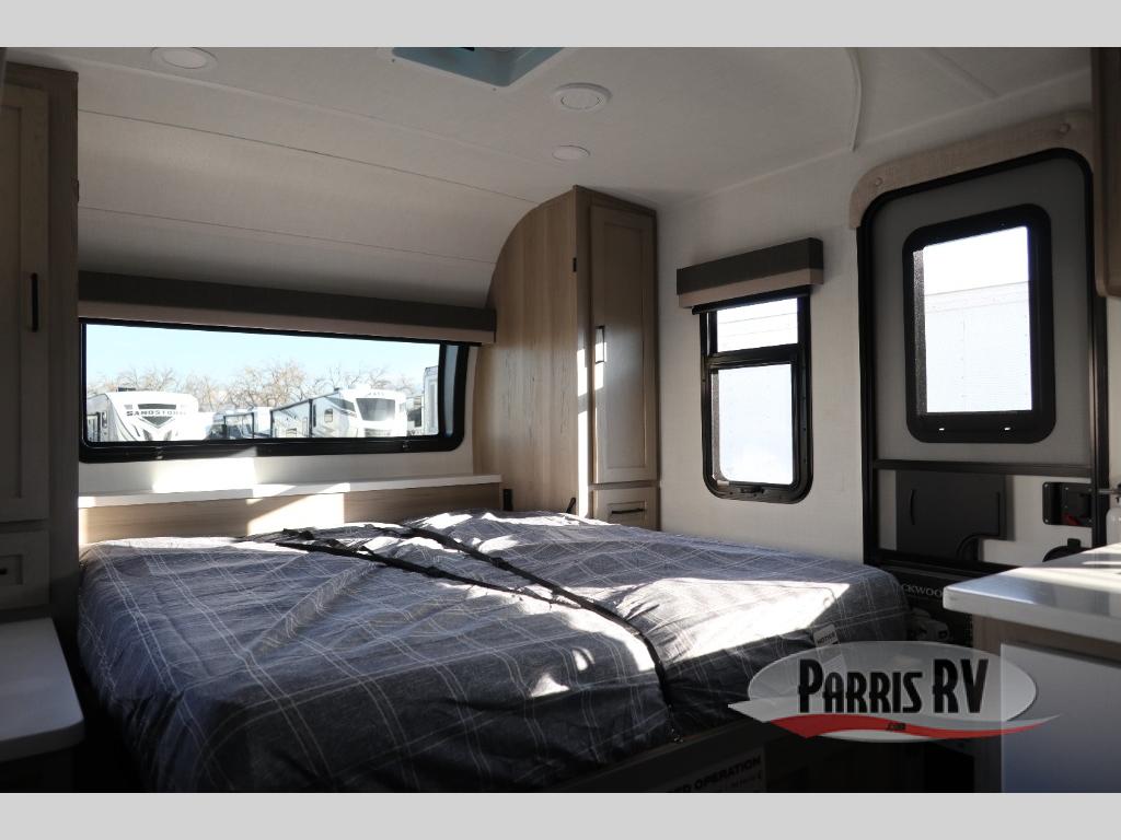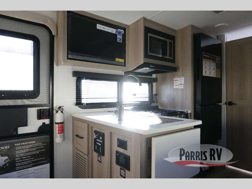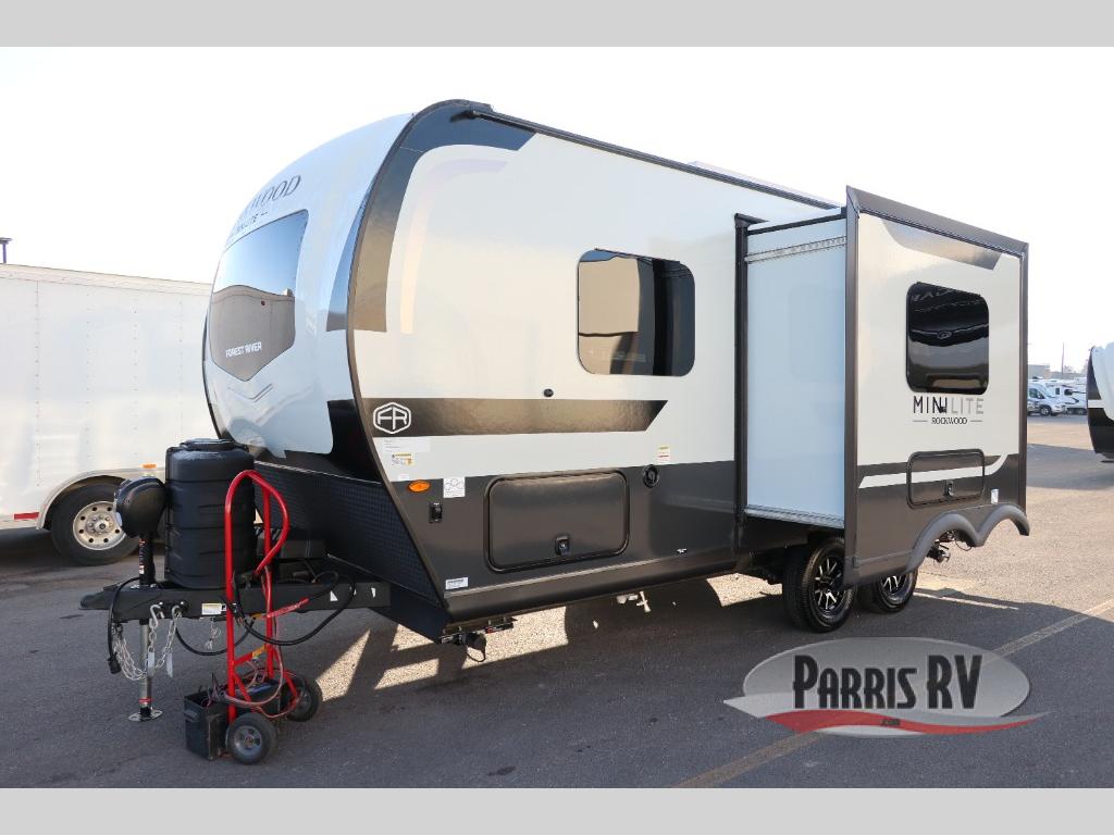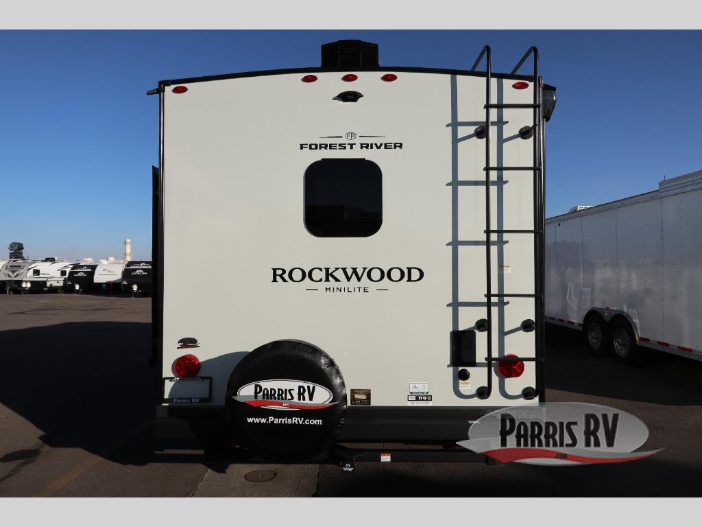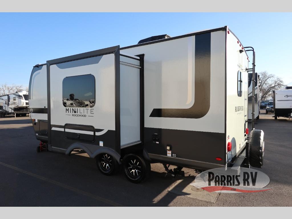 Each Rockwood Mini Lite travel trailer by Forest River is constructed with a fully laminated one-piece walkable roof, sleek frameless windows, and a six-sided full aluminum frame for strength and durability. The 12V thermostatically controlled heated tanks, plus radiant foil in the underbelly will allow you to camp well into the colder months, and the 200W roof solar panel will be perfect for a little off-gridding. Each model includes solid surface kitchen countertops, hidden hinge cabinet doors, roller shades, plus many more interior features. Having an AIR 360+ omnidirectional antenna with WiFi prep on board gives you the option to get some work done if it's needed, and the power tongue jack provides hassle-free set up, so you can enjoy more time relaxing!