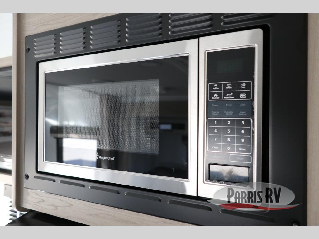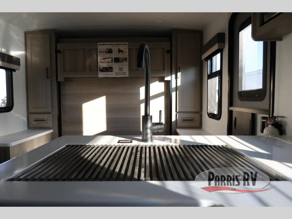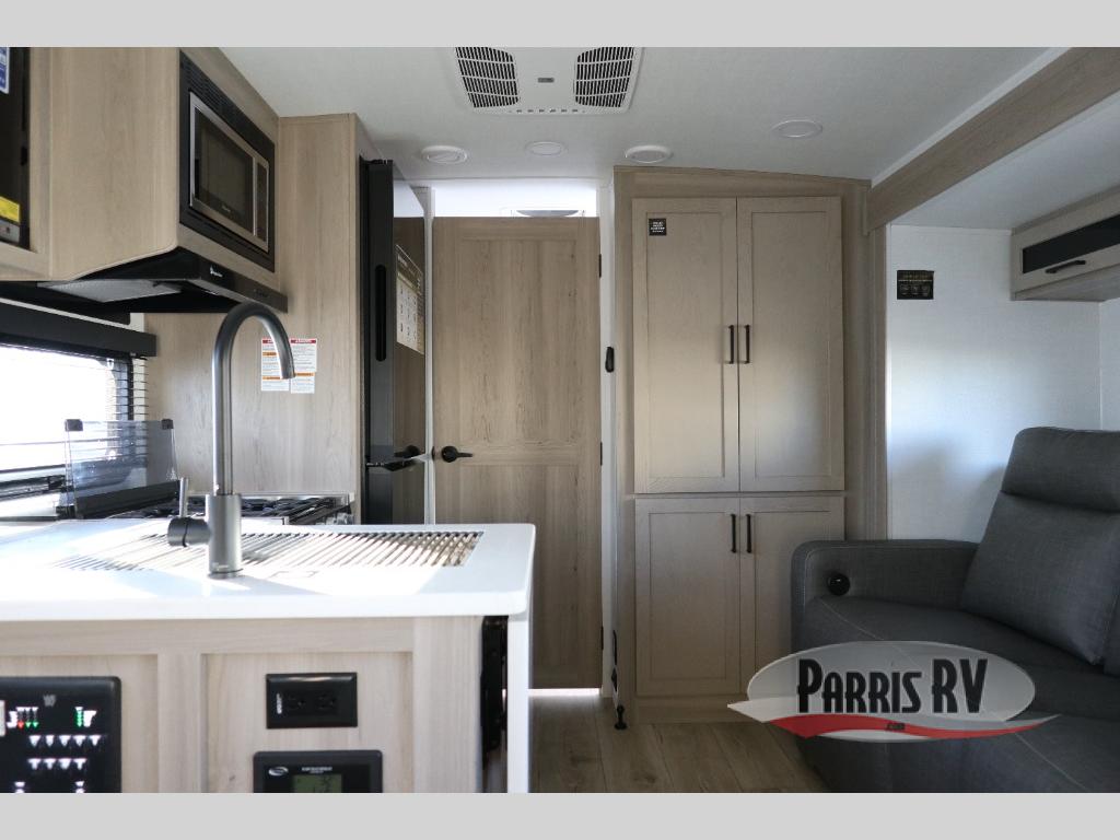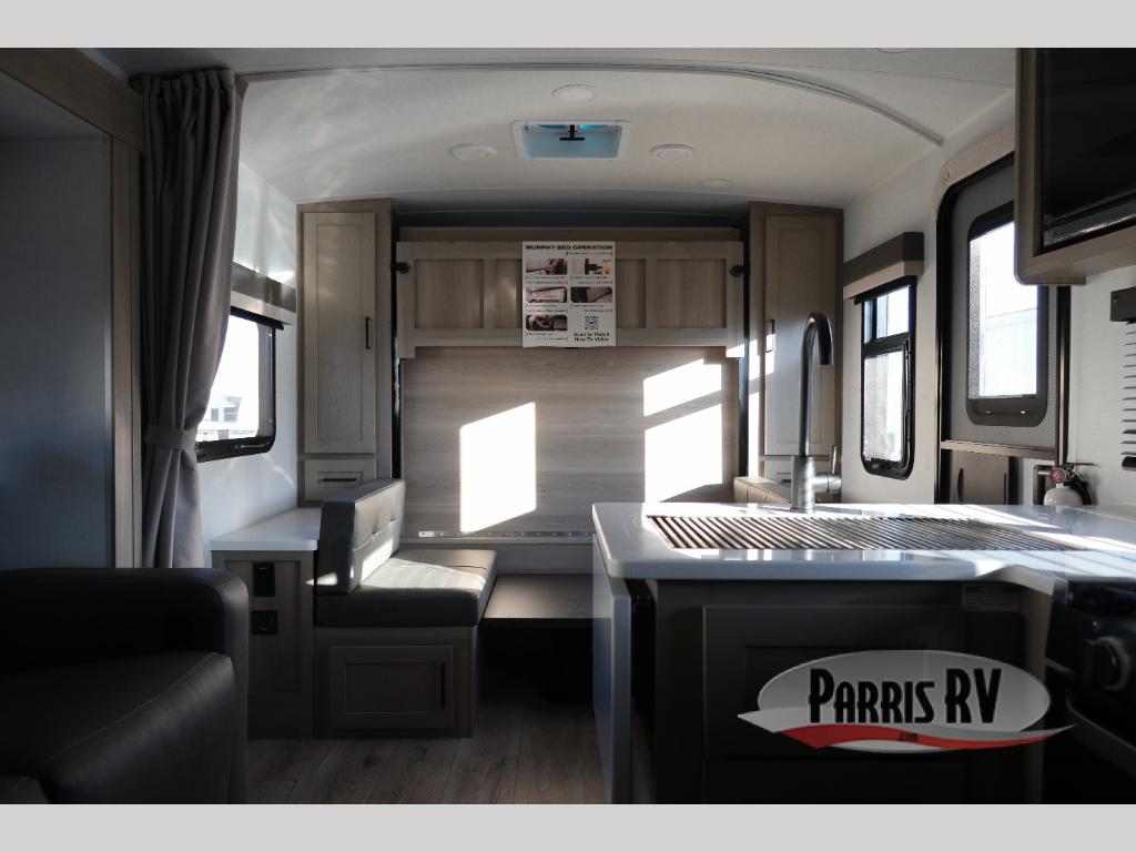 This versatile travel trailer is perfect for weekend camping trips to your favorite park! Once you arrive at your site, you can unload the pass-thru storage, then put out the 15' power awning and relax in your camp chairs. The cooktop and microwave inside will let you make lunch when you get hungry, and there is a theater seat slide out if you want a comfy place to relax. There is also a 30" x 80" booth dinette up front where you can dine together and play games in the evenings, and when you're ready for bed, the 60" x 74" Murphy bed can be folded down over the dinette. This unit includes plenty of storage spaces, including dual bedside wardrobes, a kitchen pantry, and a linen closet in the full rear bath!
