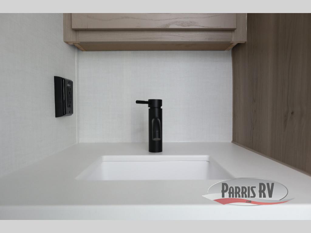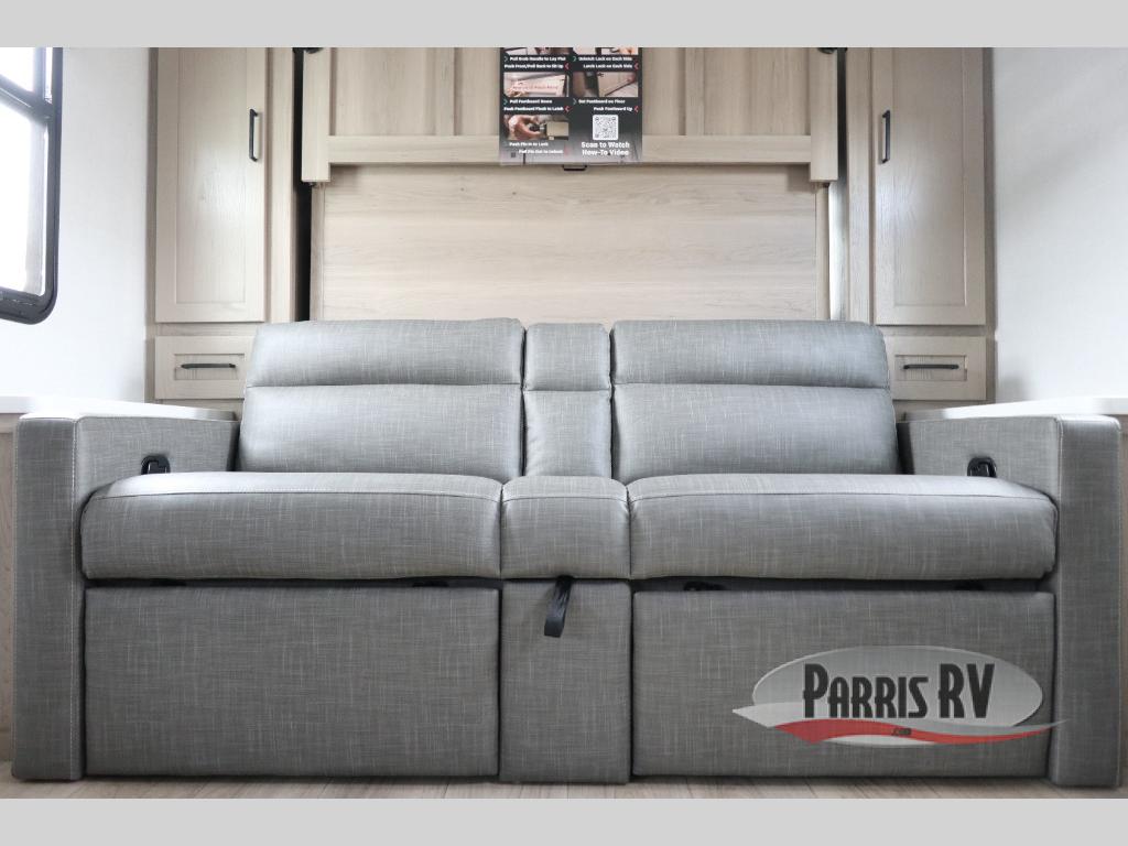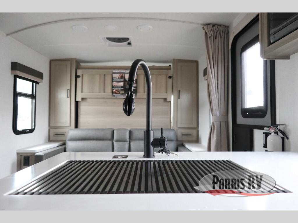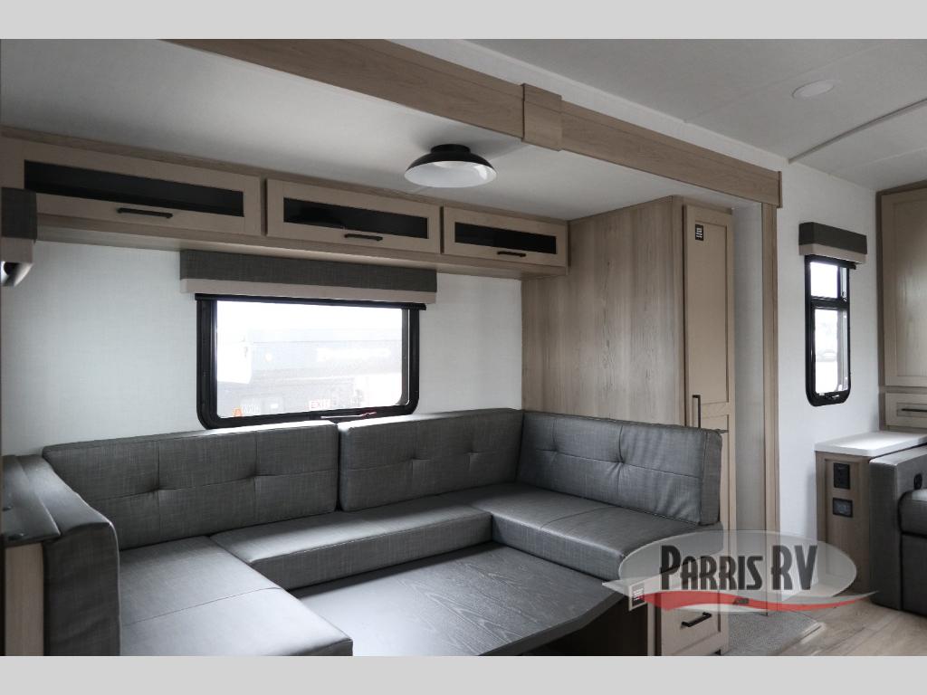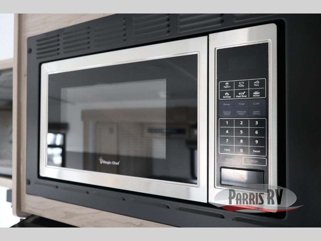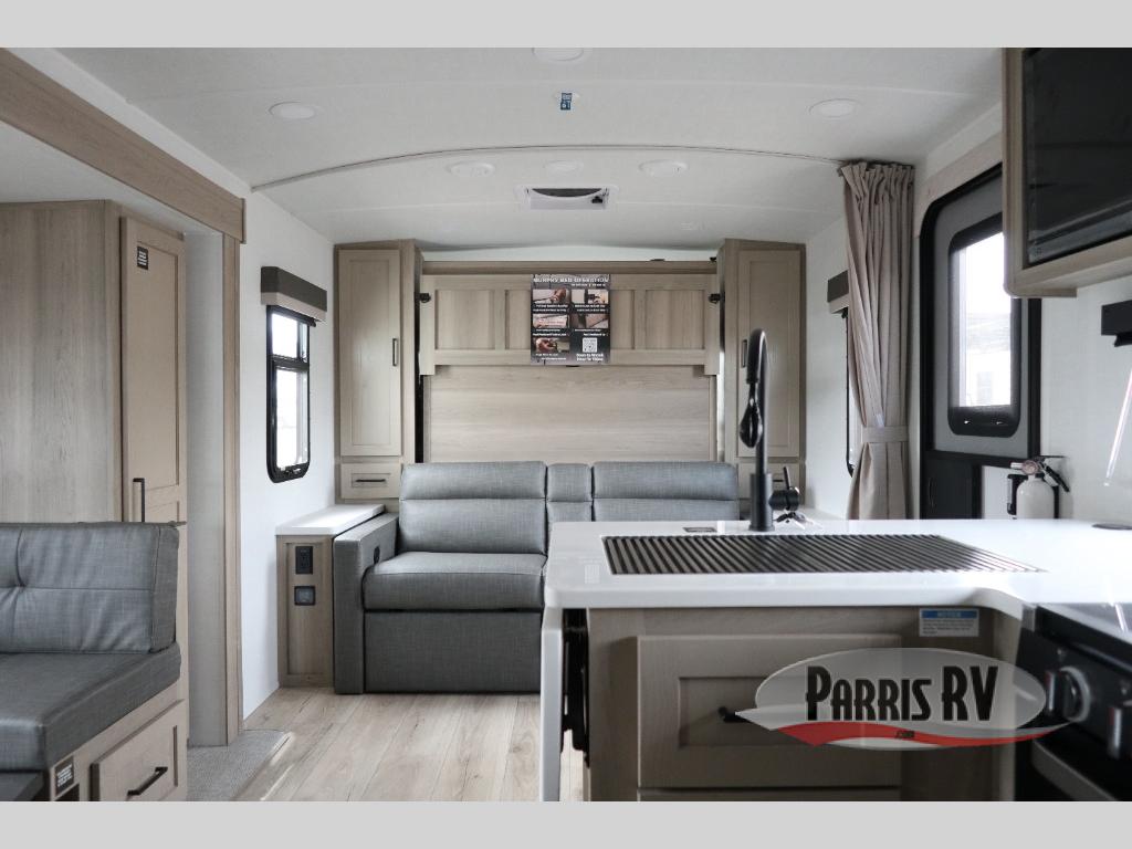 This versatile and cozy travel trailer will be perfect for weekend trips to the lake. Once you arrive at your campground, you can unload the water toys from the pass-thru storage, put out the 15' power awning, then make lunch on the exterior griddle. The U-shaped dinette slide inside will provide a place to dine, play board games, and let a guest or two sleep over, while you take the RV queen-size Murphy bed up front. In the morning, just fold up the bed to expose the 74" sofa! There is a three burner cooktop and microwave oven in the kitchen to make meals each day, along with a 12V refrigerator to keep leftovers fresh.