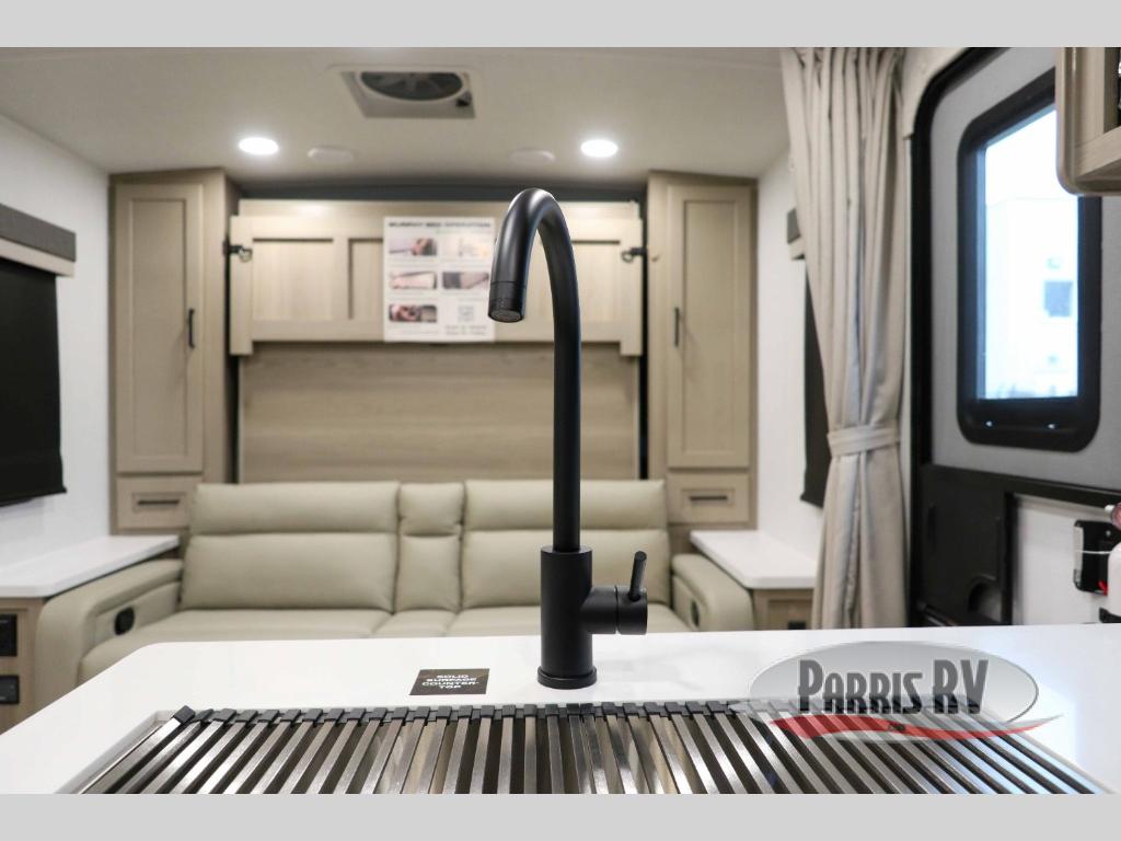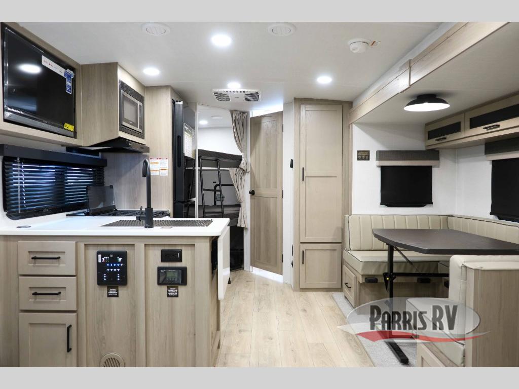 Finally, a lightweight travel trailer with double-size bunks for the kids or your guests! You'll find the versatile Murphy bed up front will be super convenient when you need more space to move around, and the 72" sofa will provide comfy seating space when the bed is put up. This model also includes a U-shaped dinette slide perfect to dine around, play games, and sleep additional guests. A 32" TV in the main living area will allow you to watch your favorite shows in the evenings, or you may just find yourselves outdoors under the 18' power awning with LED lights. And check out the pass-through storage, plus additional exterior storage for your hiking gear!