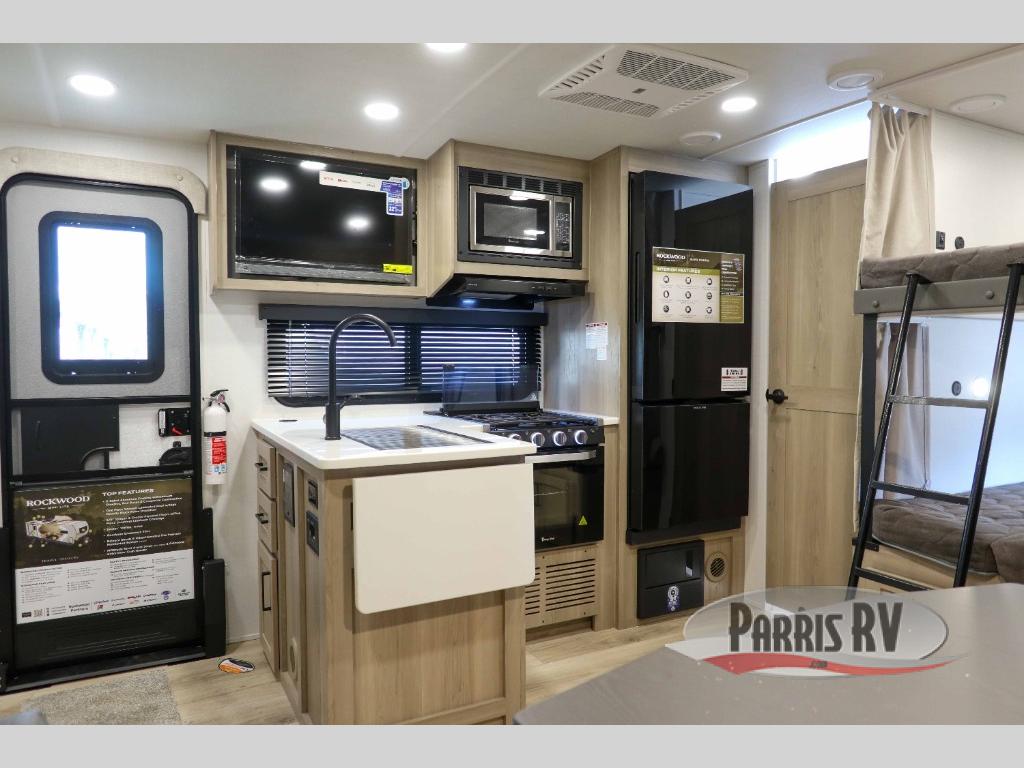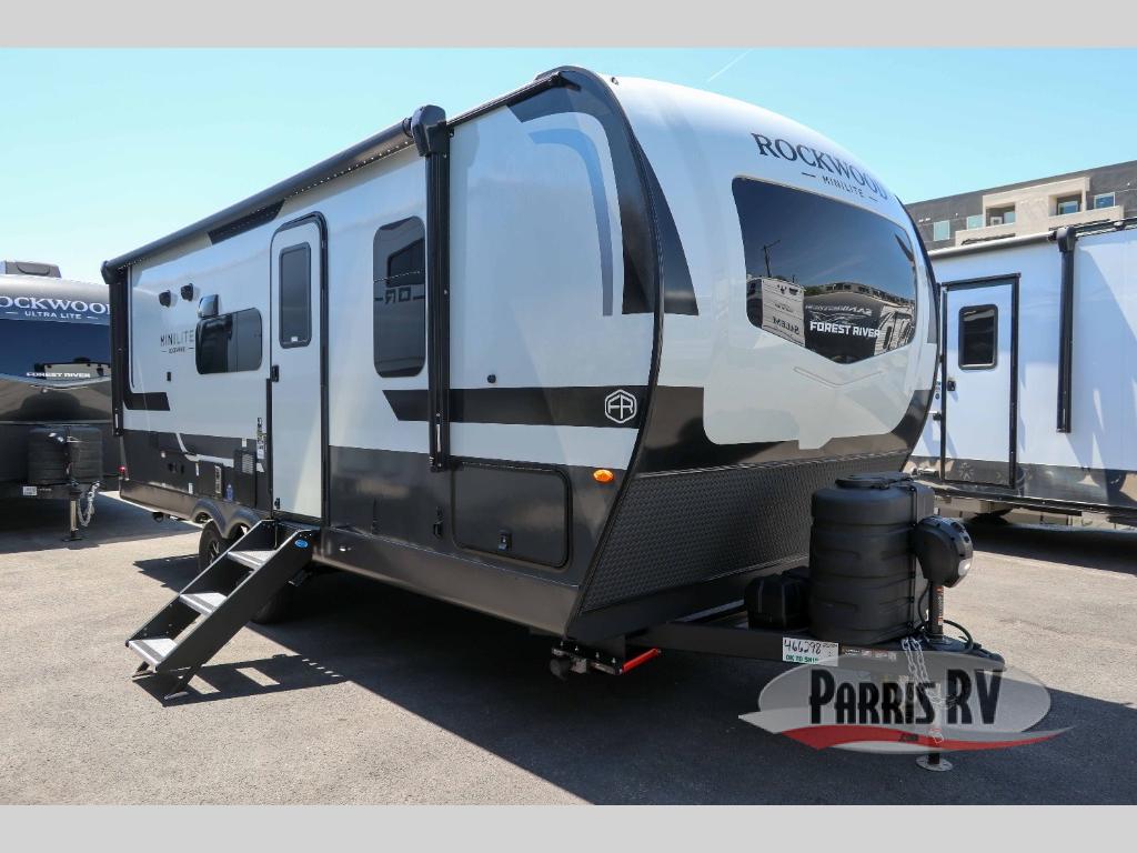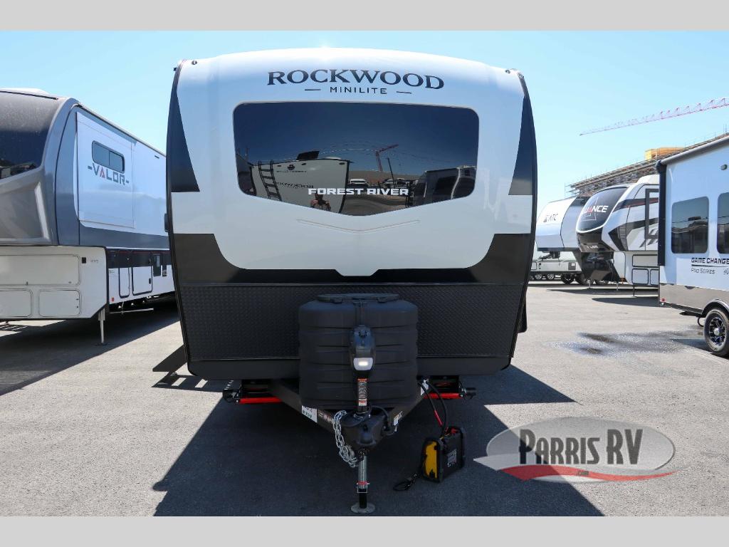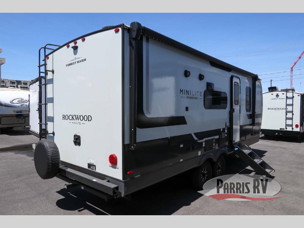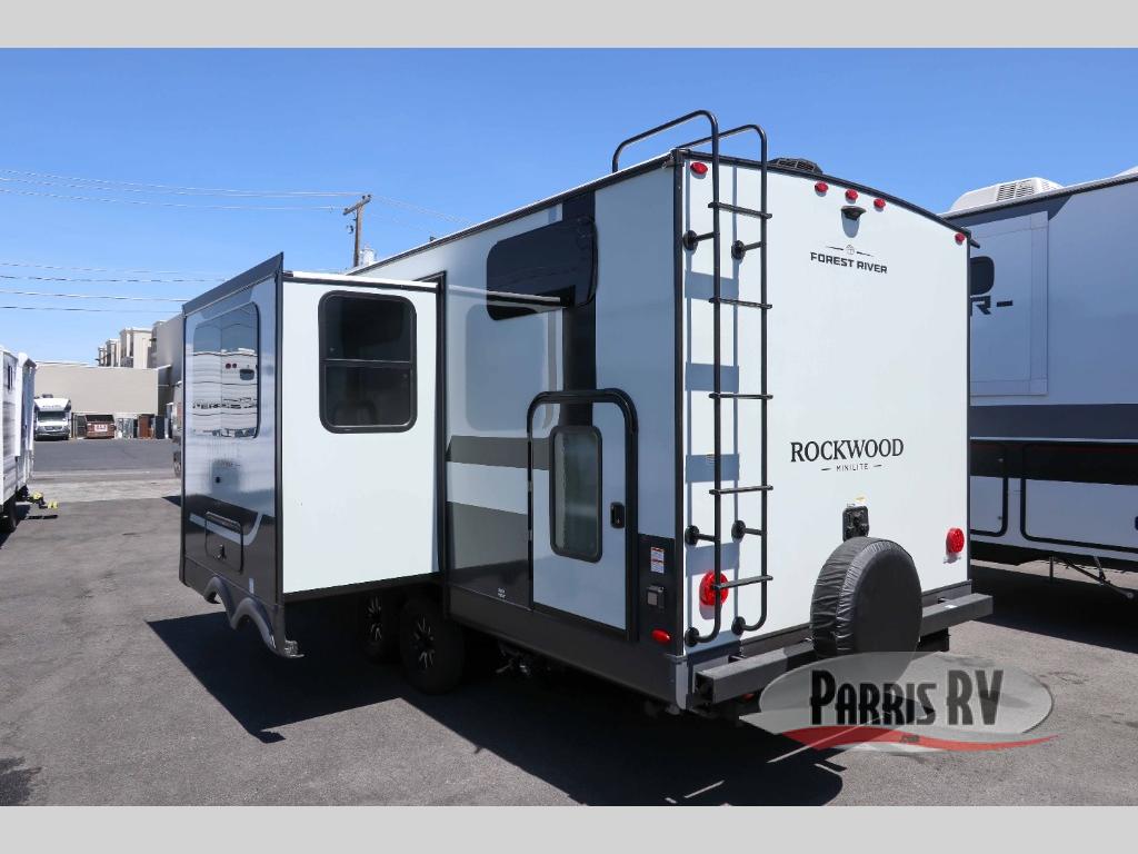 Each Rockwood Mini Lite travel trailer by Forest River is constructed with a fully laminated one-piece walkable roof, sleek frameless windows, and a six-sided full aluminum frame for strength and durability. The 12V thermostatically controlled heated tanks, plus radiant foil in the underbelly will allow you to camp well into the colder months, and the 200W roof solar panel will be perfect for a little off-gridding. Each model includes solid surface kitchen countertops, hidden hinge cabinet doors, roller shades, plus many more interior features. Having an AIR 360+ omnidirectional antenna with WiFi prep on board gives you the option to get some work done if it's needed, and the power tongue jack provides hassle-free set up, so you can enjoy more time relaxing!