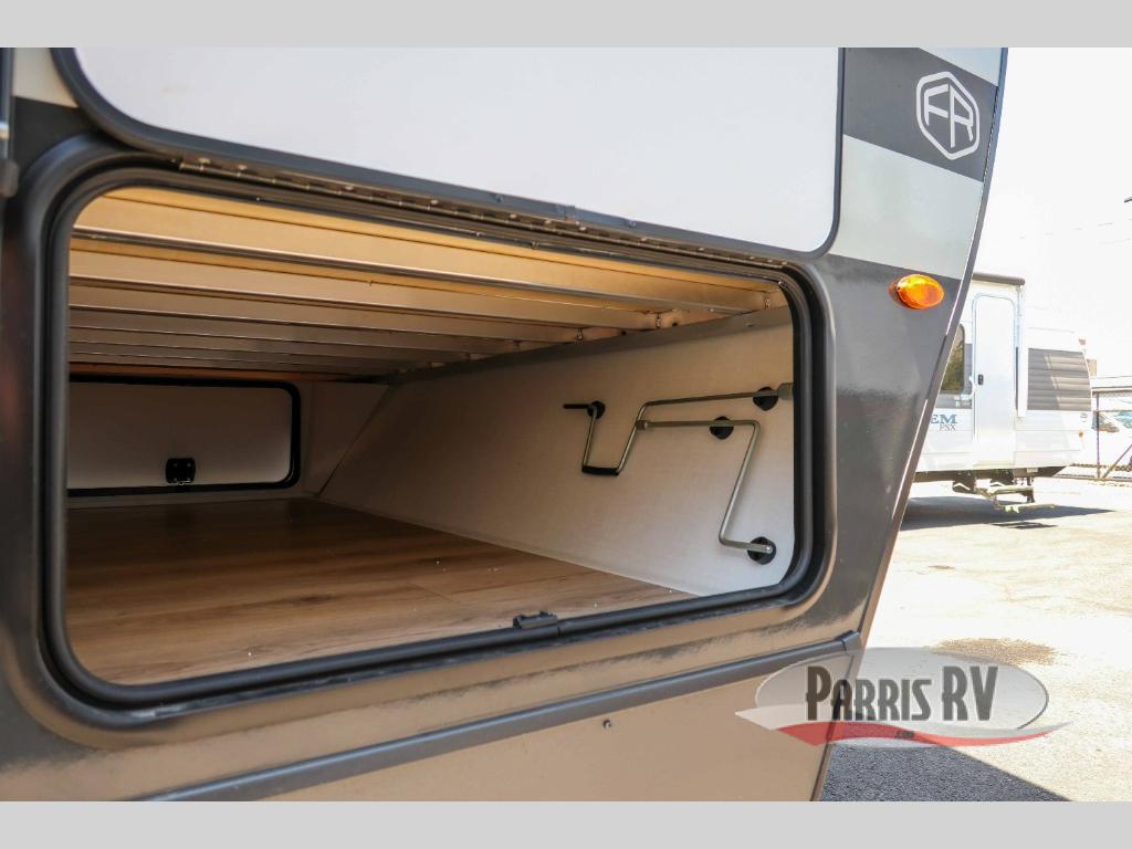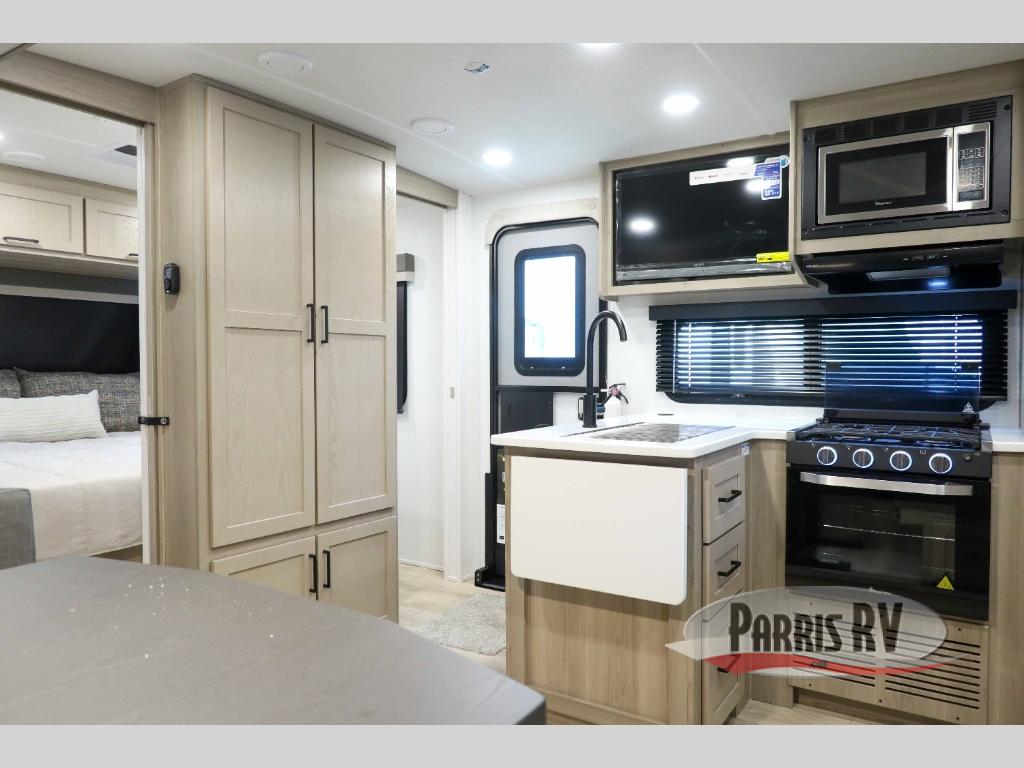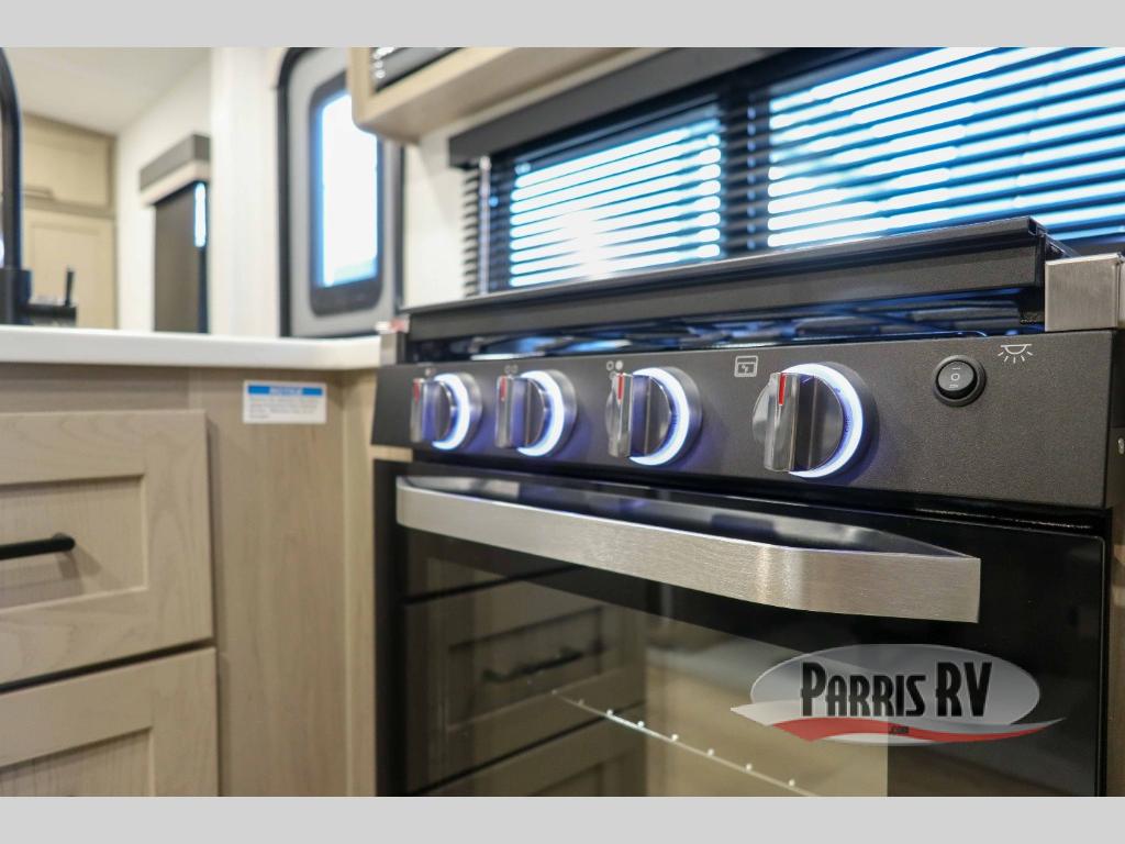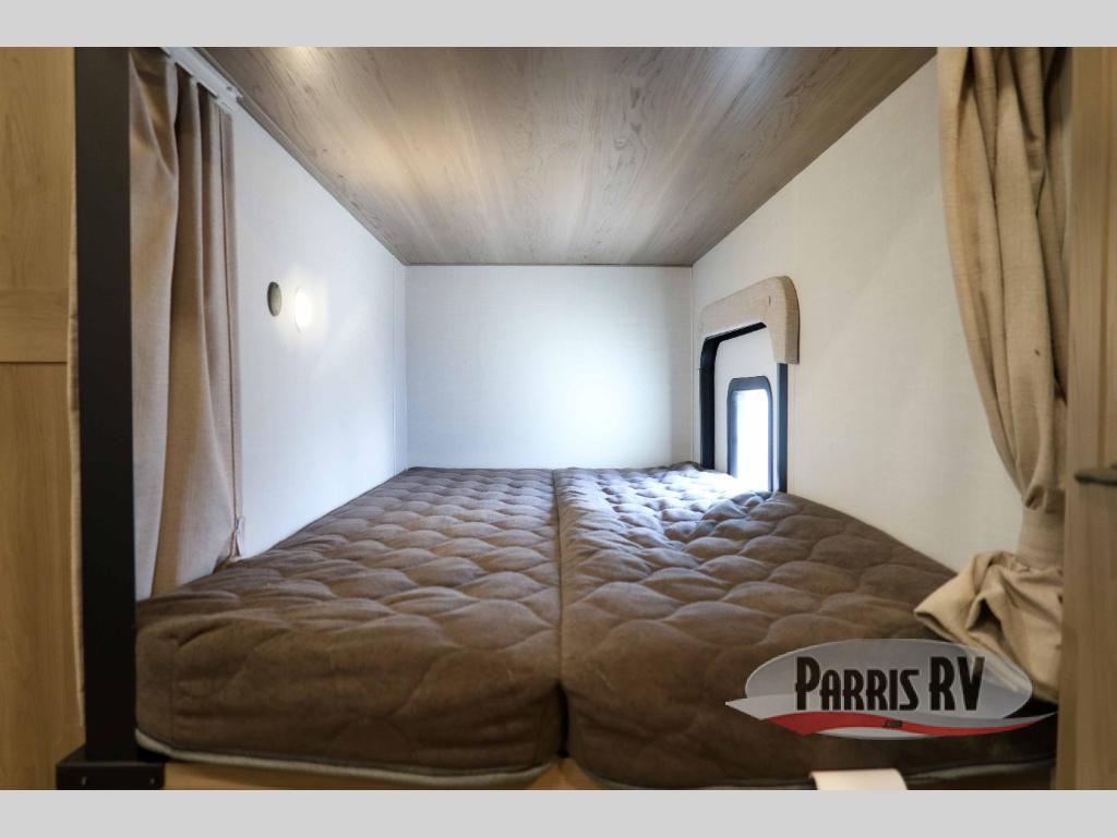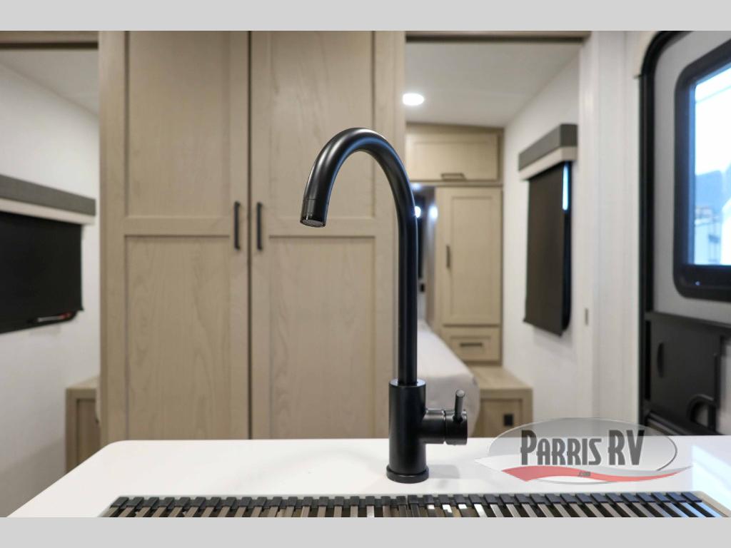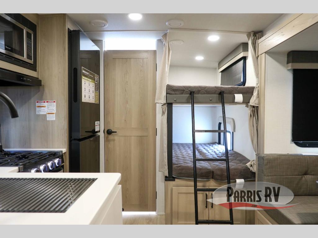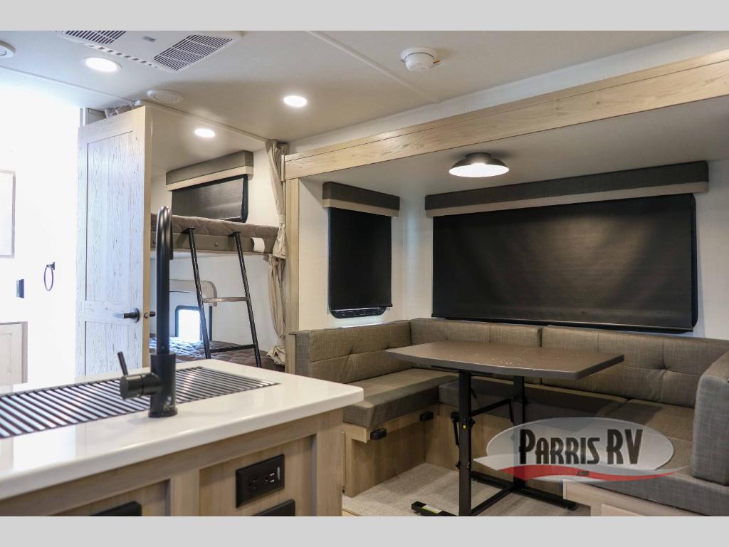 This bunkhouse model is perfect for your crew of six! You will appreciate the exterior bike door that lets you store gear under the flip-up bottom bunk, plus there is a pass-thru storage up front for even more storage. The RV queen bed in the front bedroom includes flip-up storage, two wardrobes, and a TV option if you like to stay up late with a movie. In the morning, everyone can meet in the combined kitchen and living area to dine around the U-shaped dinette, or you can take your plate outdoors to sit under the 18' power awning with LED lights. This model also includes an exterior griddle for a pancake breakfast!