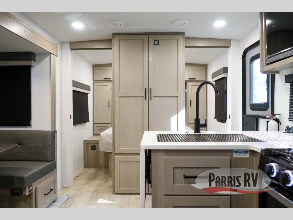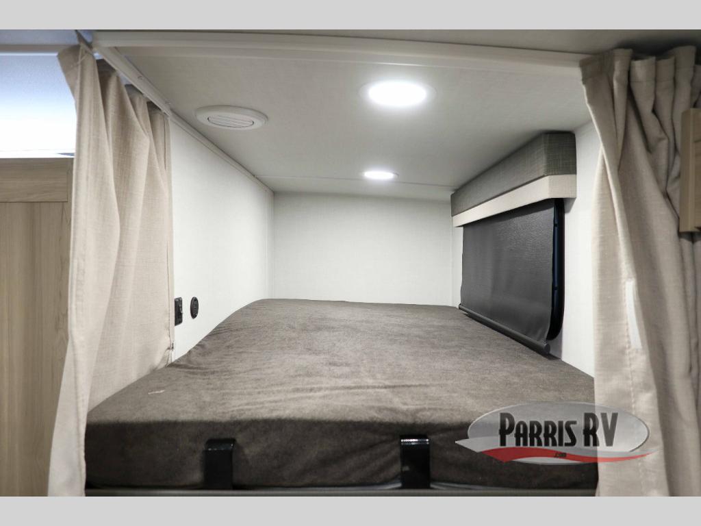 This bunkhouse model is perfect for your crew of six! You will appreciate the exterior bike door that lets you store gear under the flip-up bottom bunk, plus there is a pass-thru storage up front for even more storage. The RV queen bed in the front bedroom includes flip-up storage, two wardrobes, and a TV option if you like to stay up late with a movie. In the morning, everyone can meet in the combined kitchen and living area to dine around the U-shaped dinette, or you can take your plate outdoors to sit under the 18' power awning with LED lights. This model also includes an exterior griddle for a pancake breakfast!