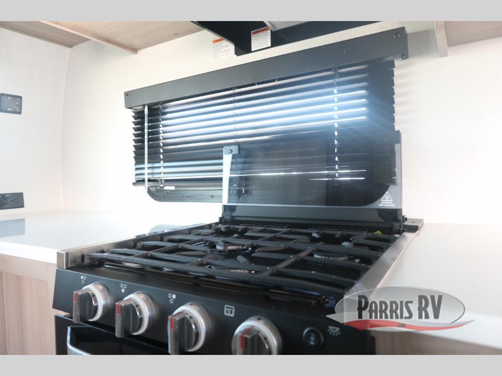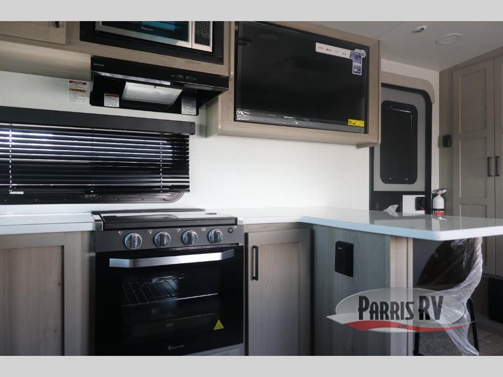 This travel trailer is the best option for you and your partner! The lavish full rear bathroom features a spacious layout and a convenient linen closet, perfect for relaxation and refreshment. The elegant bedroom boasts a plush queen bed, ample wardrobe space, and stylish dresser, creating a serene retreat. The spacious living room and kitchen combined area is the heart of the trailer, featuring plush theater seating for cozy movie nights, a generous closet for storing essentials, and a 12V Smart TV for entertainment on the go. Plus, the expansive countertop with chairs provides a perfect spot for gourmet meals or socializing, while the premium three-burner cooktop, well-stocked kitchen pantry, and high-performance microwave make meal prep and cooking a true delight.