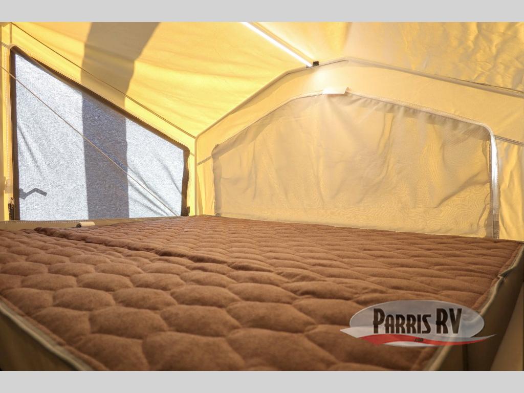 Your family will love this spacious travel trailer that can sleep up to nine people each night. There are triple queen tent end beds, a U-shaped king dinette, plus a flip-up sofa for comfortable sleeping space. The chef of the group will have a 12V refrigerator and a pantry to store all the food. This model also includes convenient exterior storage for fishing poles, tackle boxes, and your luggage!