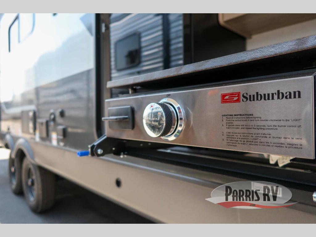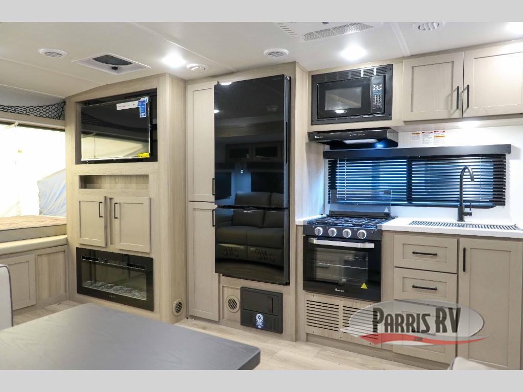 This expandable includes a large slide out that will make you feel right at home, so come take a look! The LED TV and fireplace is right across from the hide-a-bed sofa for easy viewing, and there is a booth dinette to dine together. The chef of the family can cook indoors on the three burner cooktop, or outdoors on the exterior griddle. Tuck your belongings in the overhead shelves, and snacks can go in the pantry. Don't forget about the exterior storage for your larger camp gear!